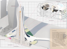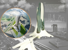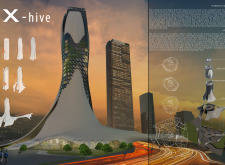 X-hive is located in 4. Levent, Istanbul, Turkey, an area marked by busy roads and tall buildings. The design is inspired by natural shapes, demonstrating a focus on sustainability and the relationship between the structure and its surroundings. The building features a central core enclosed in glass, surrounded by three opaque components. The concept aims to improve how people engage with their environment, creating a structure that feels alive and both functional and visually appealing.
