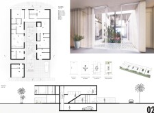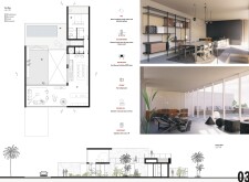 The design incorporates eco-friendly features such as photovoltaic panels for solar energy generation and rainwater recovery systems for efficient water management, minimizing energy consumption and ecological impact. Additionally, native landscaping not only reduces water usage but also promotes biodiversity, effectively bridging indoor and outdoor environments.