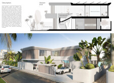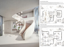 The design features a staggered facade composed of two main volumes, strategically oriented to maximize natural light while ensuring privacy. The layout prioritizes an open-plan configuration, fostering interaction within the living spaces. A notable feature is the double-height atrium that enhances natural ventilation, while a sculptural staircase functions as a central element, promoting fluid movement between levels. The ground floor includes a welcoming foyer, a spacious living area, and a flexible lounge that encourages relaxation and social engagement, all benefiting from ample natural illumination.