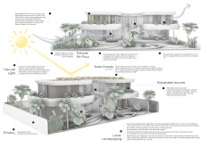 The project employs sustainable materials, such as low-carbon concrete incorporating recycled content, which reduces the overall environmental impact. High-performance glass is utilized for windows, enhancing thermal efficiency and minimizing heat gain. Timber slats add warmth and provide privacy while aesthetically complementing the overall design. Additionally, the landscaping features indigenous flora that promotes biodiversity and is designed with green roofs and terraced gardens that enhance energy efficiency and natural insulation. Smart home technologies are integrated throughout, enabling automated control of lighting, temperature, and security for improved energy conservation and user comfort.