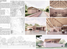 The architectural composition features three distinct structures arranged thoughtfully across a flat plateau, ensuring functional coherence while enhancing the visitor experience. The entrance area invites guests into the communal zones of the hospice, emphasizing accessibility and warmth. Therapy rooms are minimally furnished to promote tranquility, while flexible art studios accommodate a variety of creative activities, such as painting and pottery. This spatial configuration caters to individual therapeutic needs and fosters collaborative artistic expression.