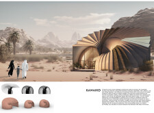 KAWAHID is an architectural project designed to address the unique challenges of the UAE's desert environment while prioritizing sustainable living. Located in a landscape characterized by arid conditions, the design seeks to create a harmonious relationship between its occupants and the ecosystem. The approach integrates functionality with aesthetic considerations, reflecting the cultural context of the region through its architectural language.