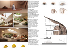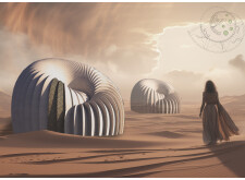 The project's spatial strategy is defined by a curvilinear form that echoes the natural contours of the desert. This design not only responds to environmental factors such as wind and thermal conditions but also incorporates elements of traditional Islamic architecture, fostering community through intricate patterns and forms. The adaptive interior layout prioritizes open and flexible spaces, allowing for multifunctional living arrangements that accommodate varying user needs.