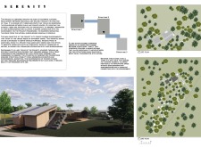 The Serenity project is located in a tranquil environment conducive to yoga and meditation practices. It seeks to enhance the relationship between users and their natural surroundings by reconfiguring public and private spaces. The design incorporates three principal structures that promote contemplation and relaxation, allowing individuals to engage deeply with their environment.