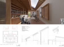 The design focuses on retaining the existing structure and integrating a new facade to improve the connection between inside and outside. A secondary wooden envelope wraps around the building, serving both aesthetic and practical purposes. This dynamic facade can adapt to environmental changes. Its modular design allows for elements that can pivot and fold, which helps control light and temperature inside the building.