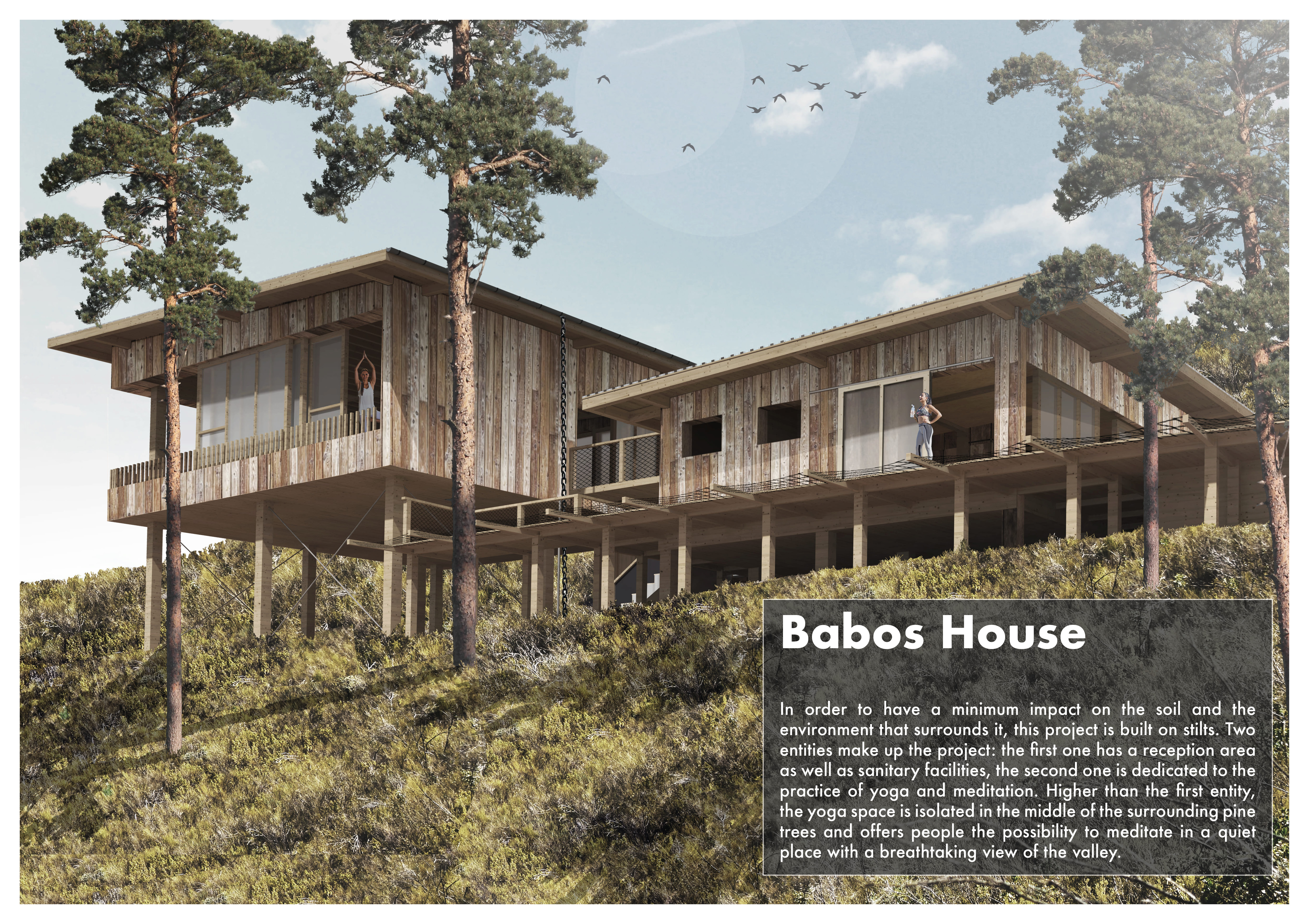 Babos House is a structure designed to coexist with its natural surroundings. Elevated on stilts, it reduces its environmental impact while providing essential spaces for reception, sanitary facilities, and areas devoted to yoga and meditation. The setting amidst tall pine trees highlights a commitment to sustainability and emphasizes the relationship between the built environment and nature. This design is crafted not just for functionality but also to enhance the daily experiences of its users.