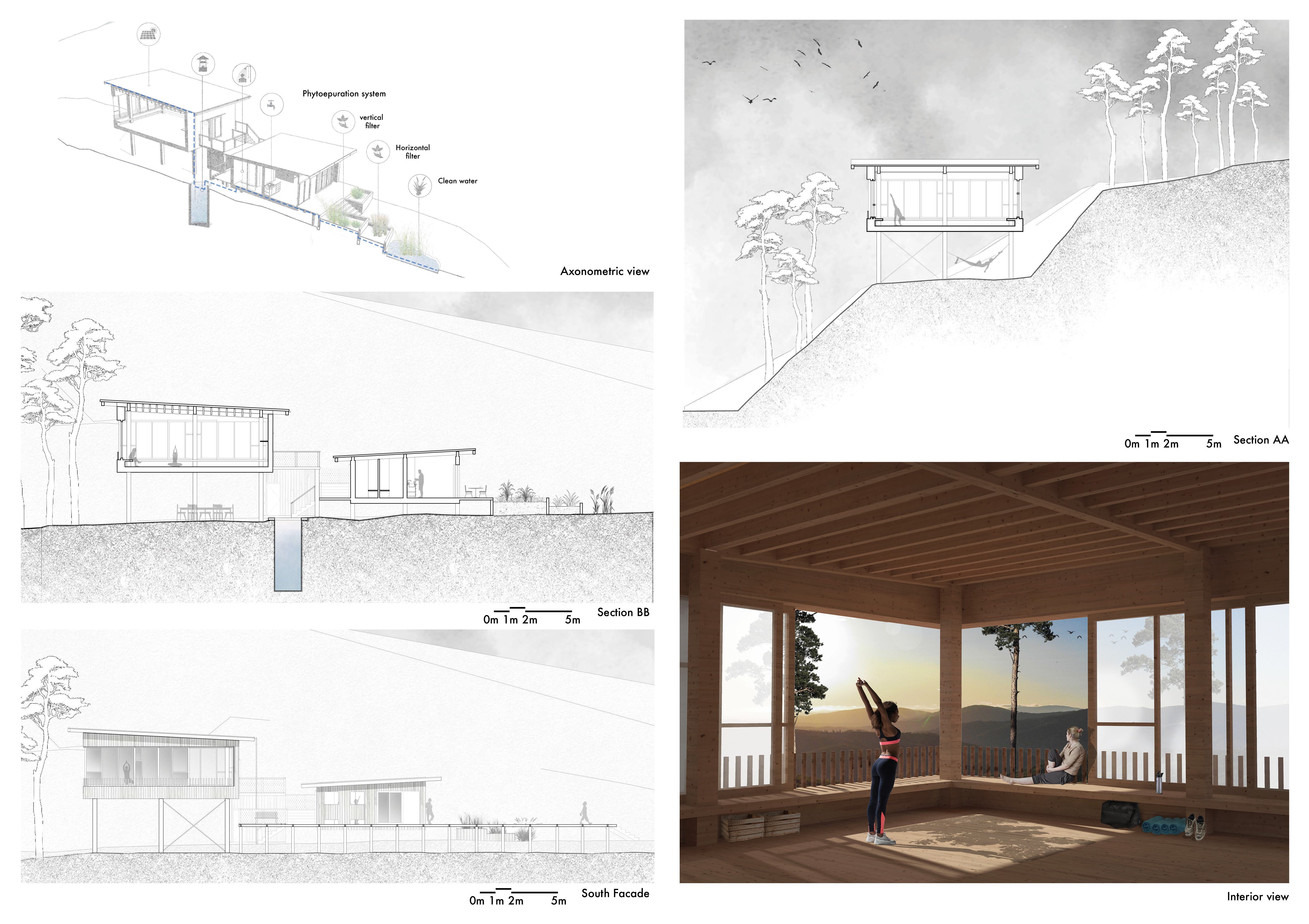 The thoughtful design enhances the connection between the building and its natural surroundings. The yoga space, surrounded by pine trees, creates an inviting atmosphere for meditation and personal growth. This arrangement allows users to feel a strong bond with nature, enriching their experiences and encouraging a deeper appreciation for the tranquil landscape.