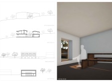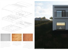 The layout features a coherent separation between guest accommodations and communal areas, promoting both social interaction and privacy. The ground floor includes an open living and dining area, along with two private meditation rooms and direct access to outdoor spaces, facilitating communal gathering. On the upper floor, guest rooms equipped with private bathrooms prioritize comfort while ensuring seclusion. A central pergola connects the two buildings and offers a courtyard that serves as a multifunctional space for relaxation and culinary experiences, underscoring the project's emphasis on social engagement.