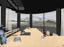 The architectural approach emphasizes a strong connection to the Icelandic topography. Its cylindrical form responds to the geological features of the environment, promoting adaptability while minimizing the structure's impact on the landscape. The layout fosters a sense of openness, offering panoramic views of the dramatic surroundings through strategically placed large windows. This interaction between indoor and outdoor spaces encourages the infusion of natural light throughout the interior.