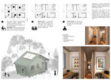 The design utilizes a compact footprint of 25 square meters, maximizing the efficiency of available space through modularity and multifunctional areas. Retractable furniture facilitates flexible transitions between work, dining, leisure, and living spaces, addressing the diverse needs of residents. The interior layout is configured to enhance usability while maintaining a comfortable living environment.
