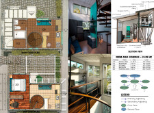 The material selection reflects principles of sustainability and regional context. Key materials include red brick with mud plaster for exterior walls, which provides natural insulation, and structural metal I-columns that support an open, flexible interior. Vinyl sheet roofing and expanded polyethylene ceilings contribute to overall lightness and insulation effectiveness. Additionally, Kingspan roof insulation and PVC gutters enhance energy efficiency and water management. The incorporation of a biofiltration water system further underscores the project’s focus on resource conservation, utilizing recycled water for irrigation. Passive ventilation strategies optimize indoor comfort, capitalizing on local wind patterns and natural light to reduce reliance on mechanical systems.