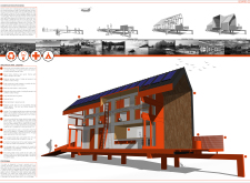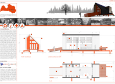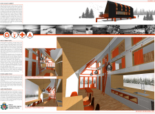 The cabin's layout is intentionally oriented to foster engagement with the surrounding landscape. Its angular form and strategic positioning allow for optimal natural light and views, thereby enhancing the user experience. The design accommodates hikers and nature enthusiasts through a modular structure that promotes ease of assembly in remote locations. Key features include open communal spaces and adaptable sleeping quarters, which cater to both privacy and social interaction.