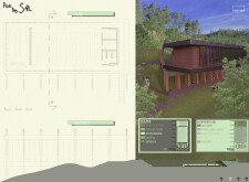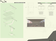 Material choices enhance both the look and function of the design. An external wood coating provides aesthetic appeal while offering protection from the elements. Laminated beams and wooden rafters add structural support and flexibility. Additionally, a waterproof layer and insulation contribute to the building's performance in different weather conditions. The inclusion of quietboard panels helps with acoustics, while warm wooden flooring creates an inviting interior atmosphere.