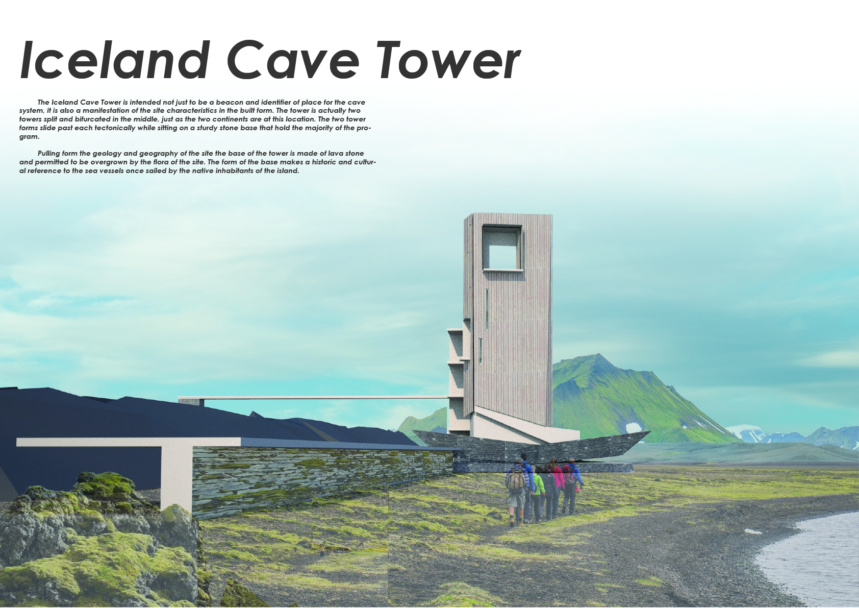 The Iceland Cave Tower stands out in the unique geological landscape of Iceland. It is designed not just to mark an important place for the surrounding cave system, but also to reflect the natural characteristics of the site. The building consists of two separate towers, which symbolize the division of tectonic plates. This thoughtful design integrates functionality with a connection to the environment.