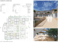 The layout employs a multi-level design that adapts to the hilly terrain, minimizing land disturbance while enhancing the natural landscape. Buildings are arranged in clusters around central courtyards, encouraging social engagement while offering individual privacy. These communal areas are equipped with furniture to support various activities, fostering a sense of community among residents. Additionally, the organization of residential units—ranging from standard to accessible—allows for a flexible living experience that promotes neighborly interaction while accommodating personal retreat.