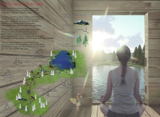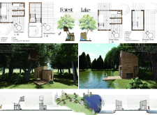 There are two types of individual cabins: forest and lake cabins. The forest cabins are designed with two stories. The ground floor is meant for social activities, while the upper floor is dedicated to meditation and quiet reflection. In contrast, the lake cabins are designed to take advantage of their location, featuring open terraces that offer opportunities for outdoor meditation and engagement with the calming sounds and sights of the water.