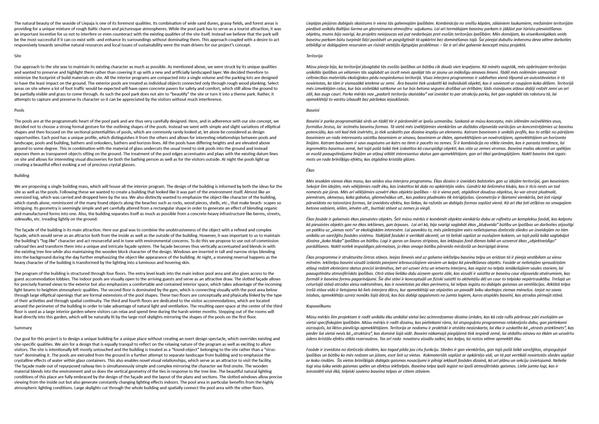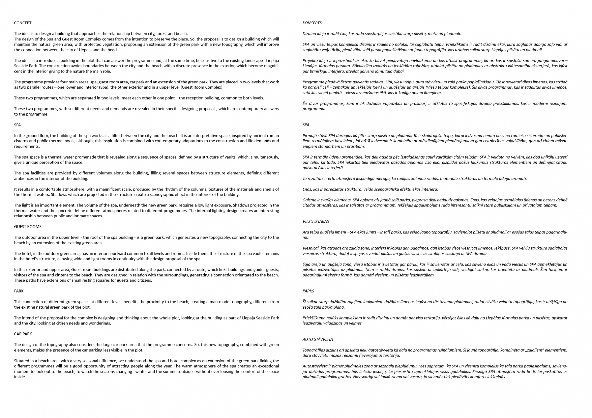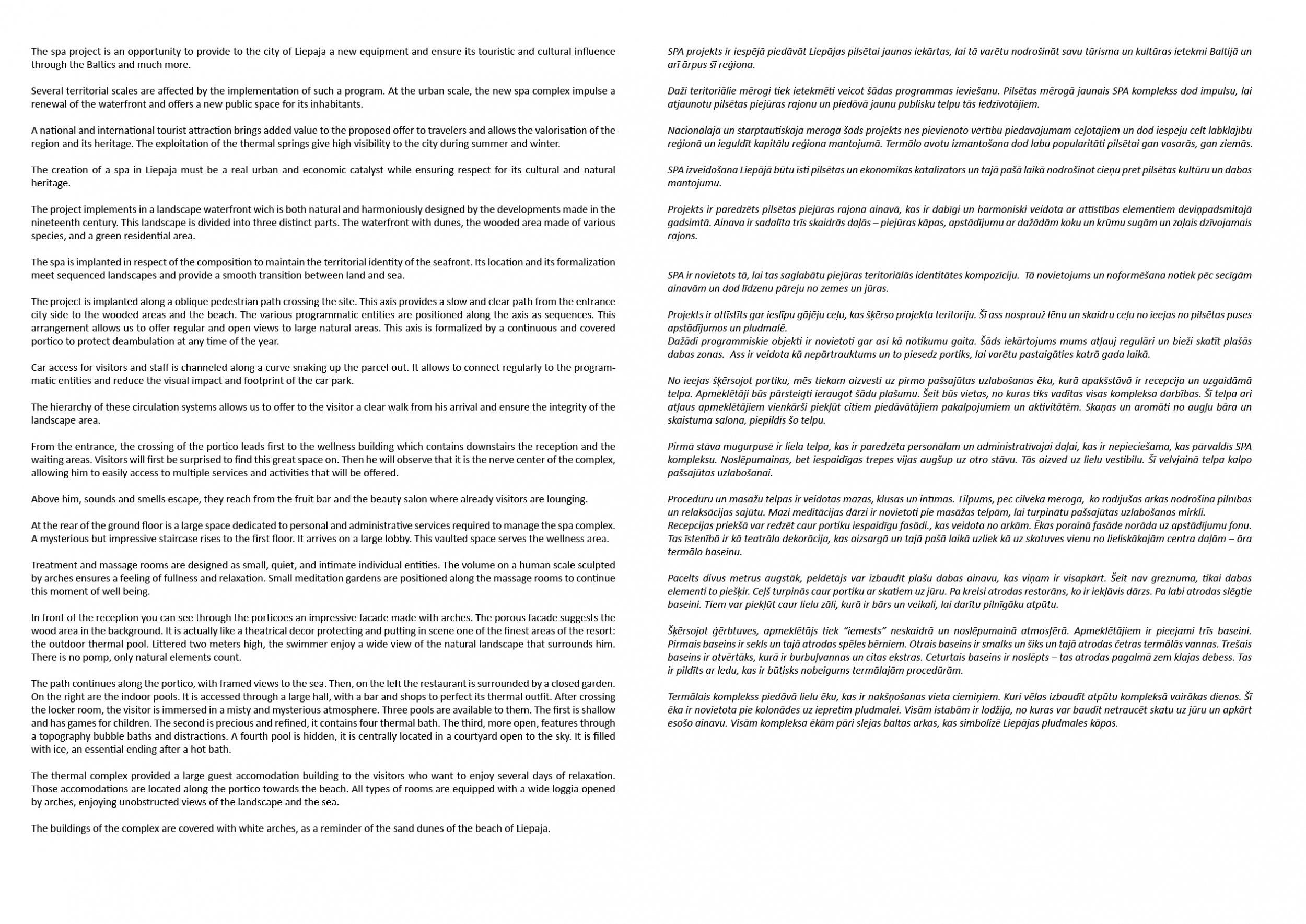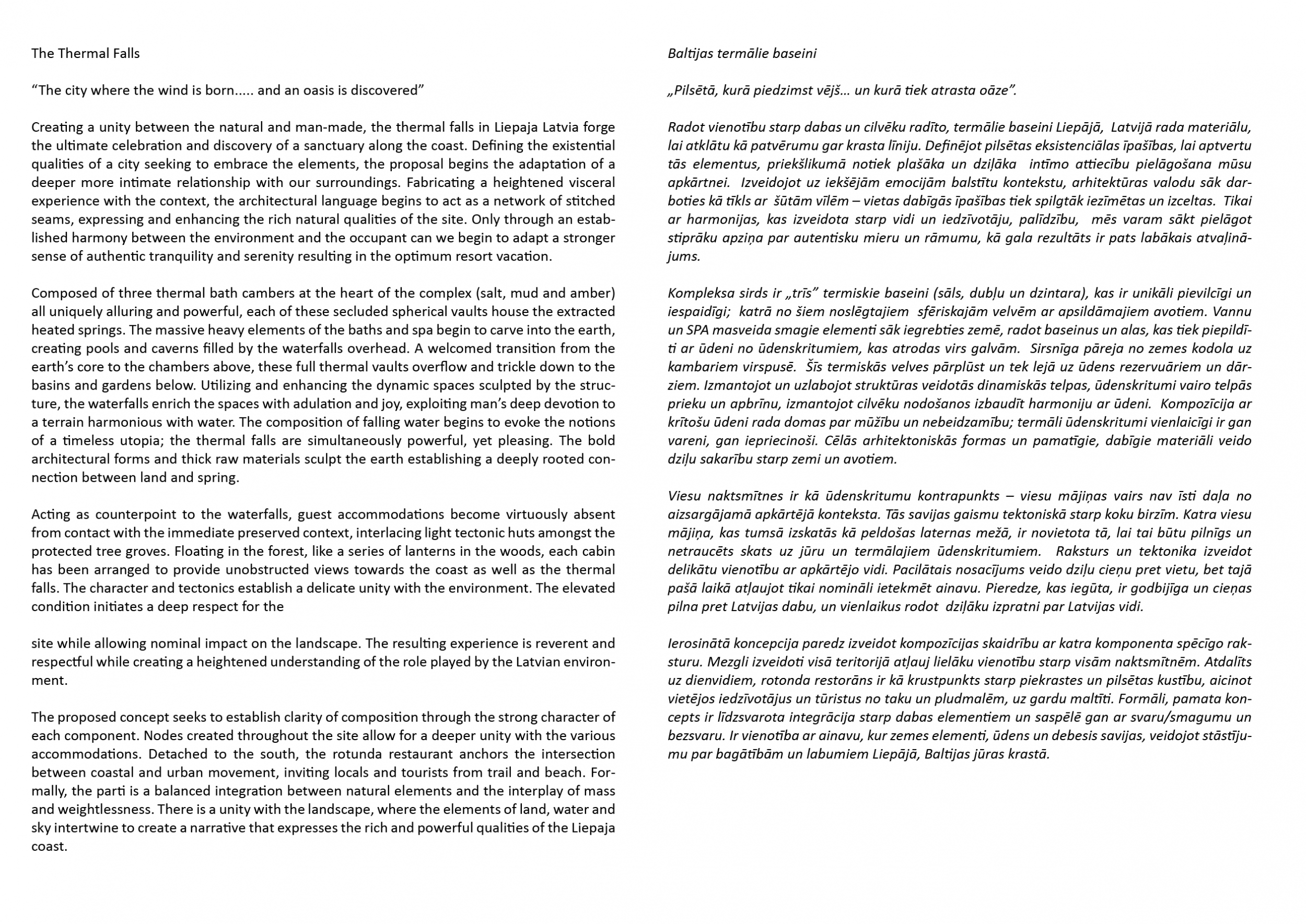 The second competition in a design series focused on Liepaja Seaside Park (Liepaja, Latvia) to be presented a vision for a new development that would consist of thermal pool park with outdoor and indoor SPA facilities. Over 90 innovative, creative and well elaborated submissions were received from all over the world; evaluation of each proposal was conducted in an ethical, professional, accurate and technically adequate manner.