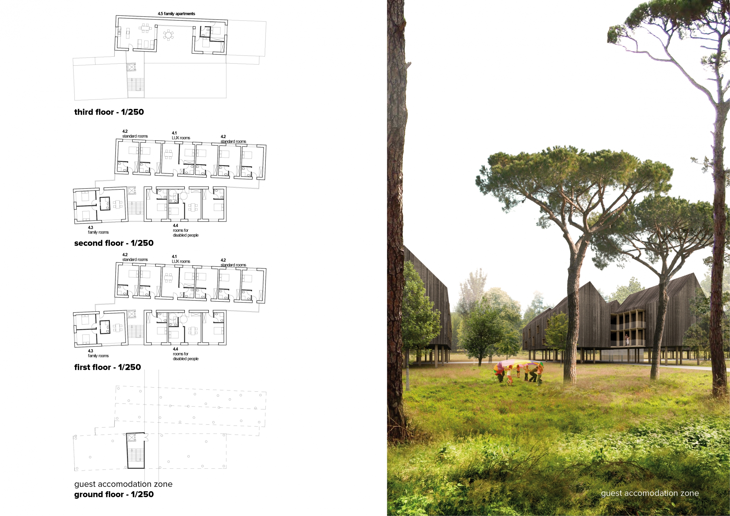 The authors of this project have divided the buildings in two different functionality programs – the main SPA complex where all the attractions and SPA treatments are offered and the guest accommodation where the visitors can slowly enjoy the nature and charm of the hundreds of years old trees.