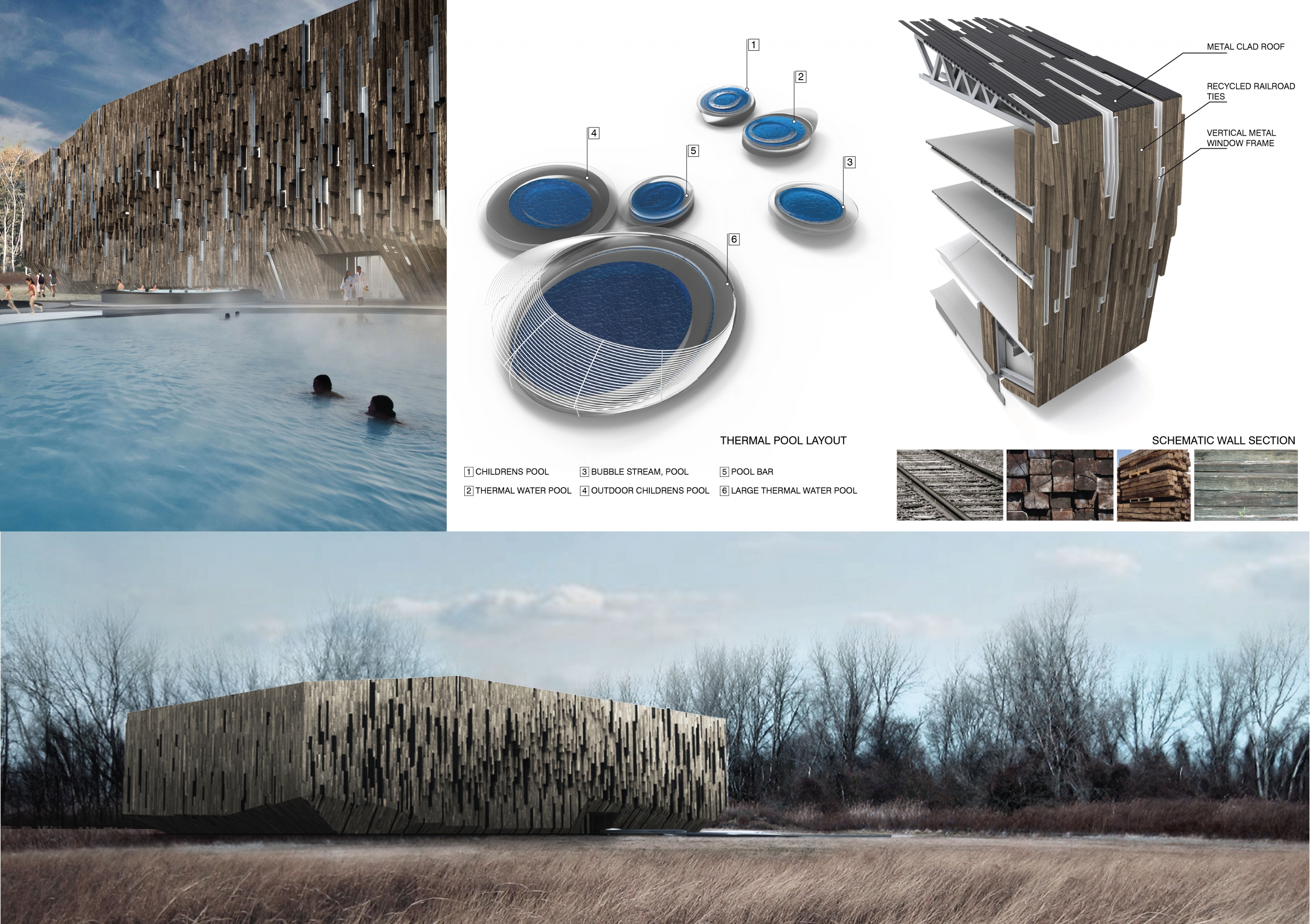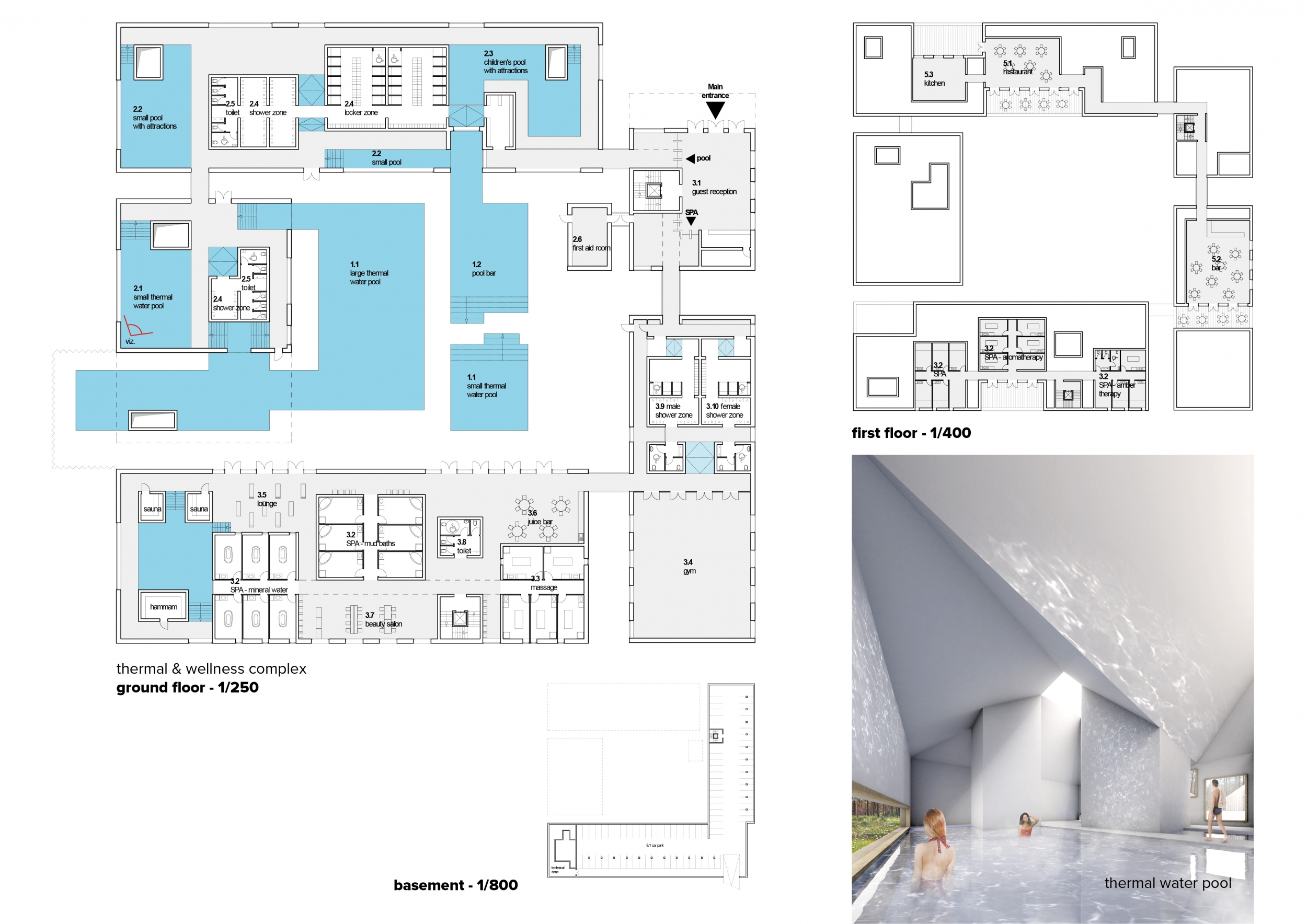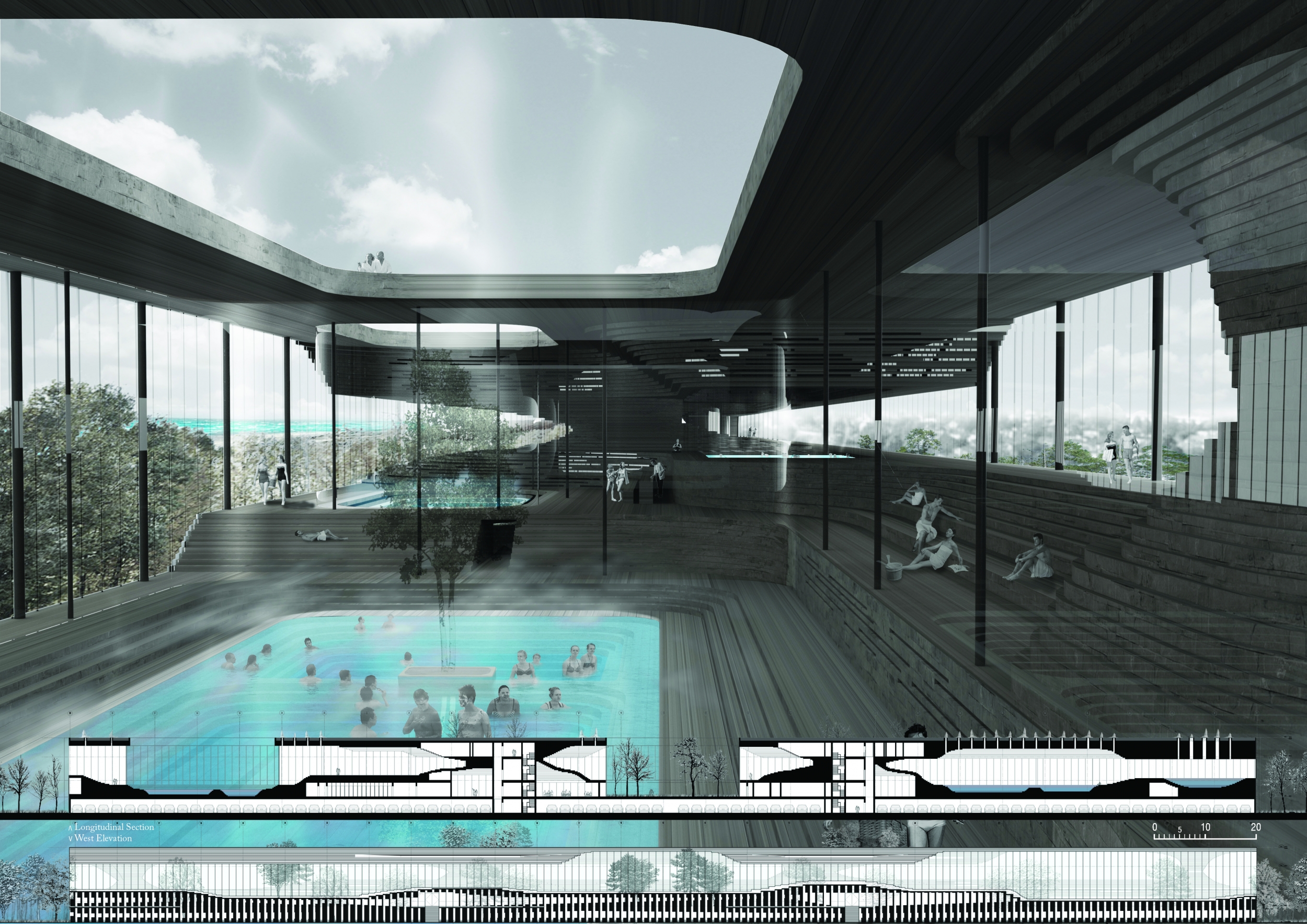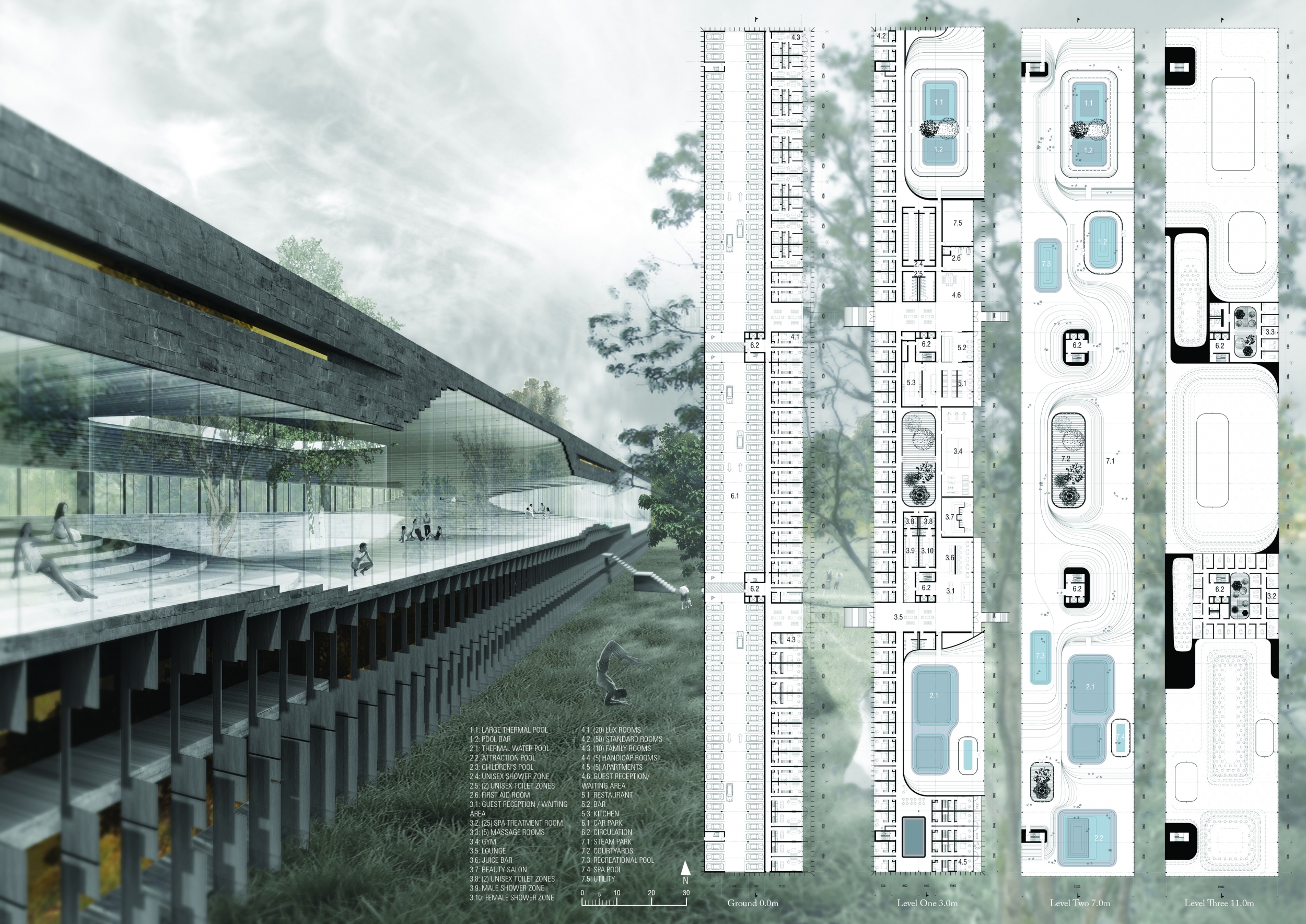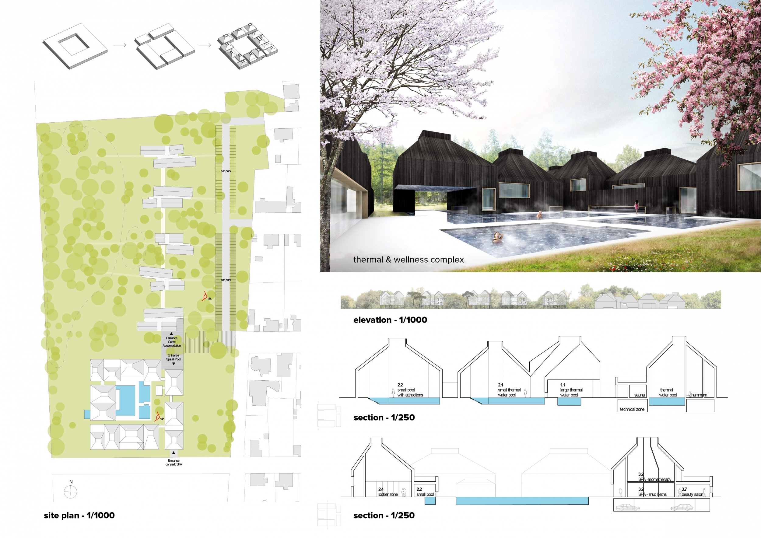 The project offers a unique perspective on a development of a thermal pool park. The authors have created the complex as a multi-functional center where one can find different kind of activities in all four seasons. Swimming and exercising in thermal pools, outdoor film screenings, and local apple, cherry and plum harvesting as a part of a local market space program.
