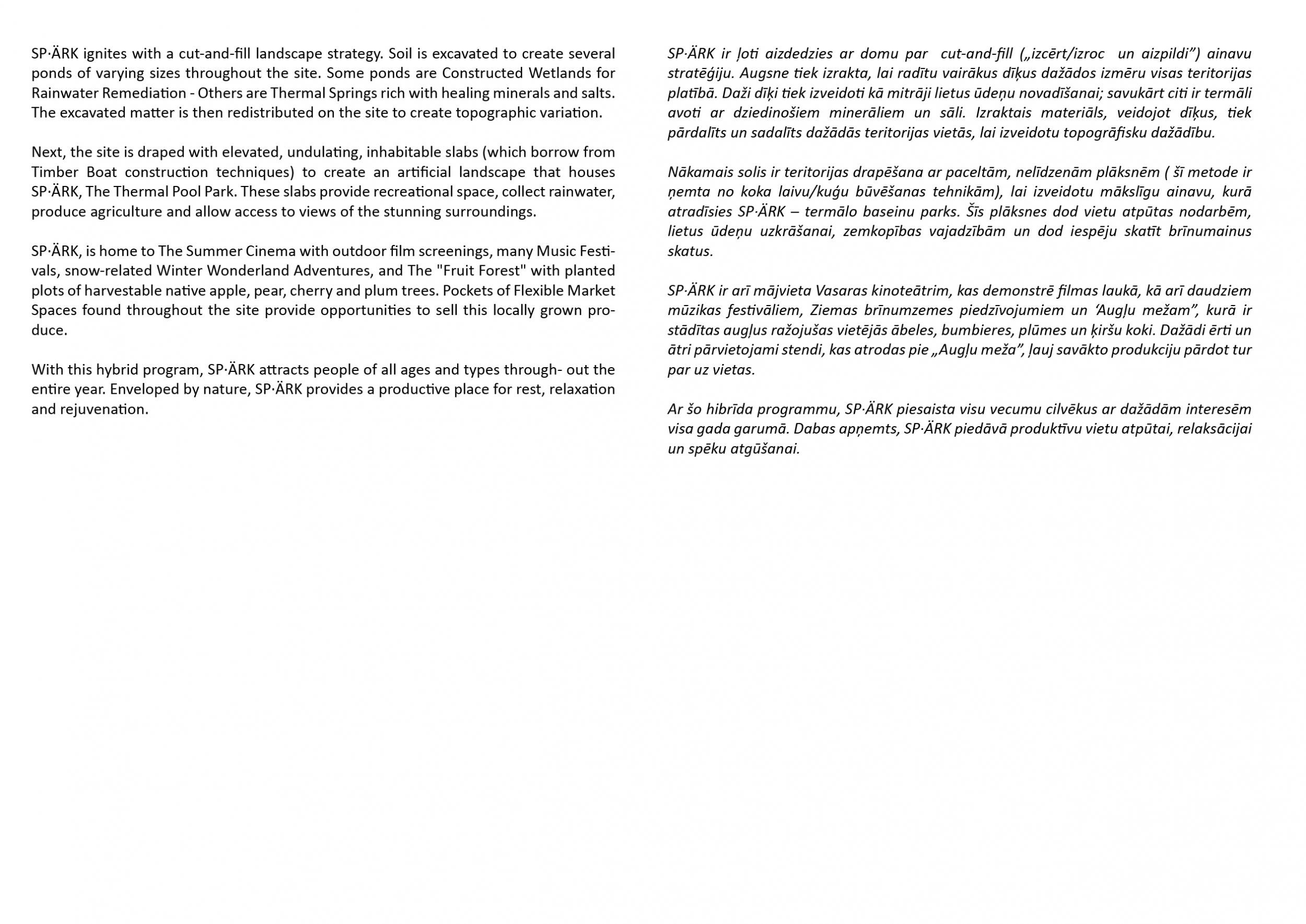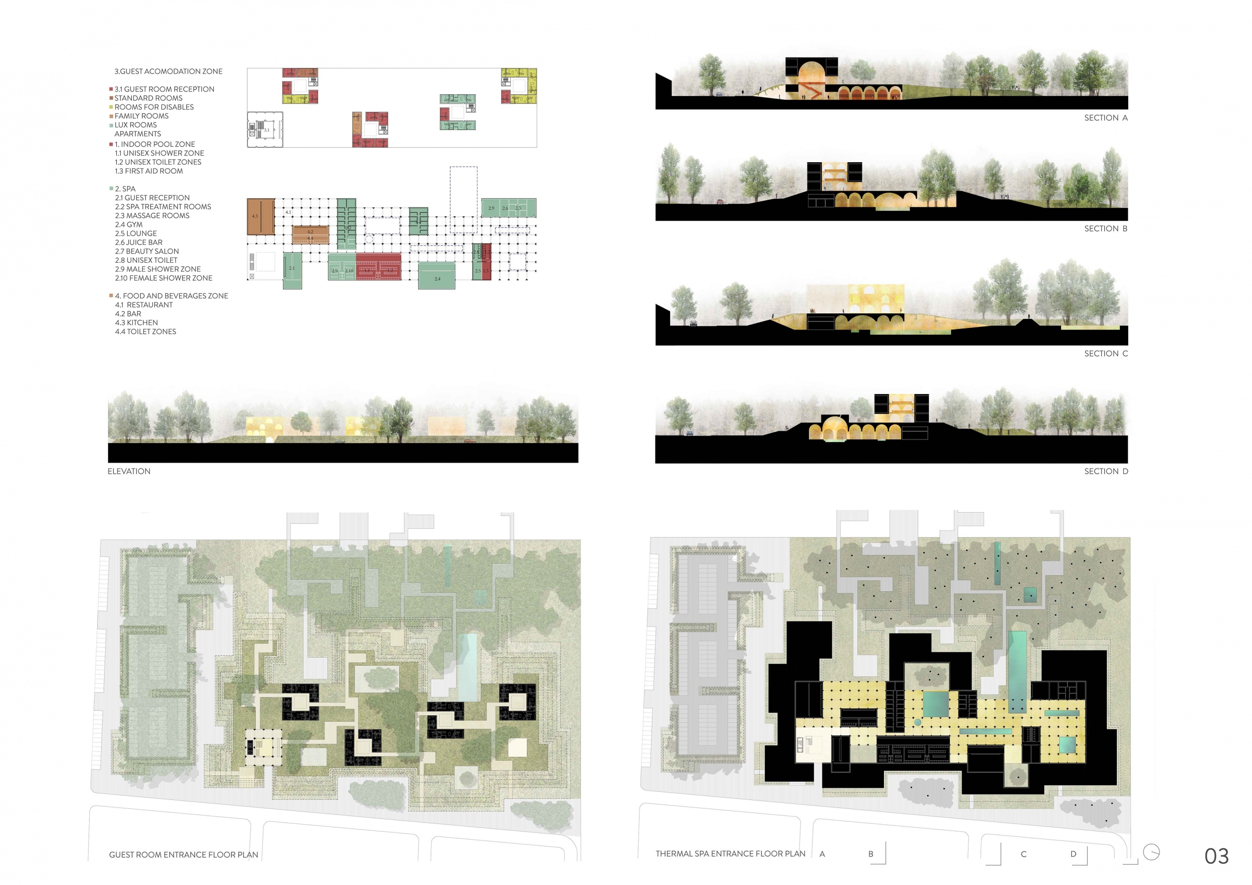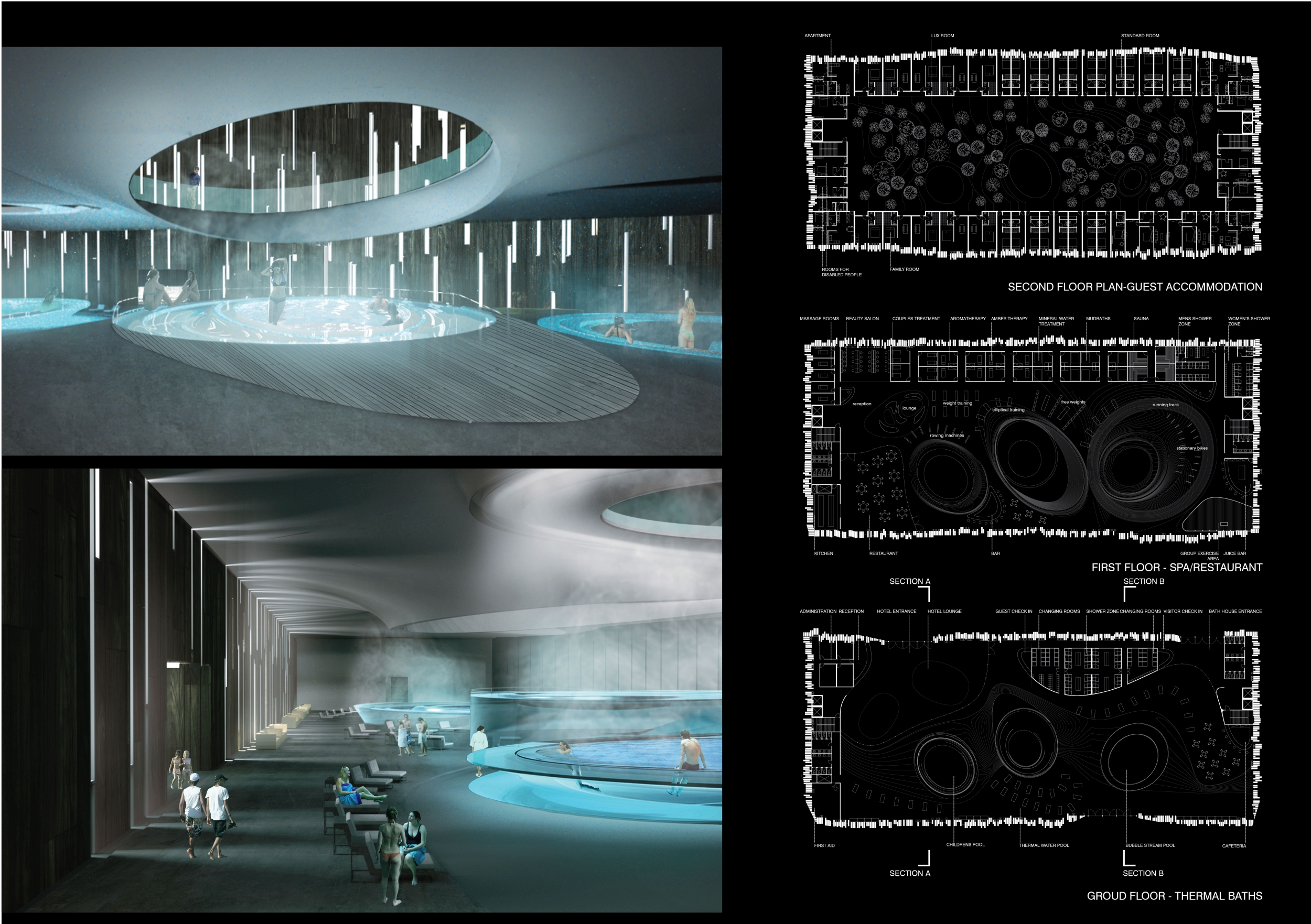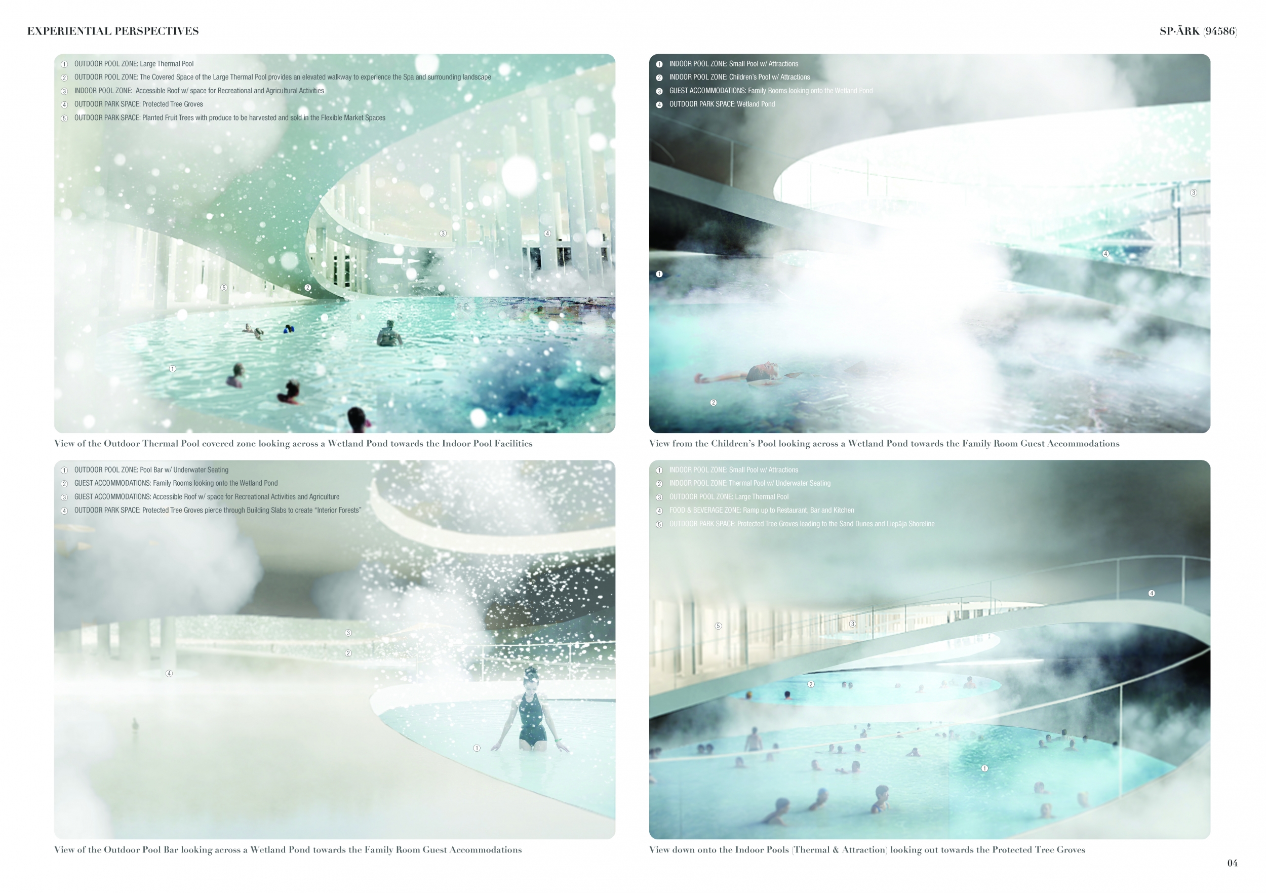 The project offers a unique perspective on a development of a thermal pool park. The authors have created the complex as a multi-functional center where one can find different kind of activities in all four seasons. Swimming and exercising in thermal pools, outdoor film screenings, and local apple, cherry and plum harvesting as a part of a local market space program.