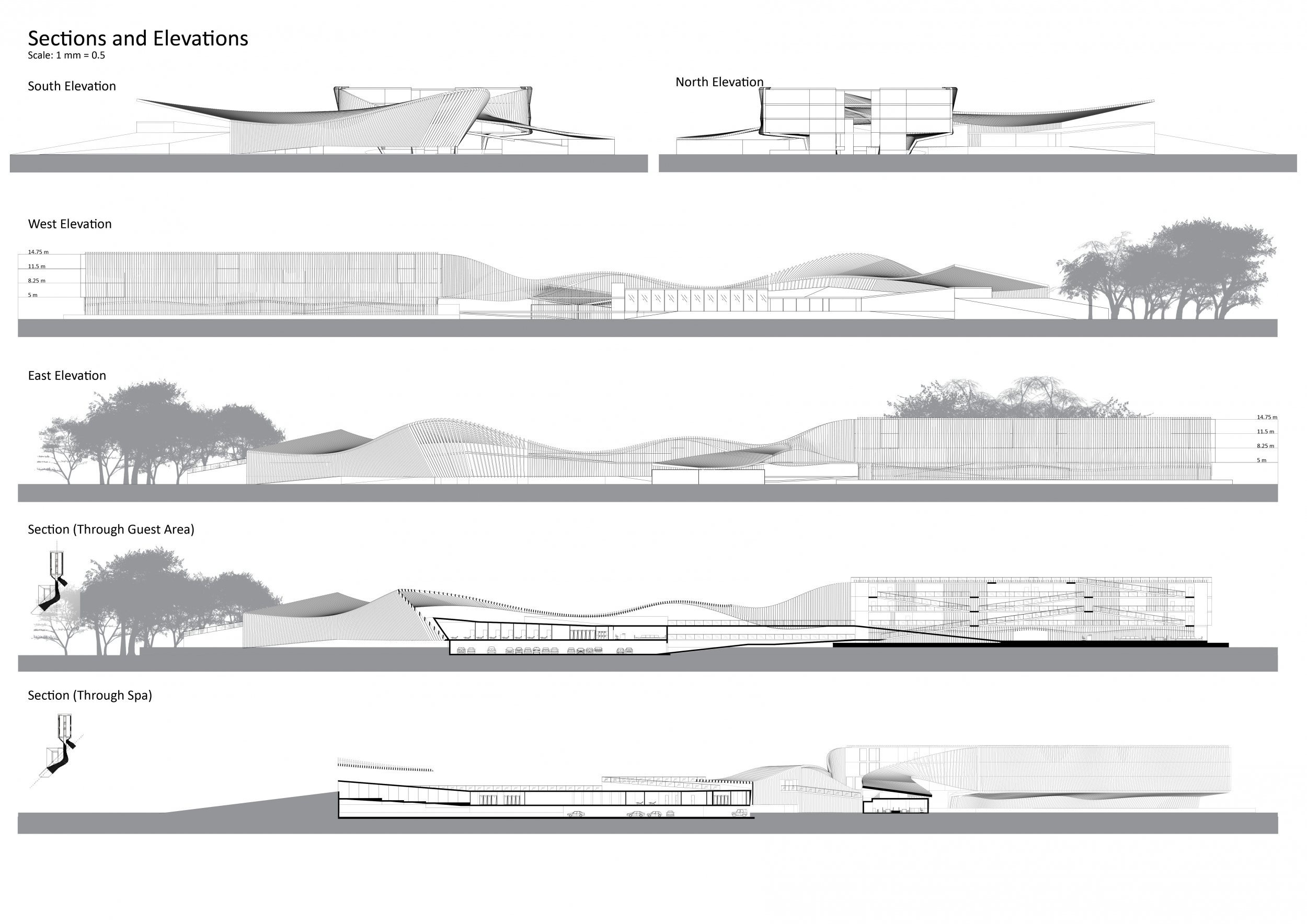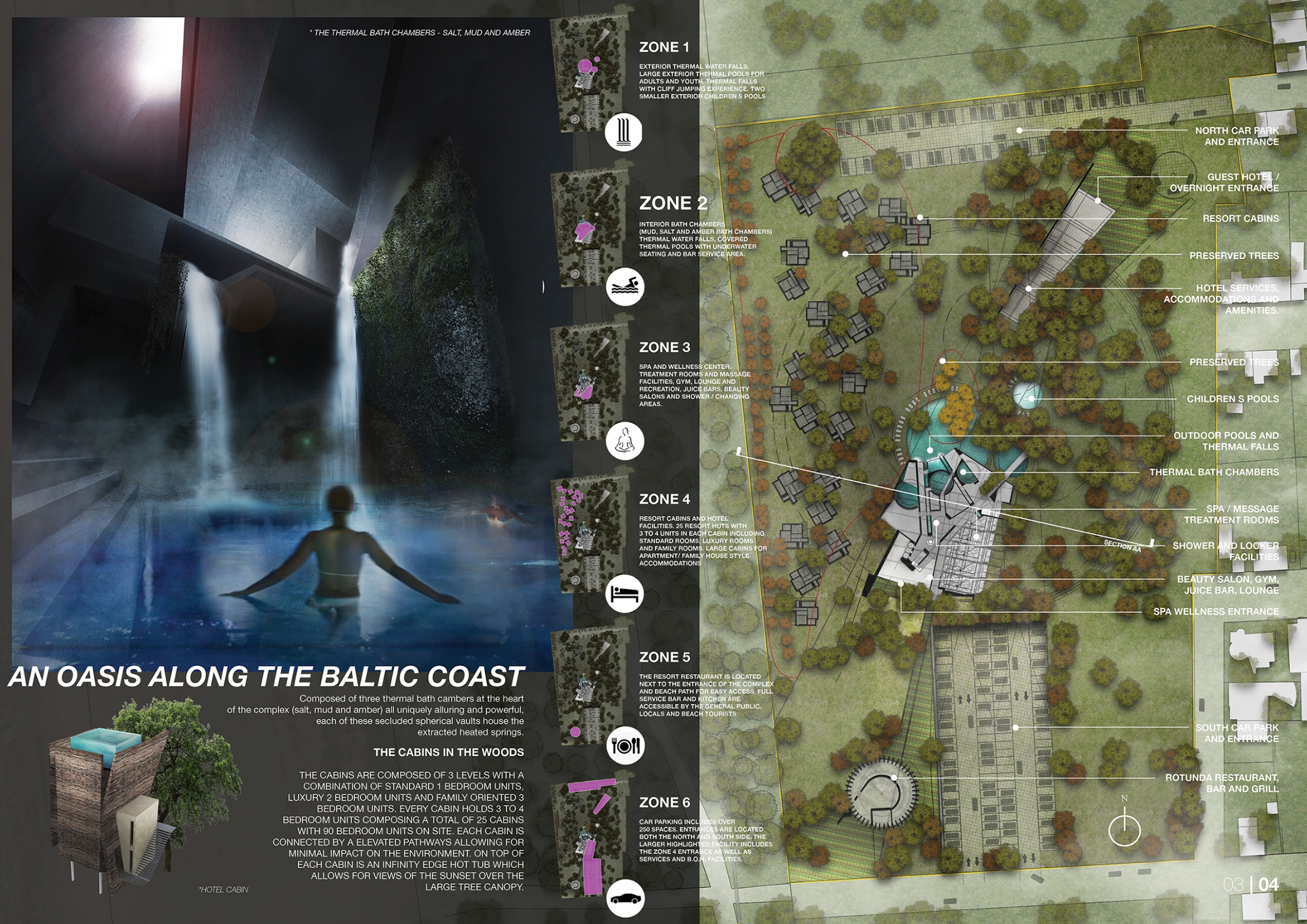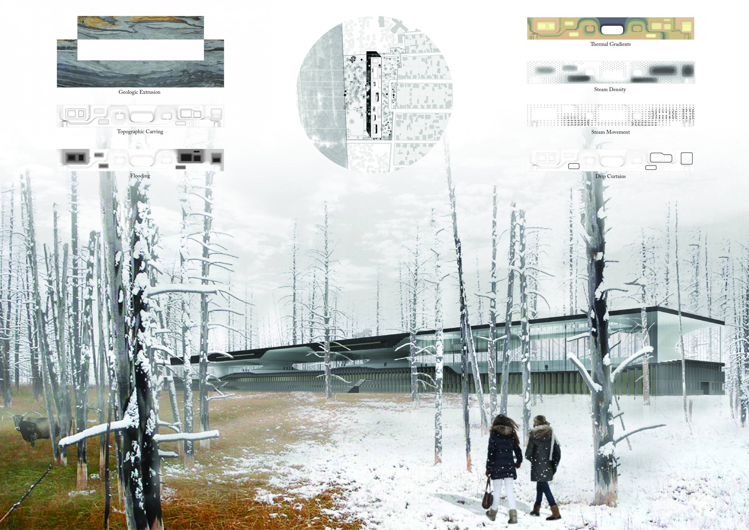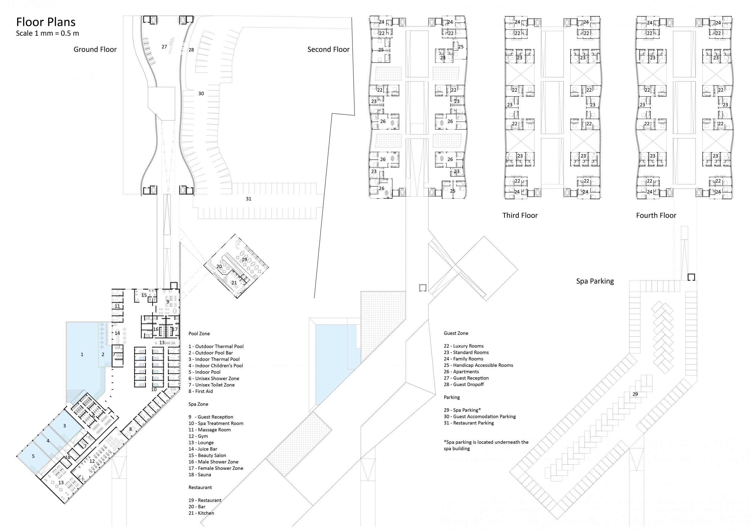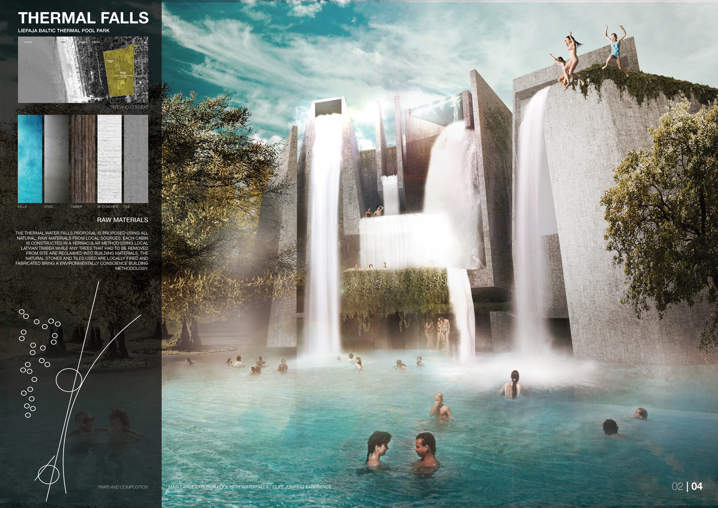 The project offers a unique perspective on a development of a thermal pool park. The authors have created the complex as a multi-functional center where one can find different kind of activities in all four seasons. Swimming and exercising in thermal pools, outdoor film screenings, and local apple, cherry and plum harvesting as a part of a local market space program.