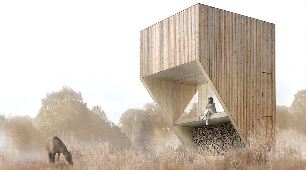 Client’s Favorite and first prize was awarded to Grzegorz Mączka and Marta Mączka from Poland. Their Diagonal project proposed a cabin with a reduced footprint in the form of a top-heavy structure, angled in shape with a narrow base to ‘raise’ the main living area off the ground. “A modern and smart design with an innovative and compact space that gives an amazing experience to visitors.”