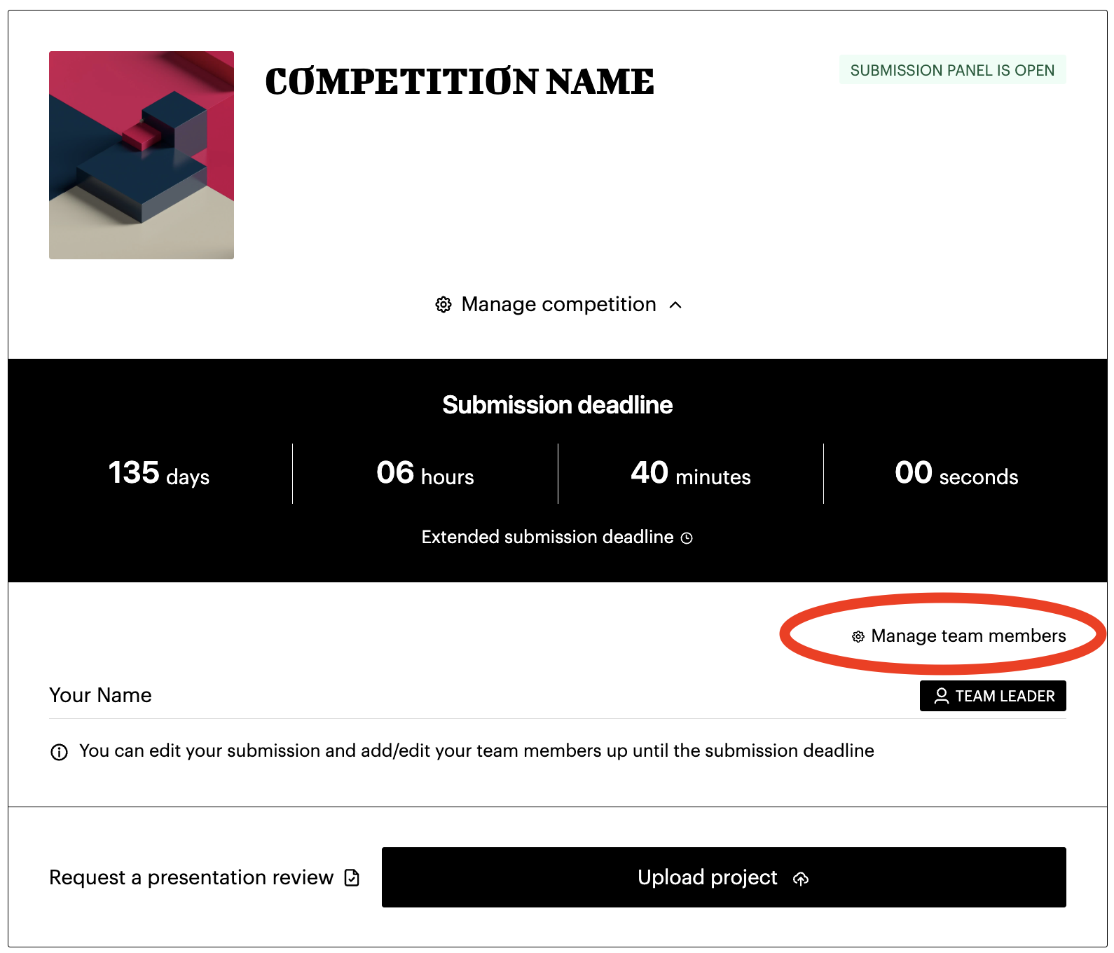 Once your competition registration is validated successfully, you have the option to invite team members to your project. If you prefer, you can also continue to participate solo. To add team members, please follow the steps outlined in this guide: https://architecturecompetitions.com/how-to-add-team-members-after-april-2023