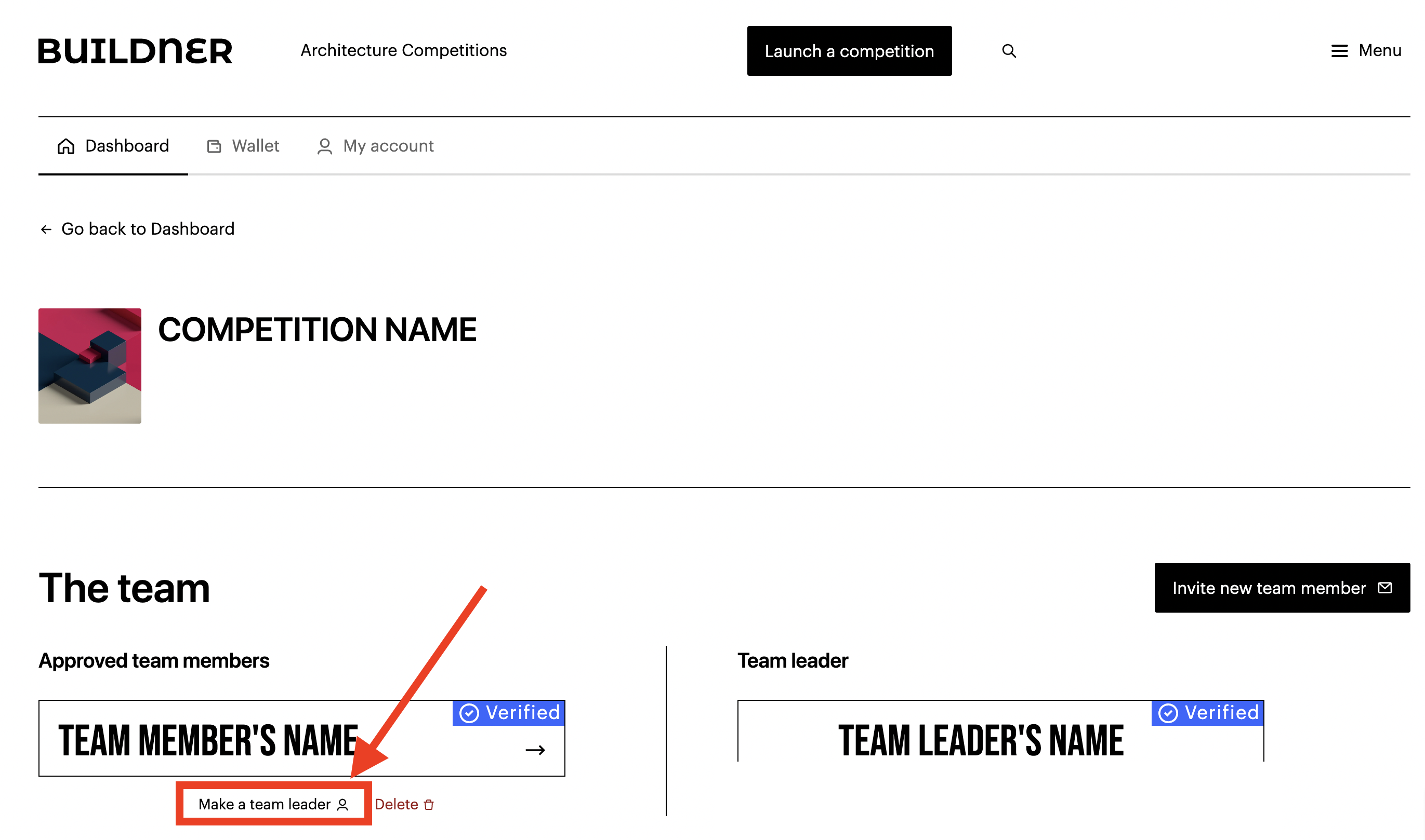 As a Team Leader - visit https://architecturecompetitions.com/login and log in using your Architects' Network (an.pro) credentials, click on "Manage Team Members"