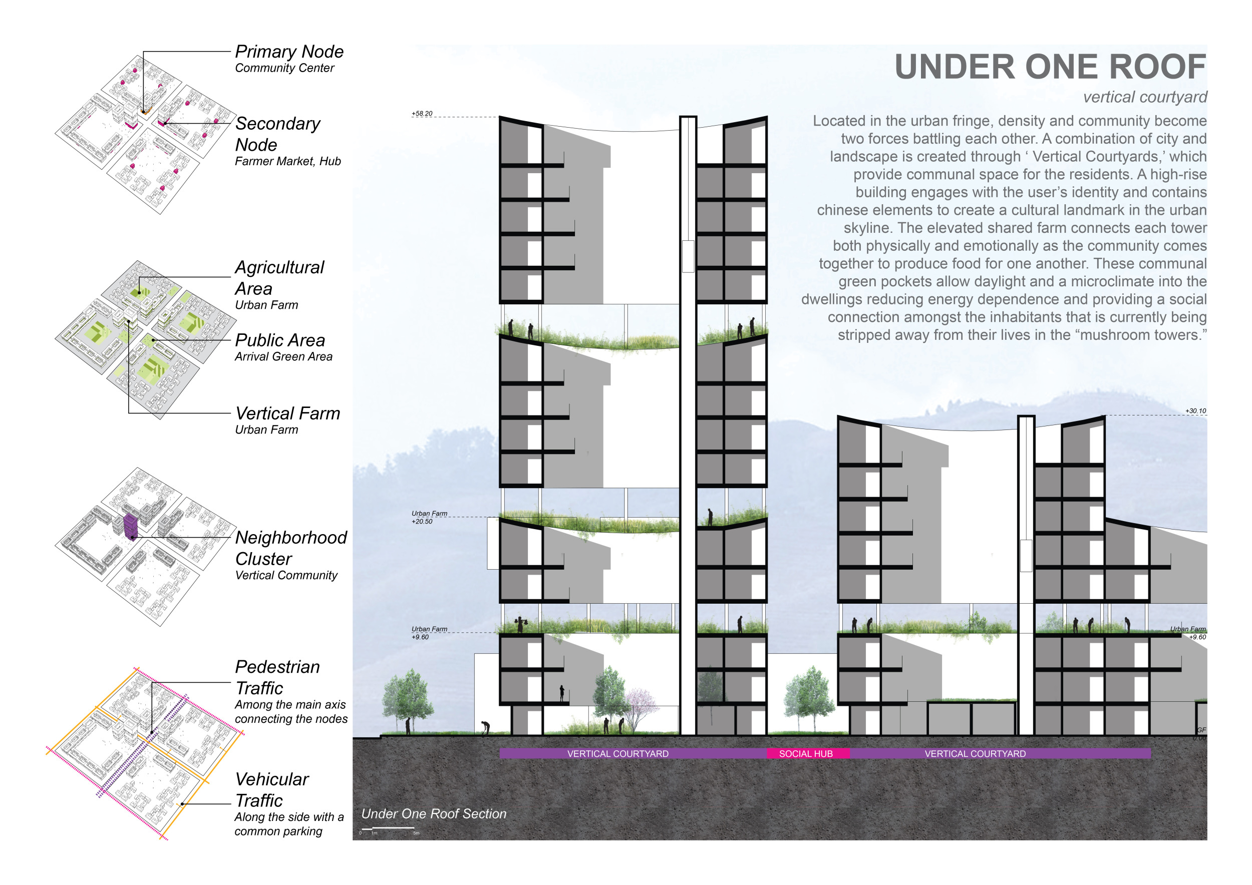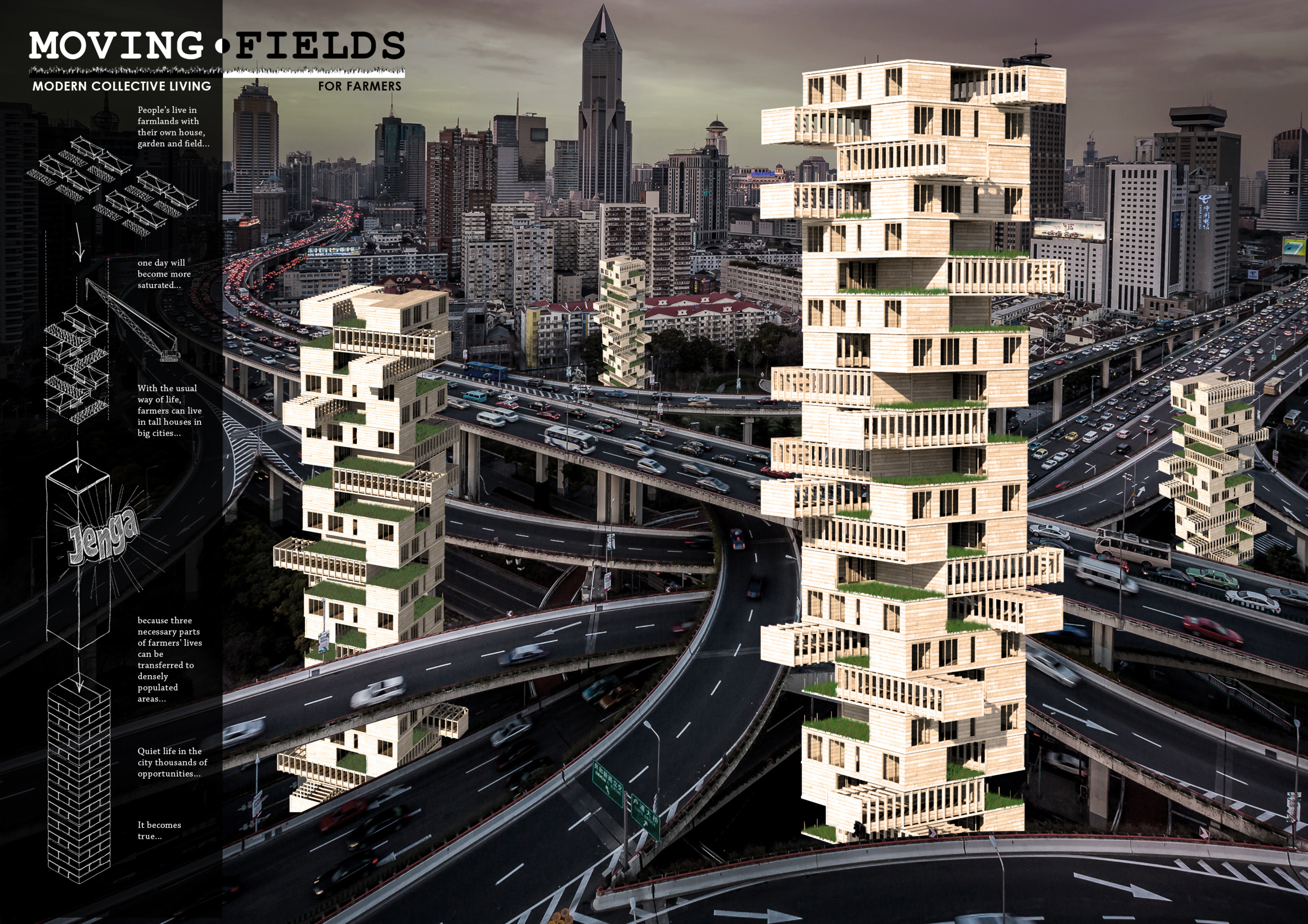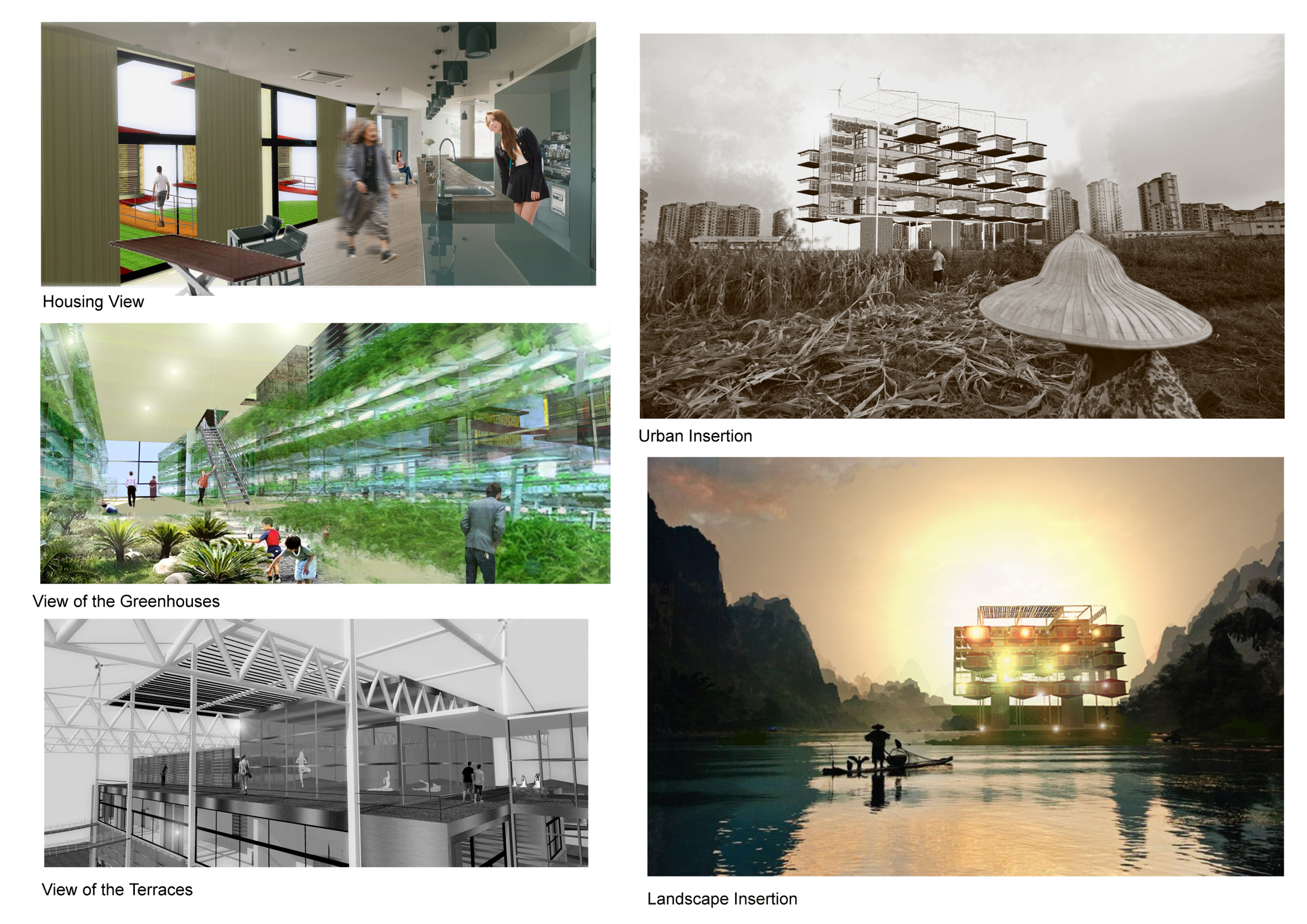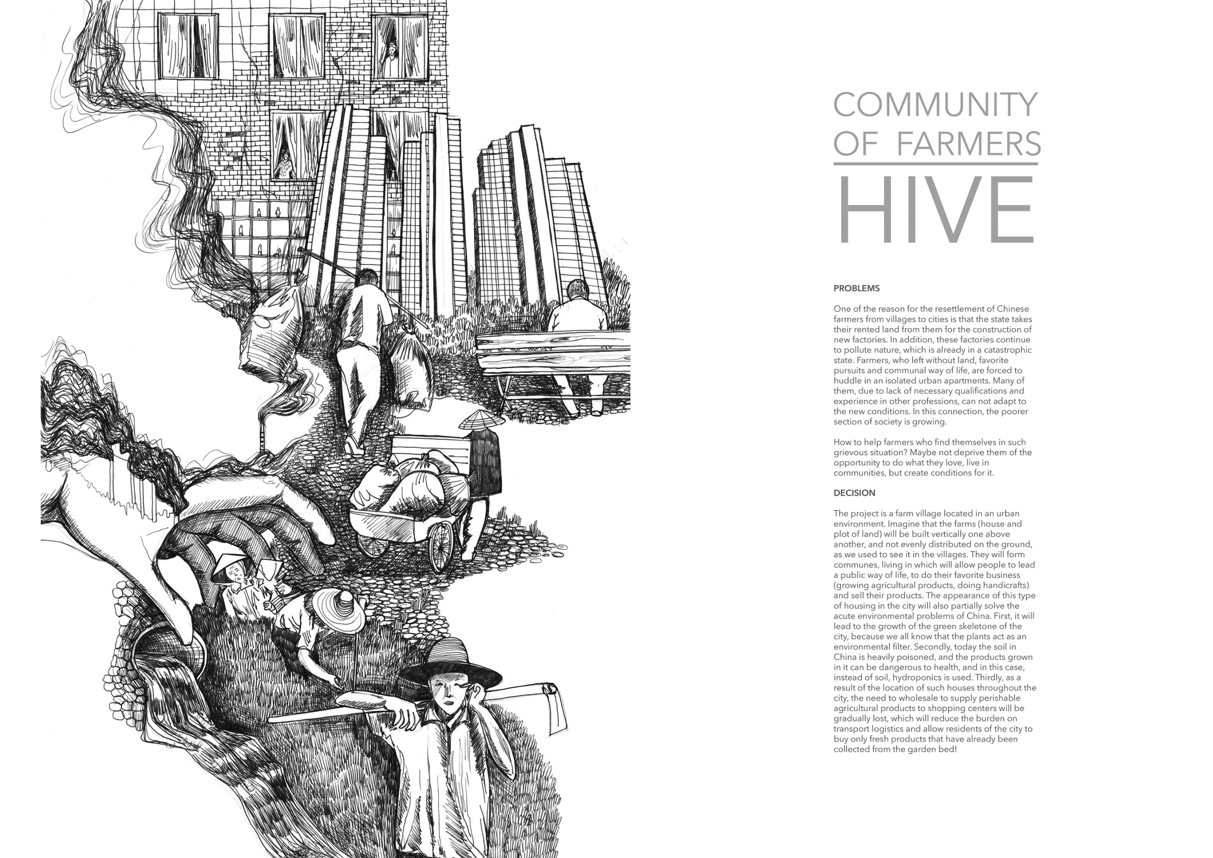 The Community of Farmers Hive presents an environmentally-conscious solution to the relocation of rural farmers to urban cities in China. The Hive is conceptualised as vertically-stacked agricultural plots within cities centres that not only provide communal housing, but also help to grow the green skeleton of the city and act to reduce the effects of heavy pollution.