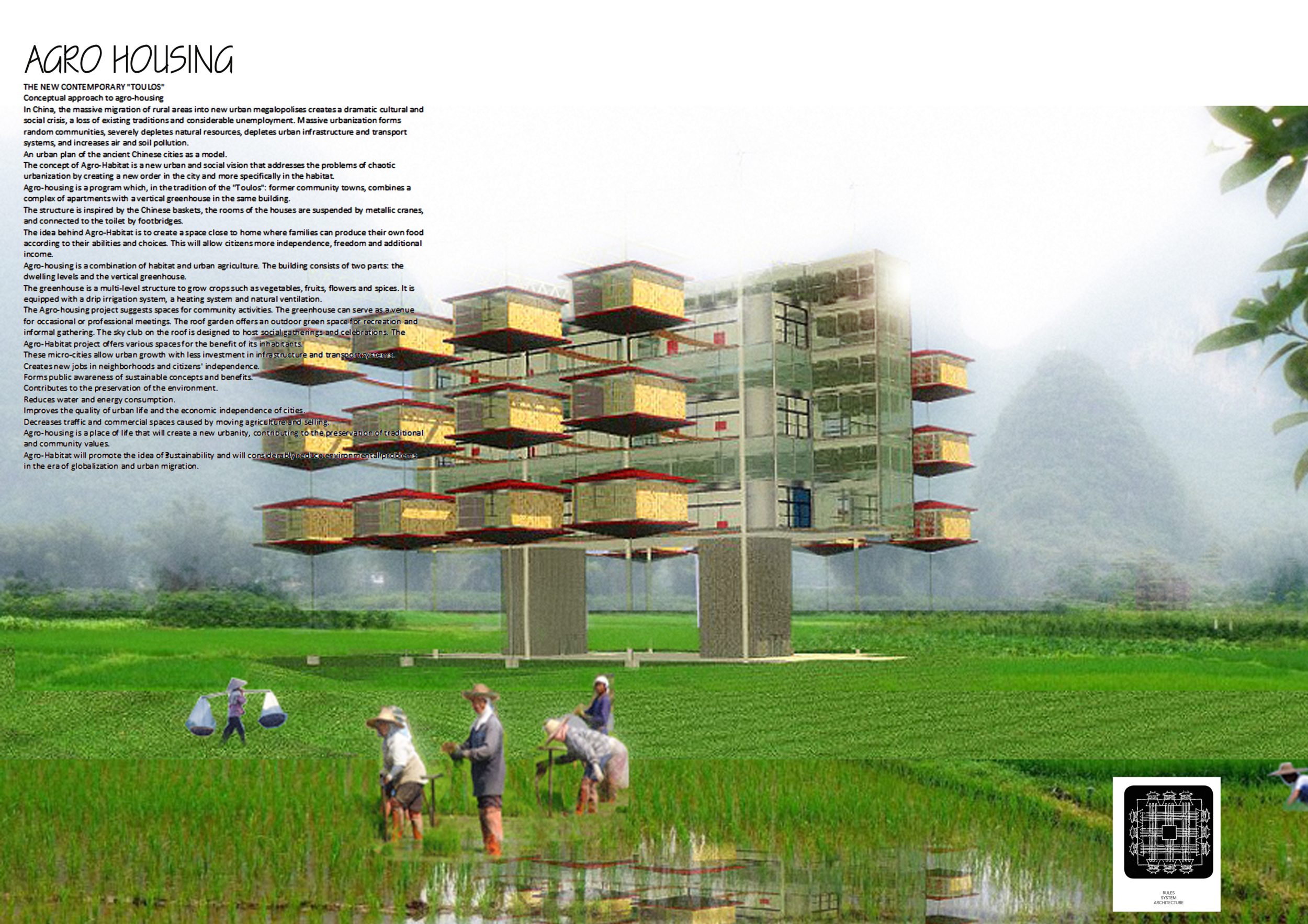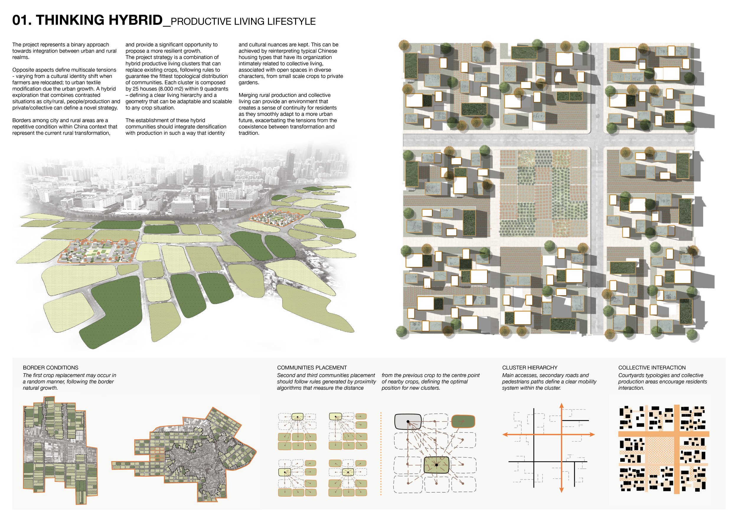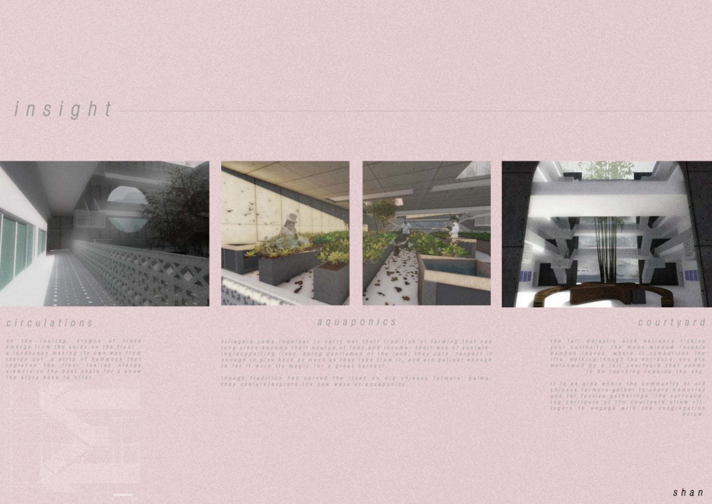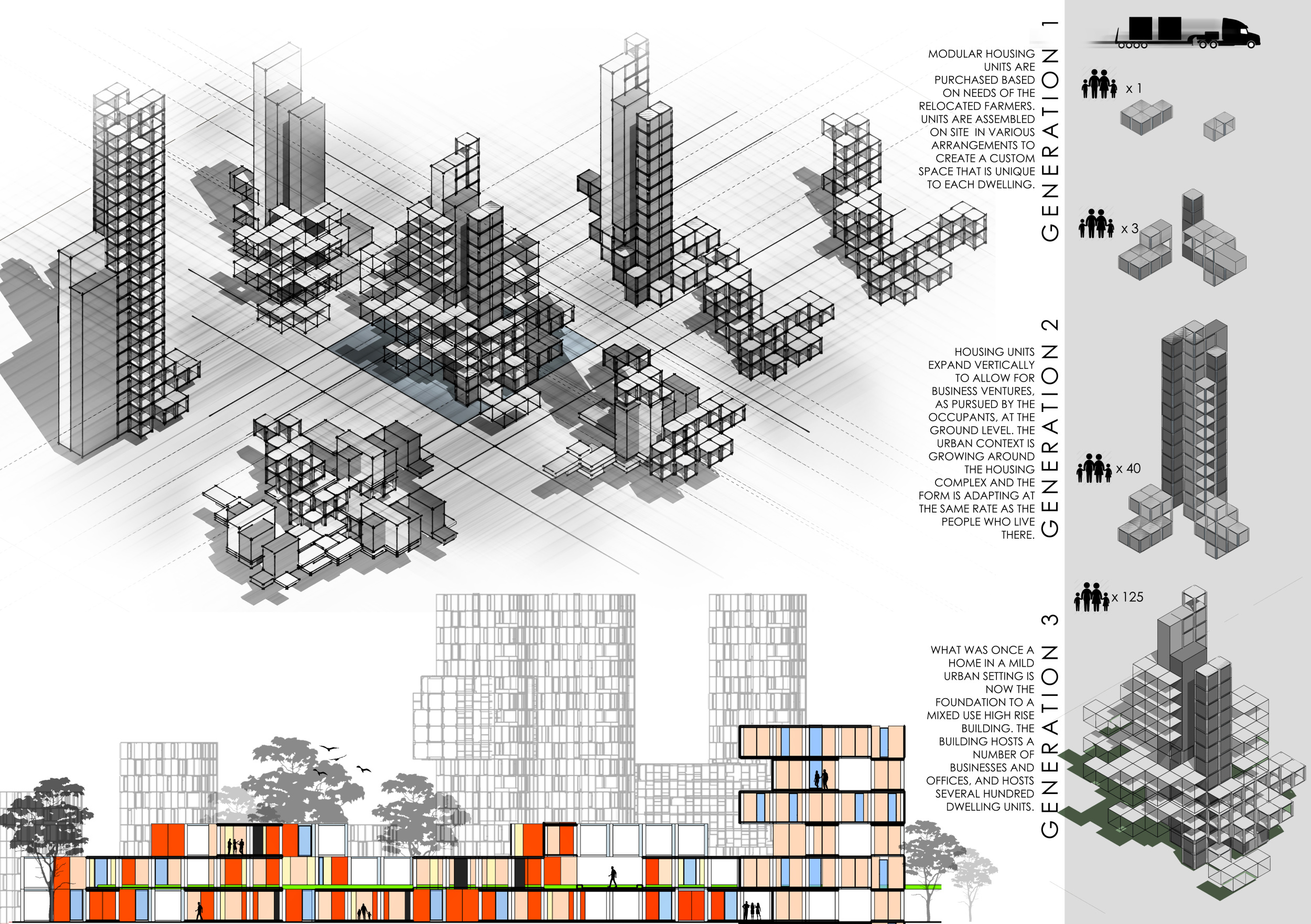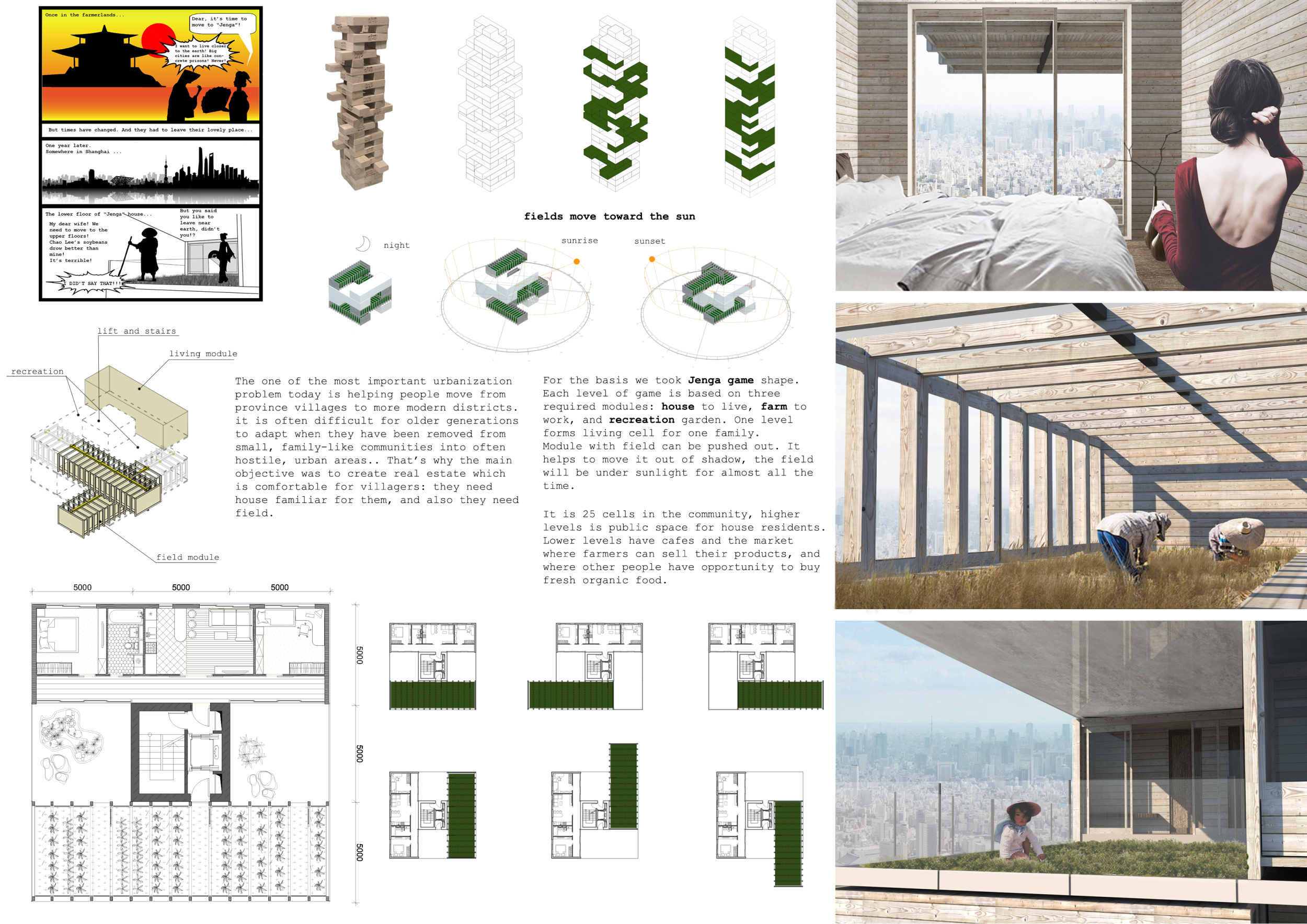 The Community of Farmers Hive presents an environmentally-conscious solution to the relocation of rural farmers to urban cities in China. The Hive is conceptualised as vertically-stacked agricultural plots within cities centres that not only provide communal housing, but also help to grow the green skeleton of the city and act to reduce the effects of heavy pollution.