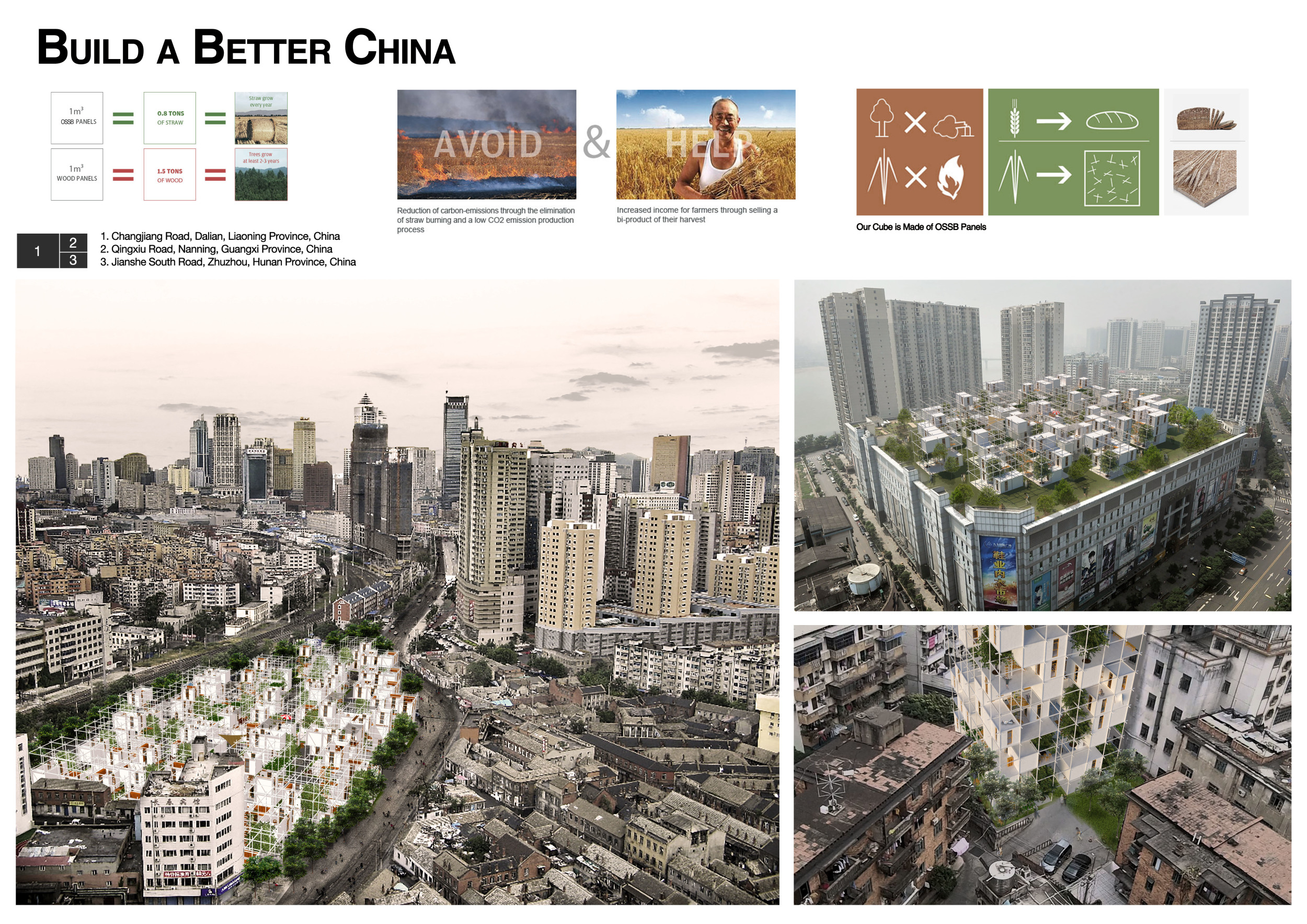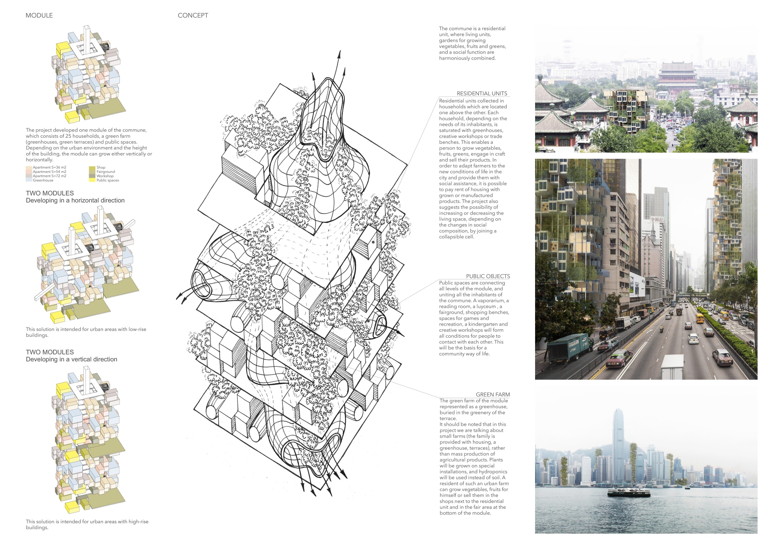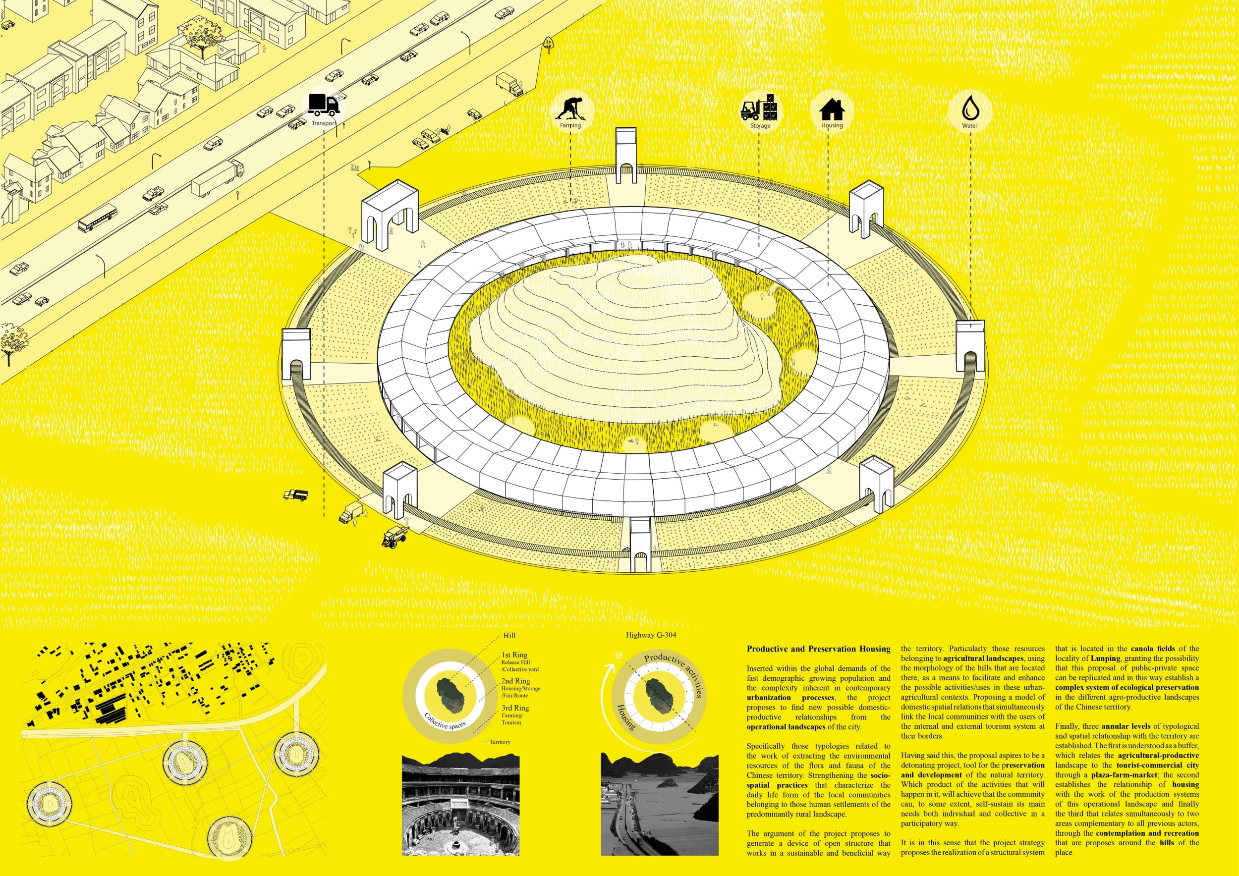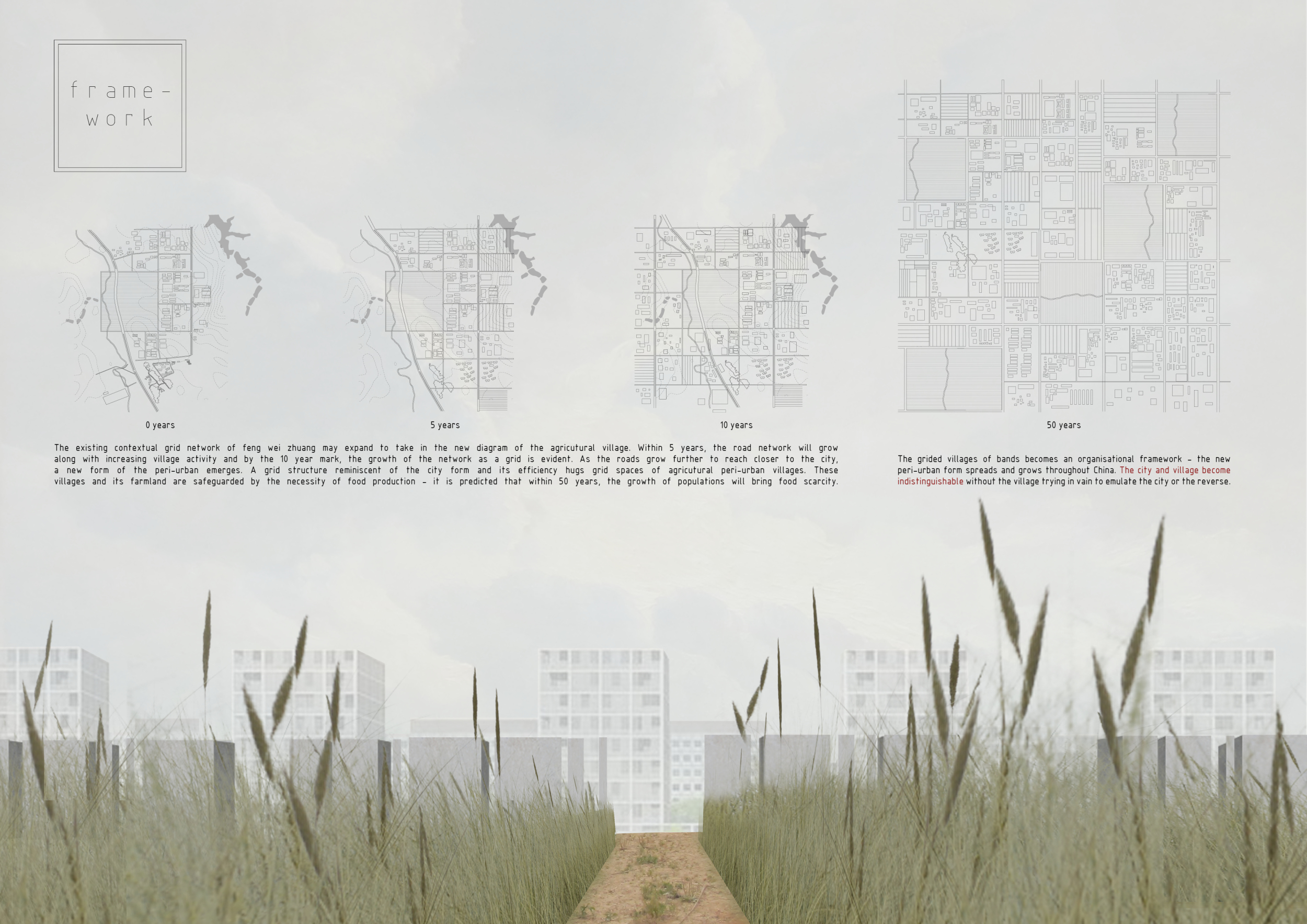 The Community of Farmers Hive presents an environmentally-conscious solution to the relocation of rural farmers to urban cities in China. The Hive is conceptualised as vertically-stacked agricultural plots within cities centres that not only provide communal housing, but also help to grow the green skeleton of the city and act to reduce the effects of heavy pollution.