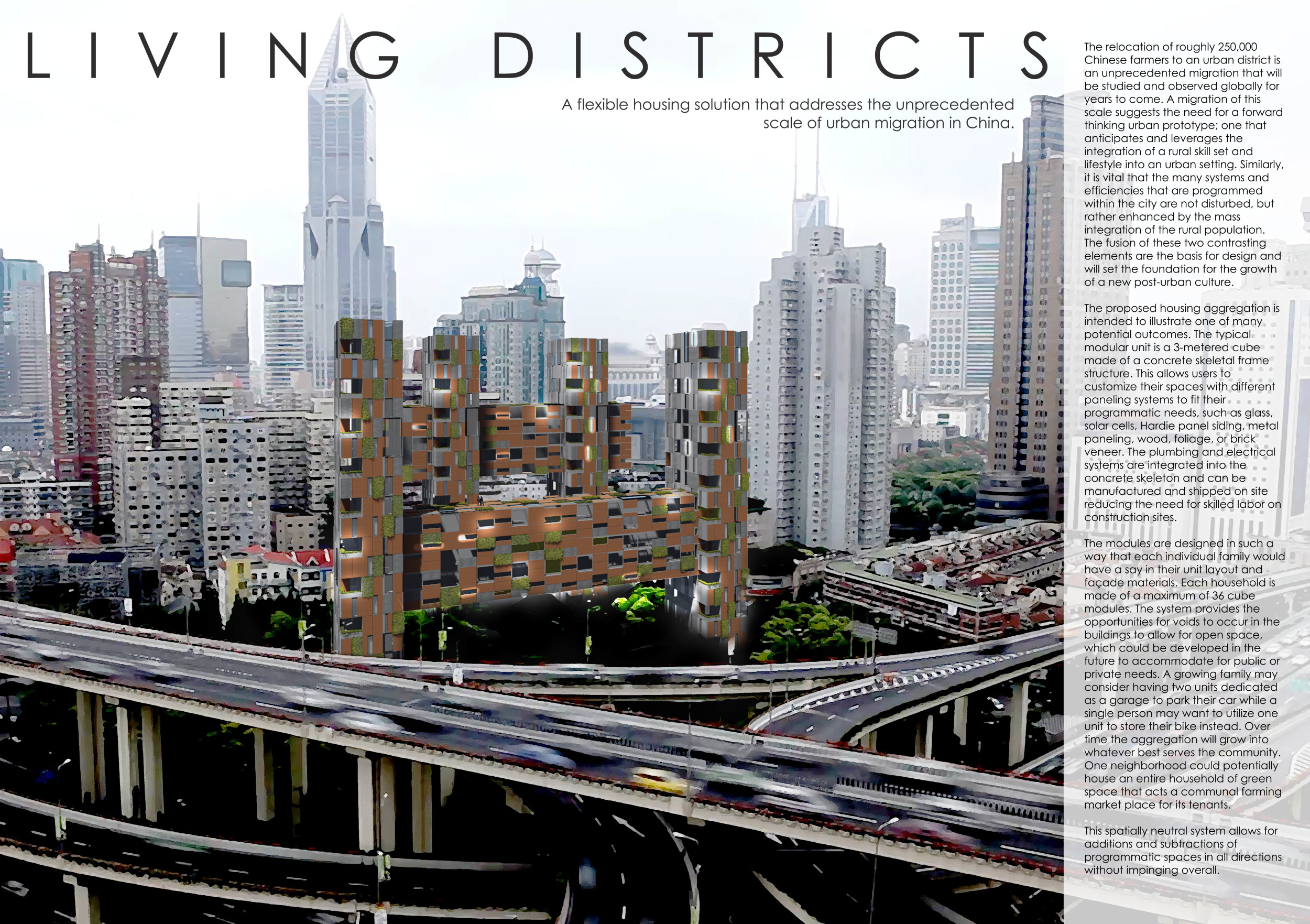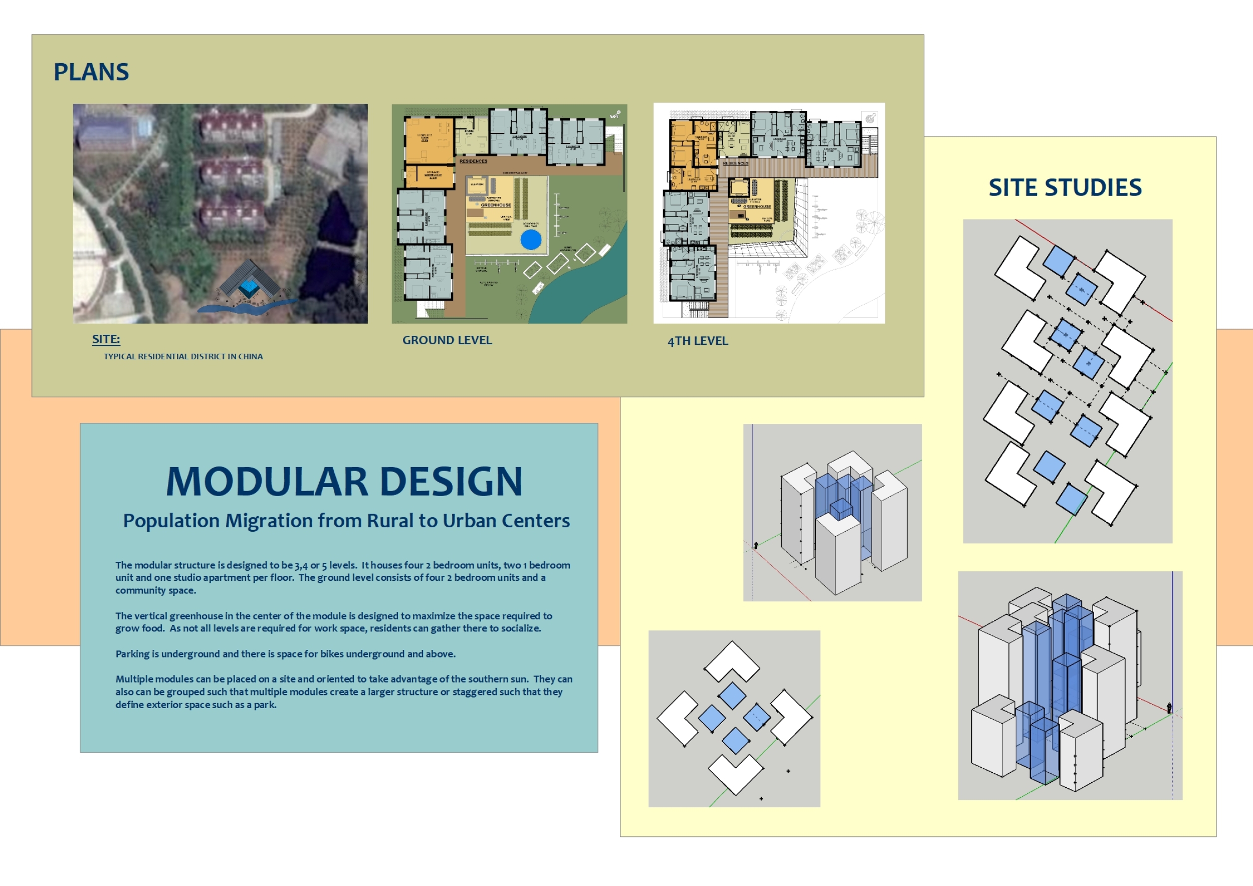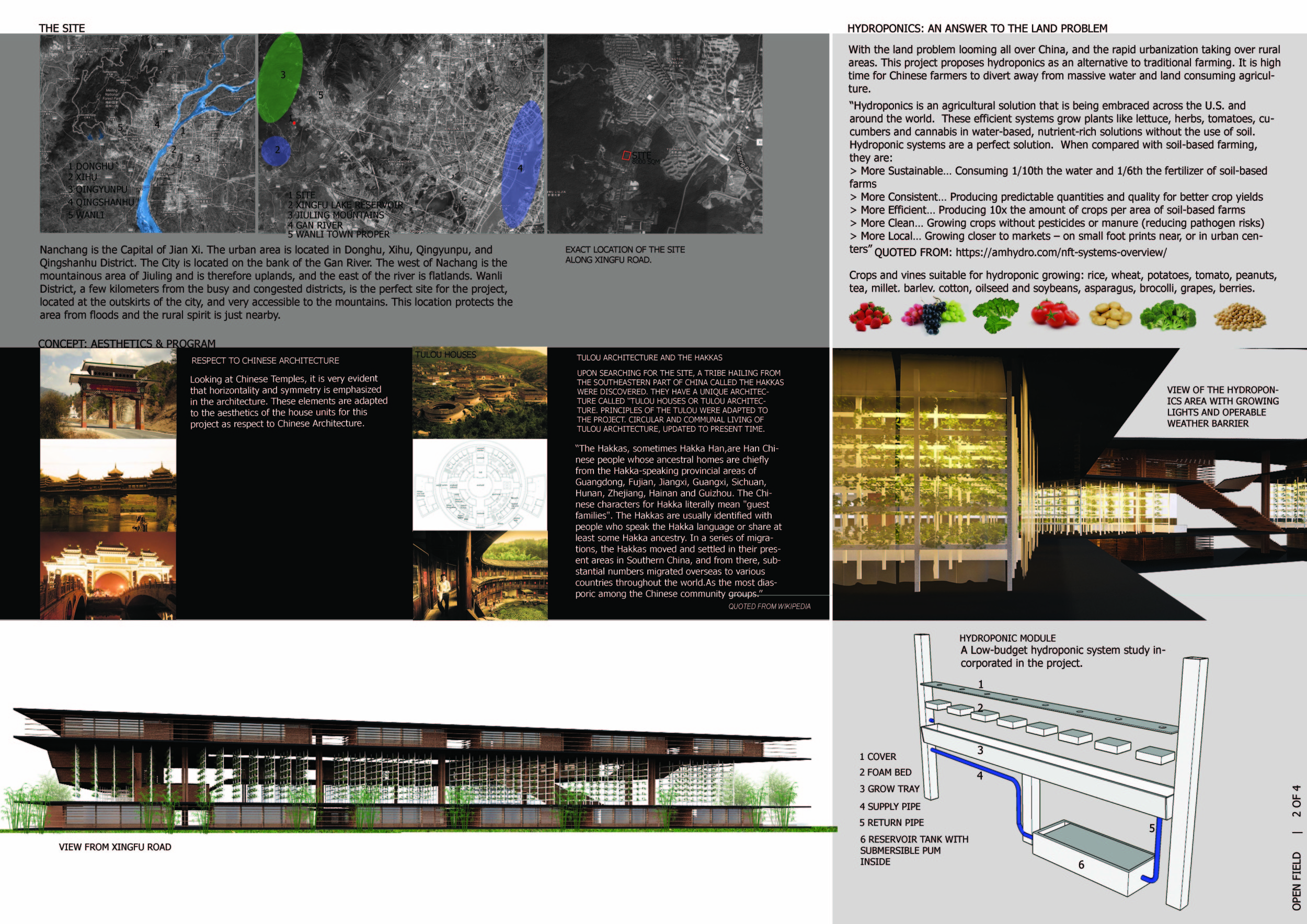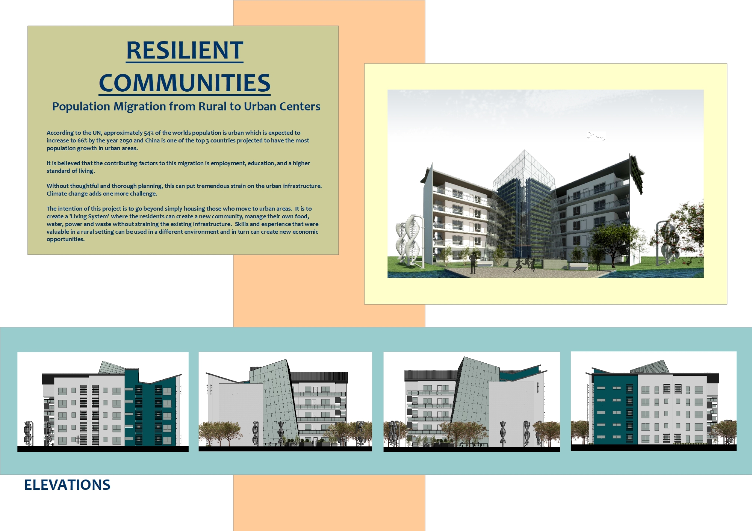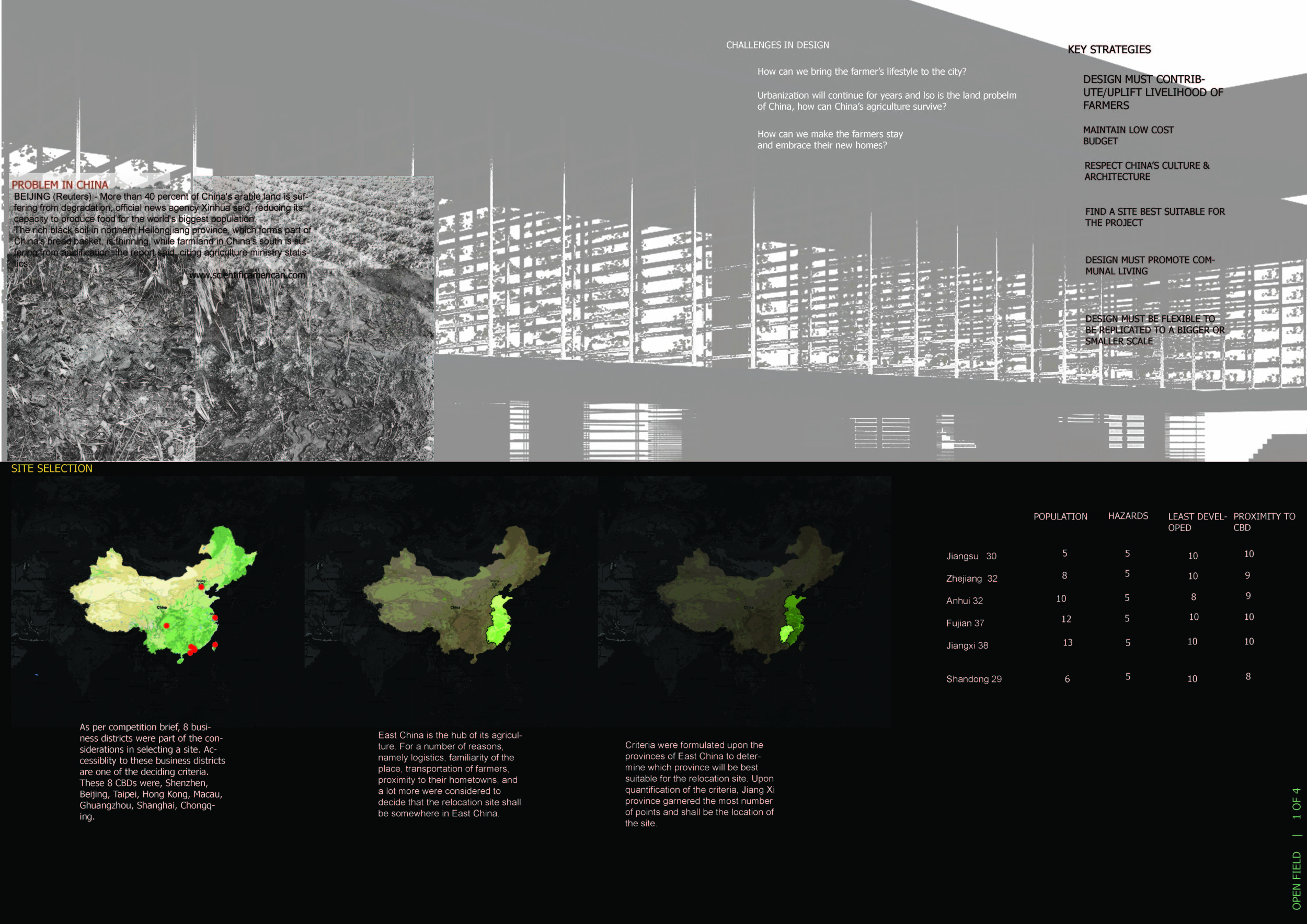 The Community of Farmers Hive presents an environmentally-conscious solution to the relocation of rural farmers to urban cities in China. The Hive is conceptualised as vertically-stacked agricultural plots within cities centres that not only provide communal housing, but also help to grow the green skeleton of the city and act to reduce the effects of heavy pollution.