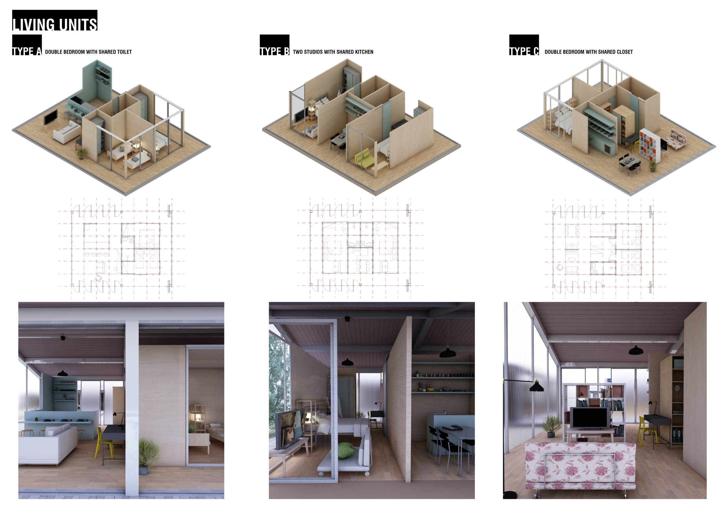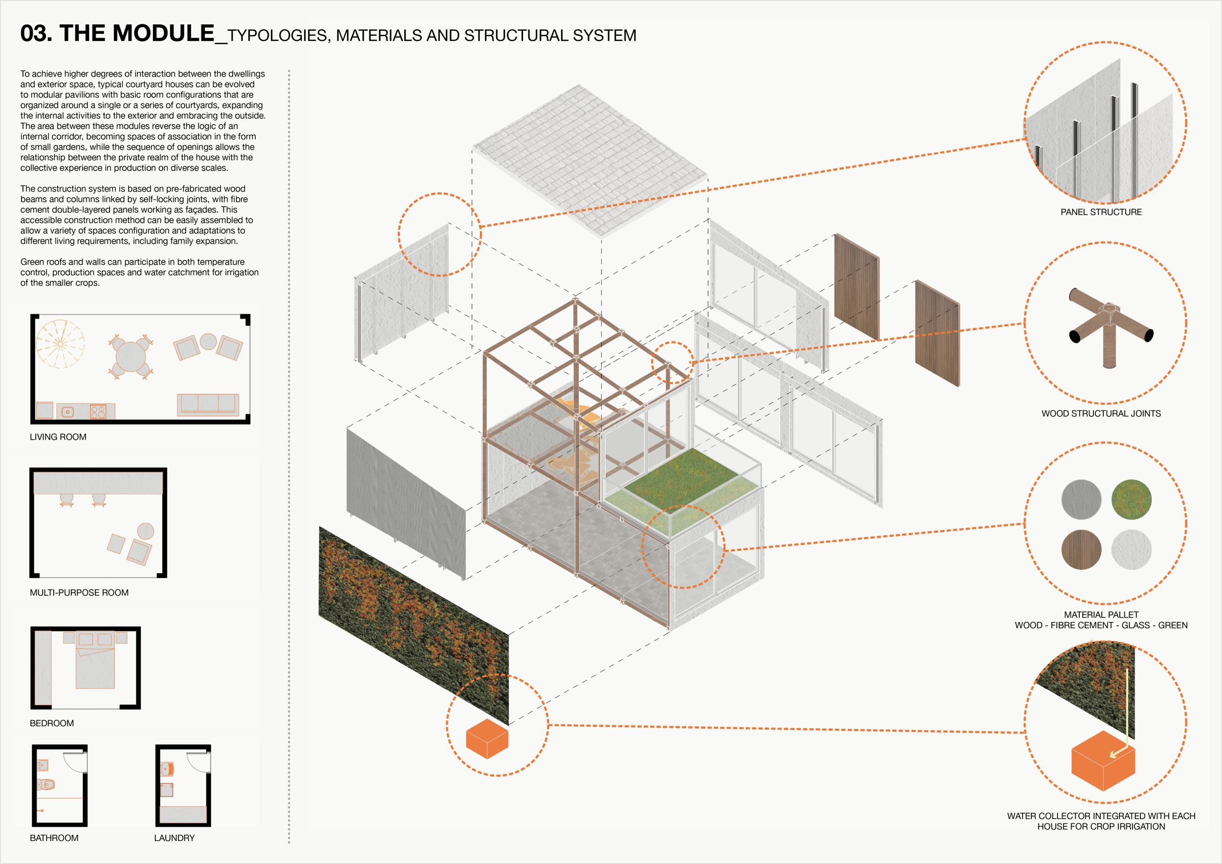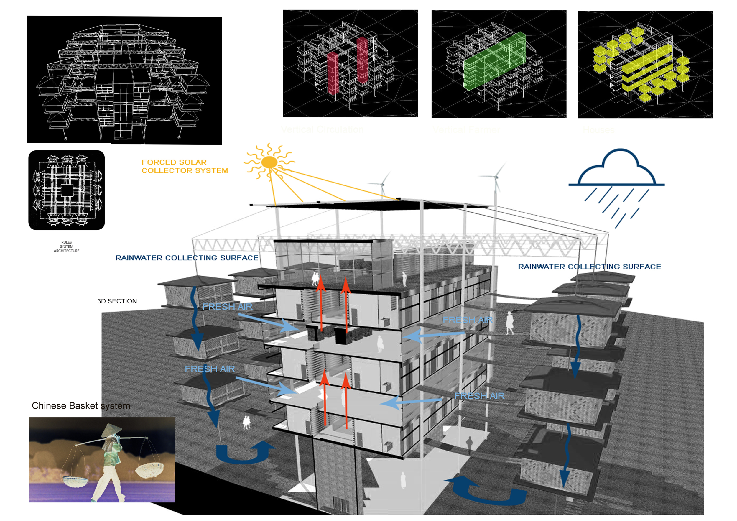 Based on the grid system, the Community of Farmers Hive is also incredibly flexible and adaptable, and can be reconfigured as needed to suit different locations and situations. Its concept creatively tackles several problems, not just the relocation of rural community farmers, but also improving environmental standards and availability of fresh food to urban communities.