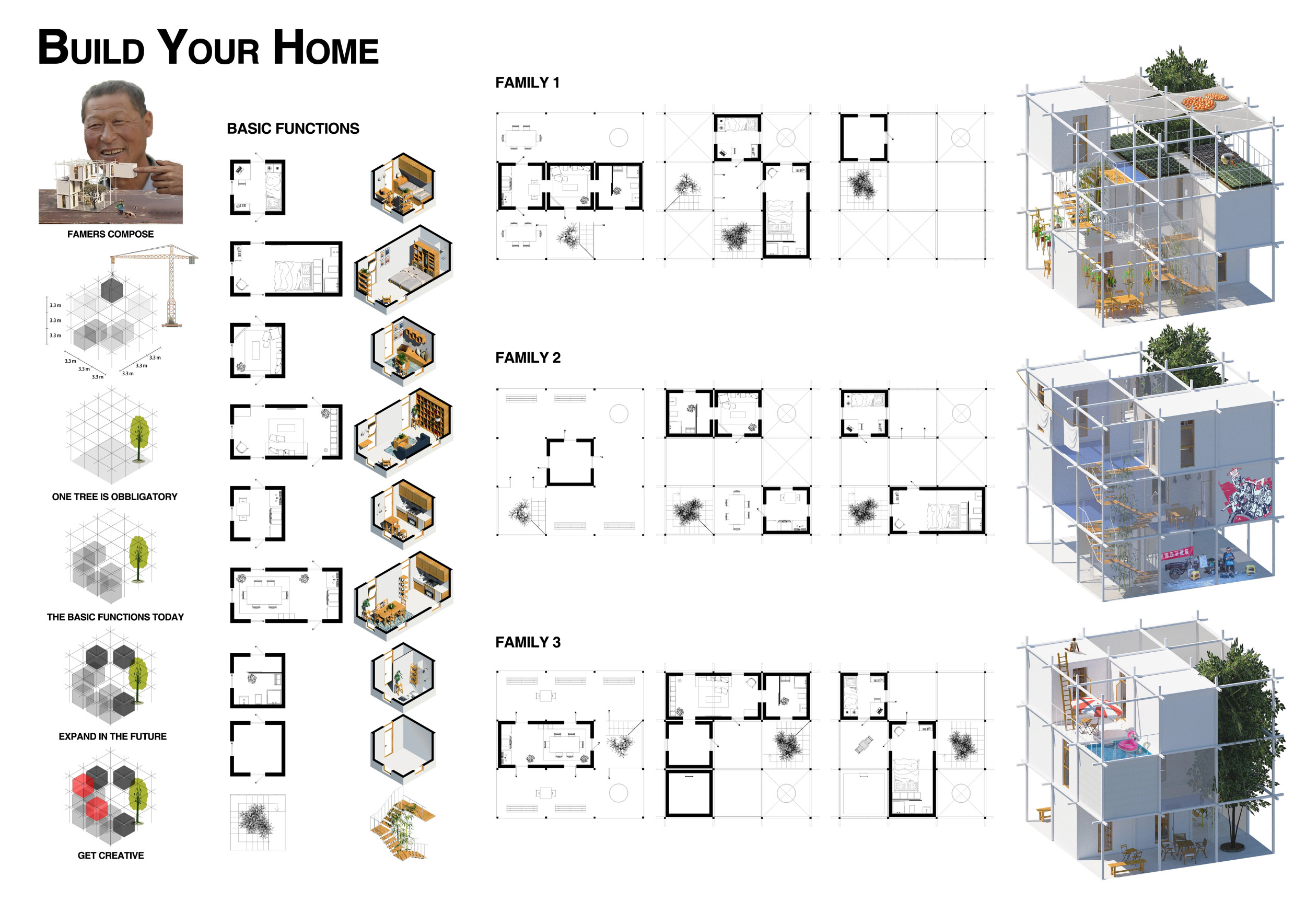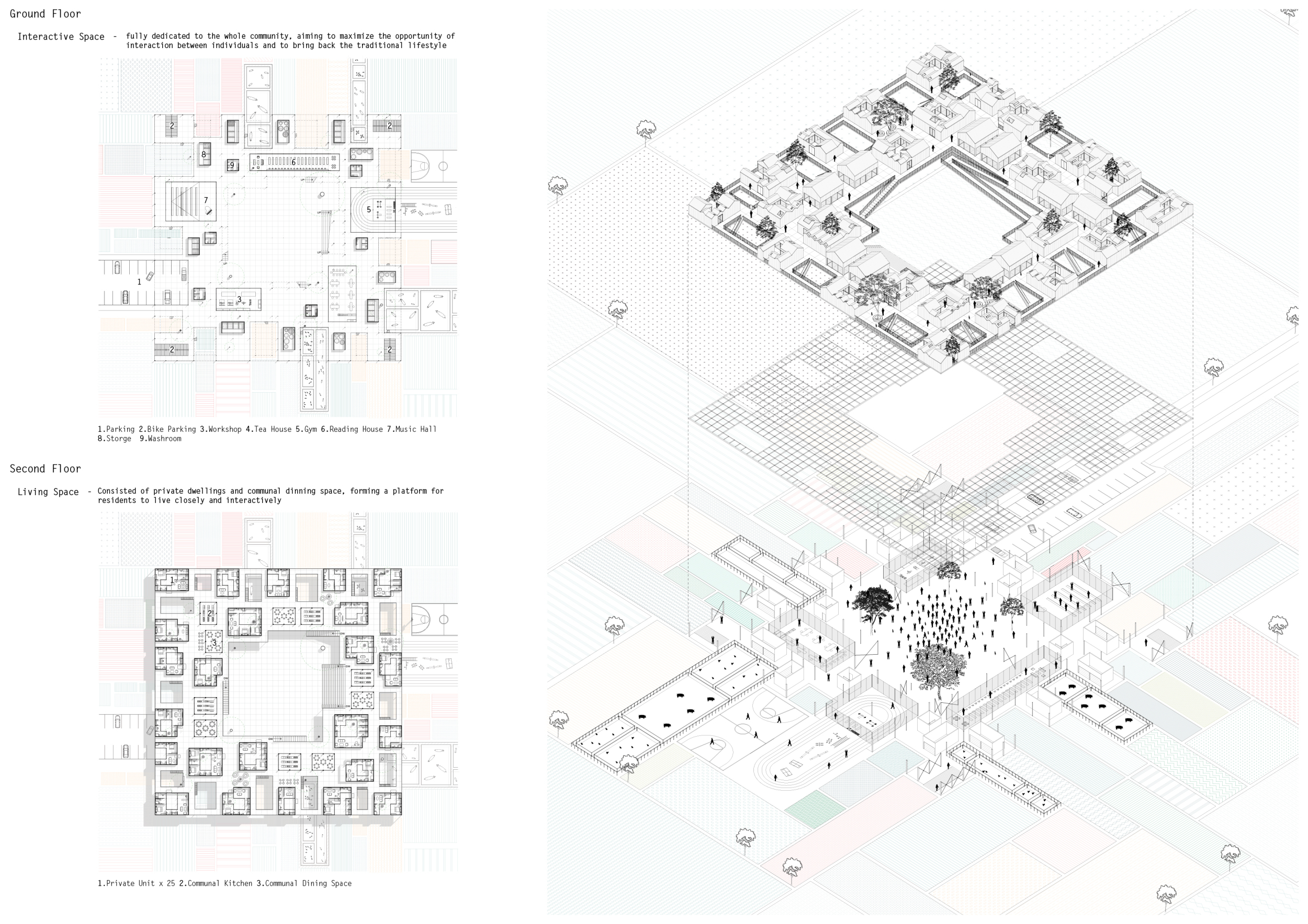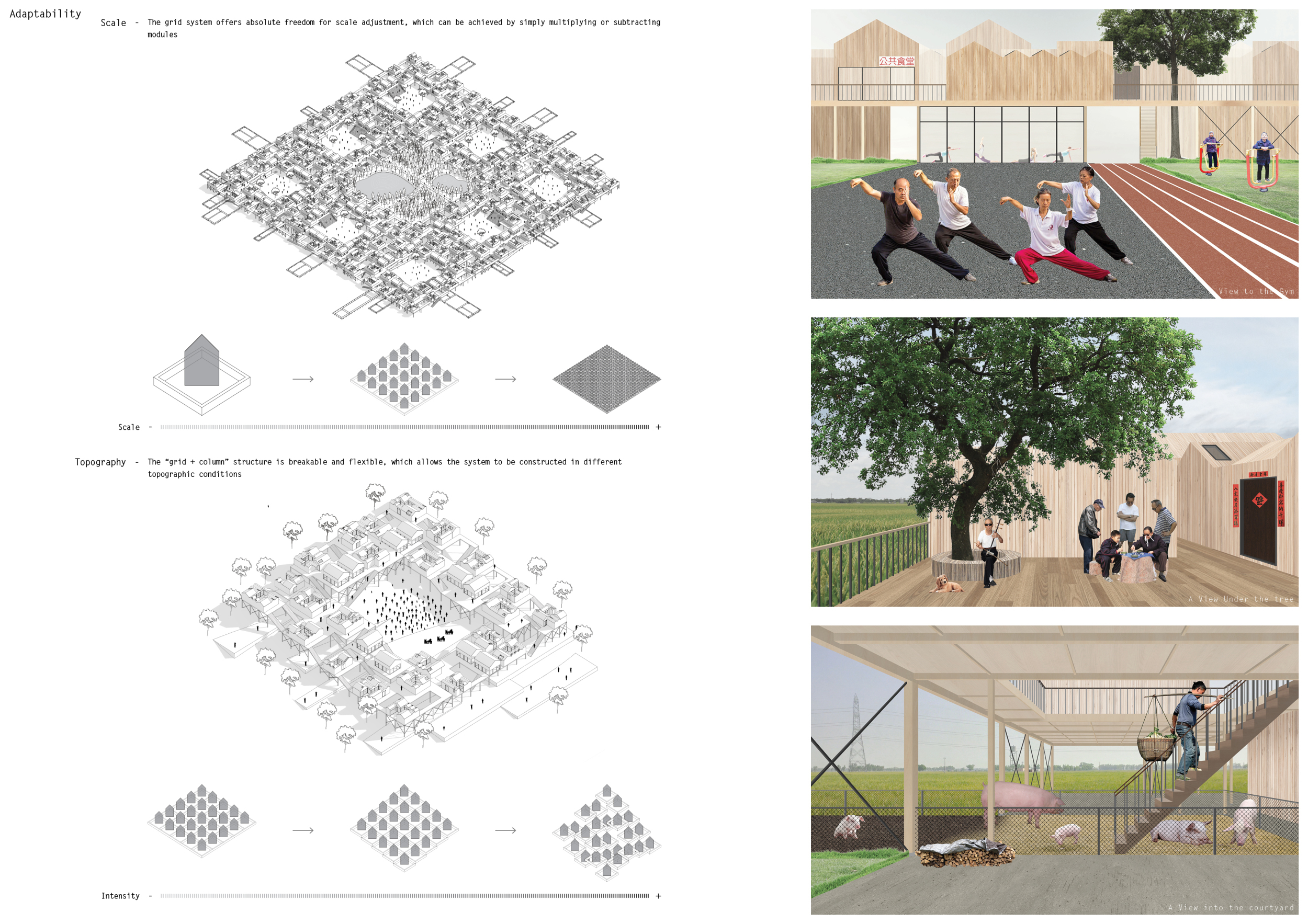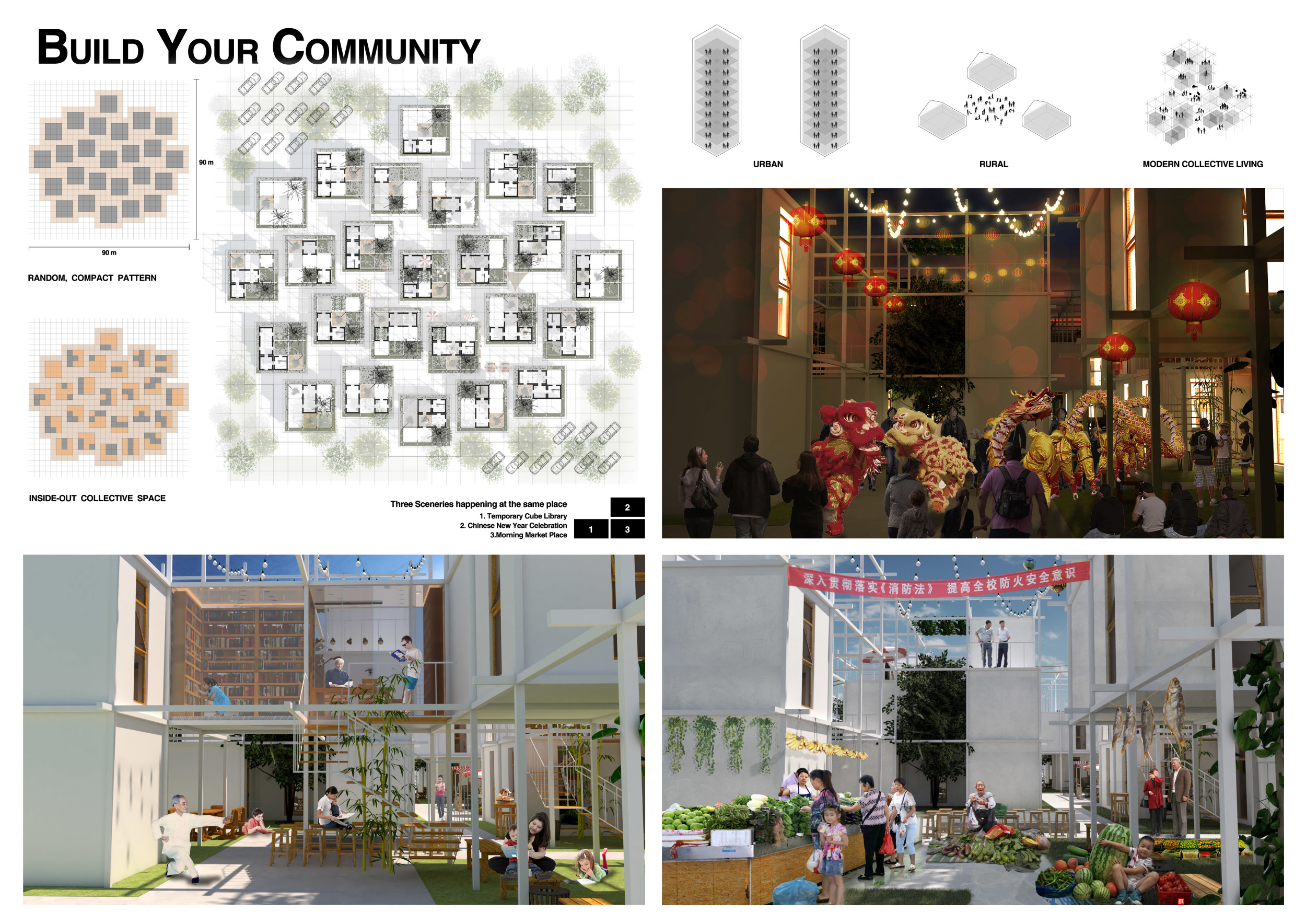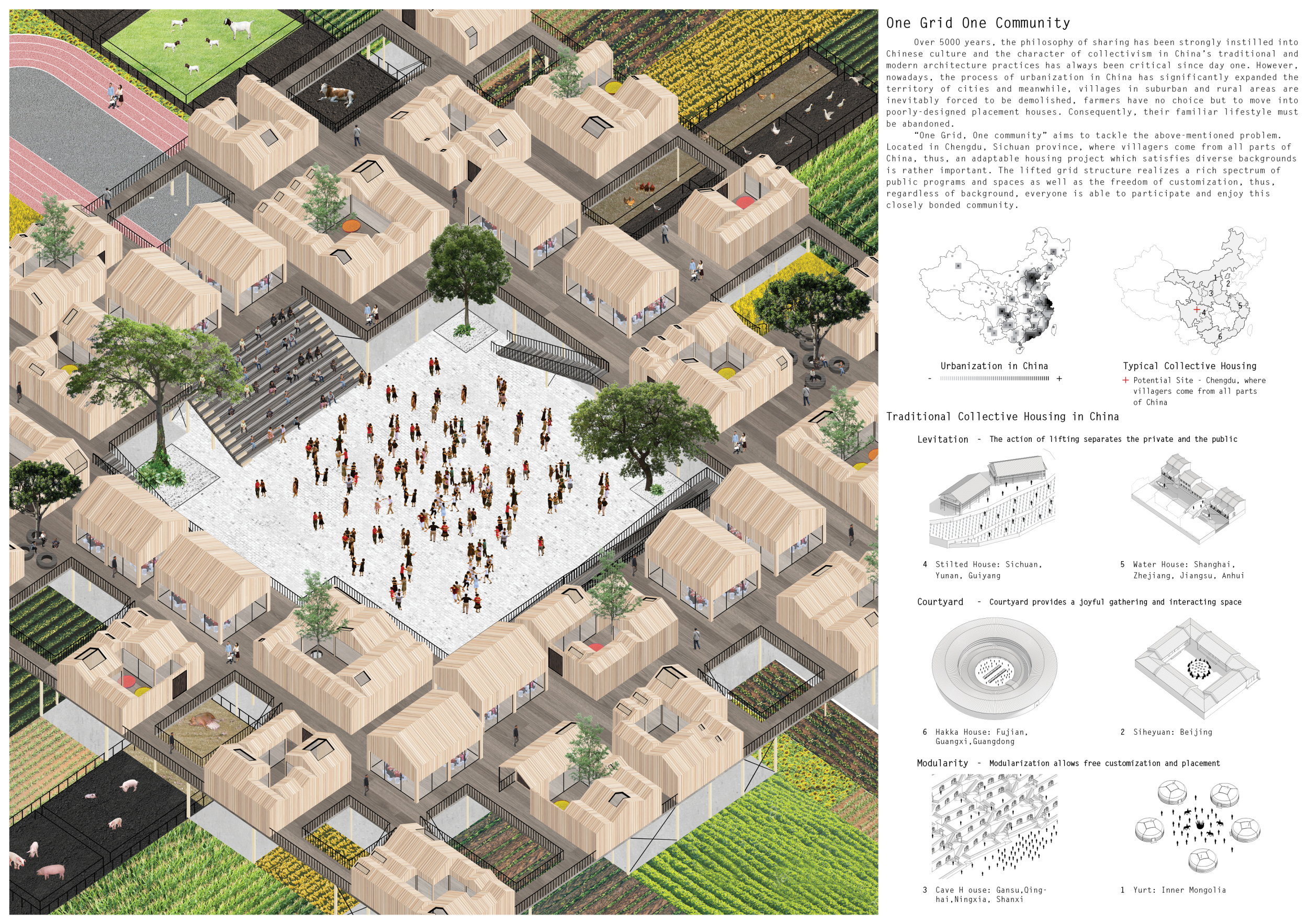 The One Grid, One Community project tackled the competition brief with a specific location in mind. Hypothetically-located in Chengdu, Sichuan Province, this lifted grid structure would be an adaptable housing project in a region in which villagers come from many different parts of the country. Read more The One Grid, One Community project uses levels to separate the private from the public, realising a rich spectrum, of public programs and spaces, as well as giving the community the freedom for customisation. It is set to the principles that everyone, regardless of their background, is able to participate and enjoy the closely-bonded community.