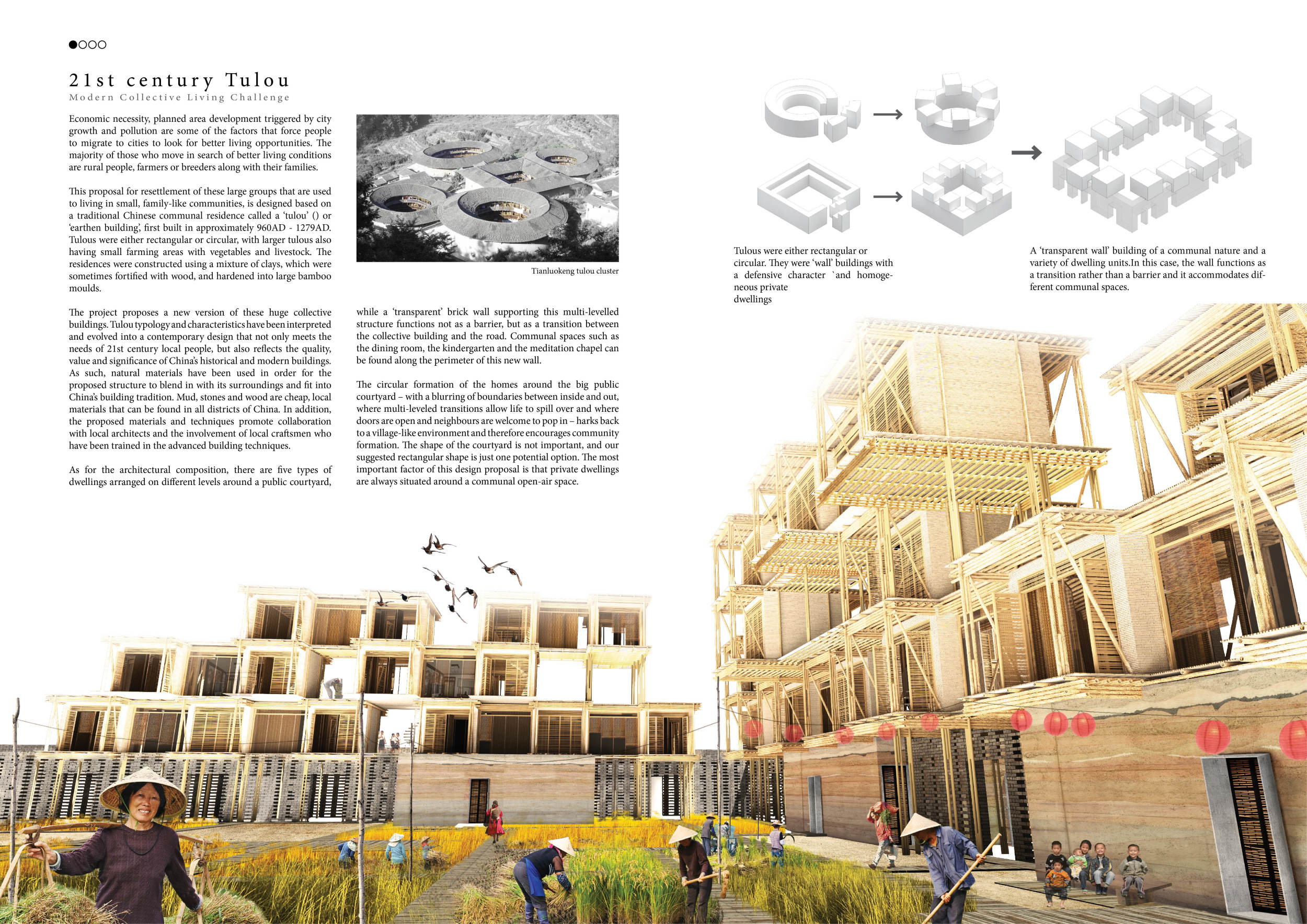Based on a Chinese communal residence called a ‘tulou’ - or ‘earthen building’ - that was typical of the region in from 960 - 1279 AD, the 21st Century Tulou project was chosen by the panel for its flexibility and adaptability towards community needs. The evolved characteristics of the tulou still utilise natural materials, allowing the structure to blend in with its surroundings as well as fitting in with rural Chinese traditions.