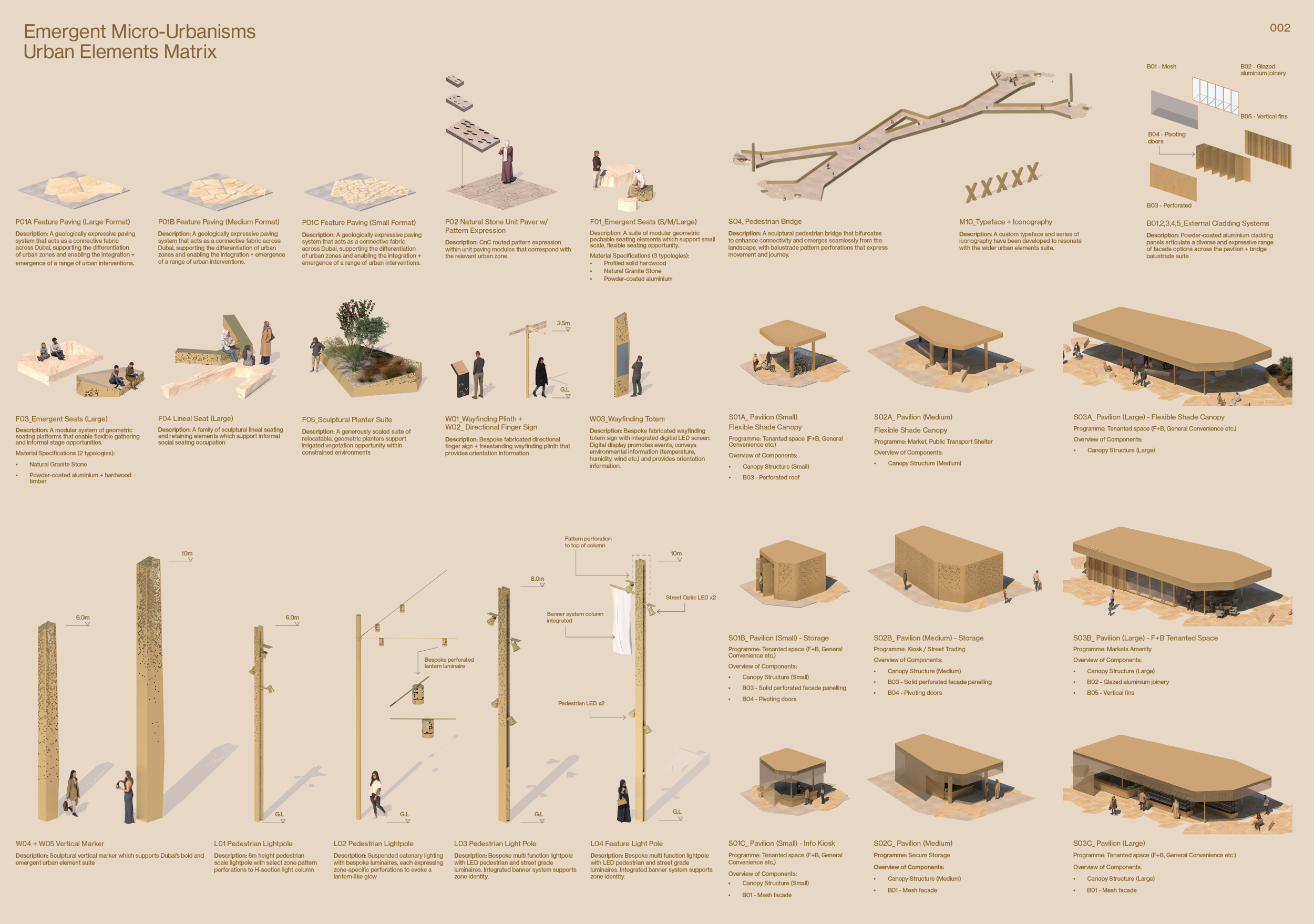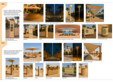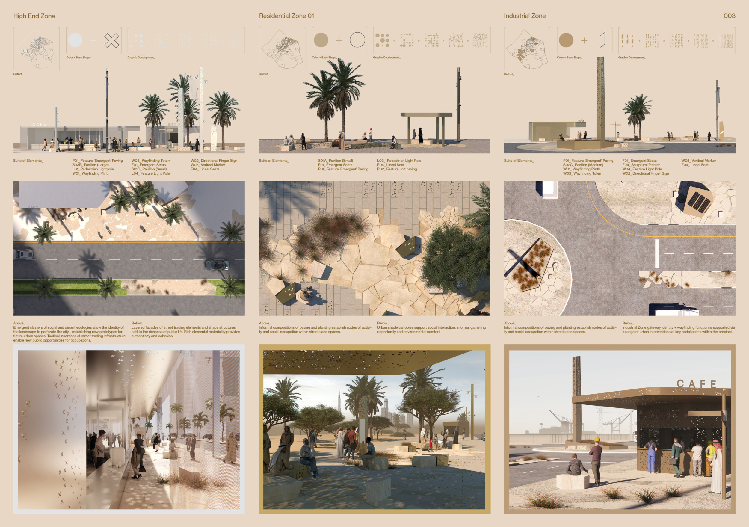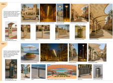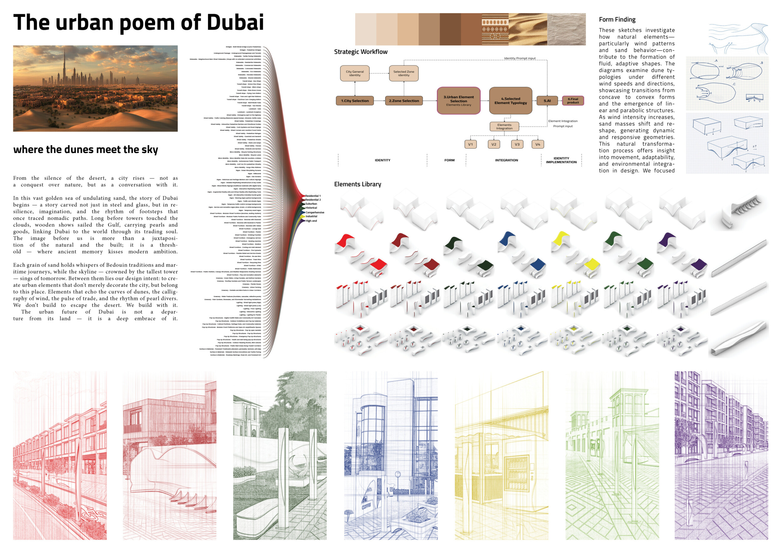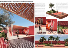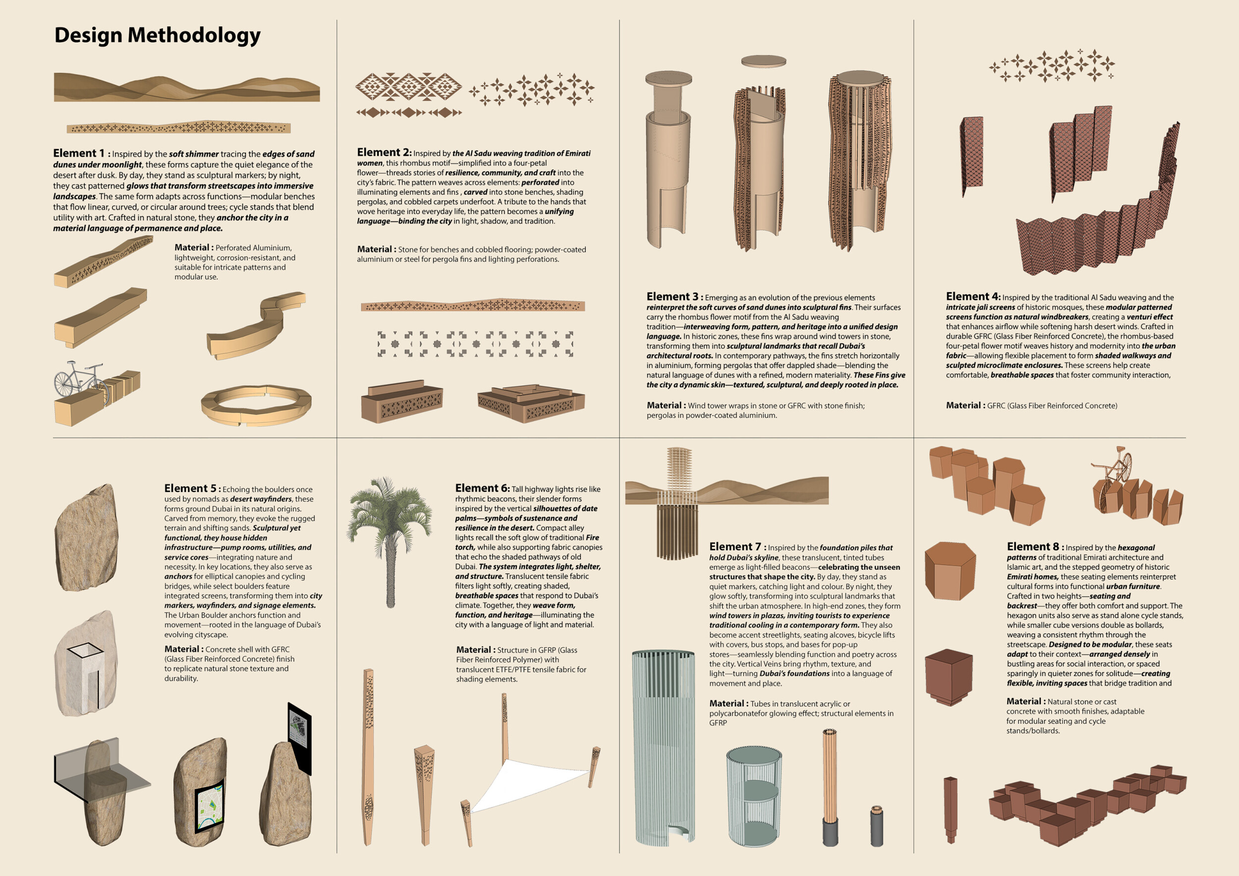 This project establishes a modular system of urban elements grounded in Dubai’s geology, ecology, and vernacular spatial systems. A comprehensive design strategy is first outlined through seven thematic lenses, from geological sands and socio-economic infrastructures to adaptive futures, before translating these into an urban design matrix of over 25 site-specific elements. Read more These include textured concrete pavers, extruded aluminum light poles with pattern perforations, mesh-clad pavilions, linear seating, and sculptural planters. Each item is assigned a color gradient based on sand hues, and a pattern logic that responds to local climatic conditions and neighborhood identities. Zones across the city receive tailored suites of elements that assemble into streetscapes emphasizing porosity, shade, and pedestrian connectivity.
