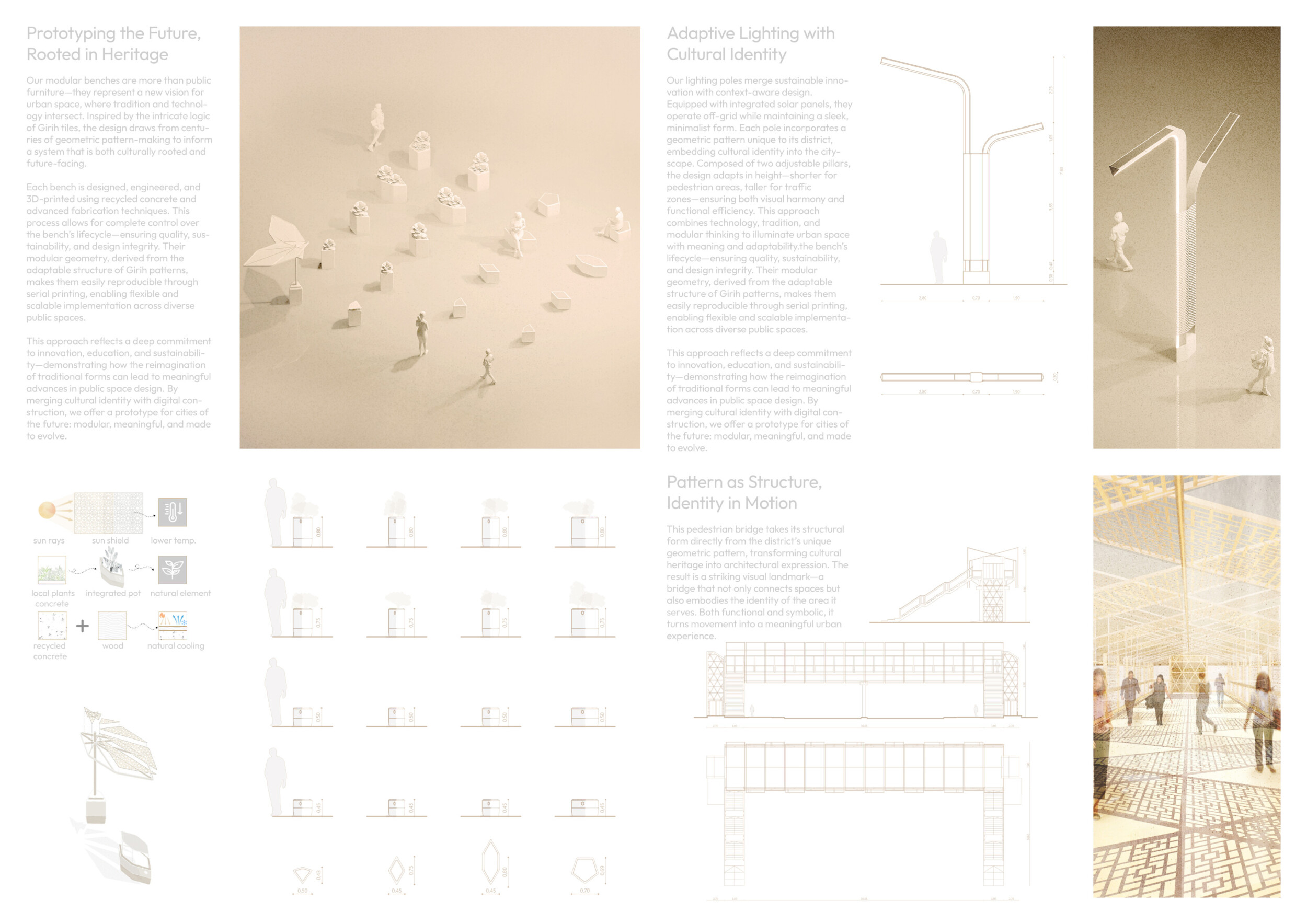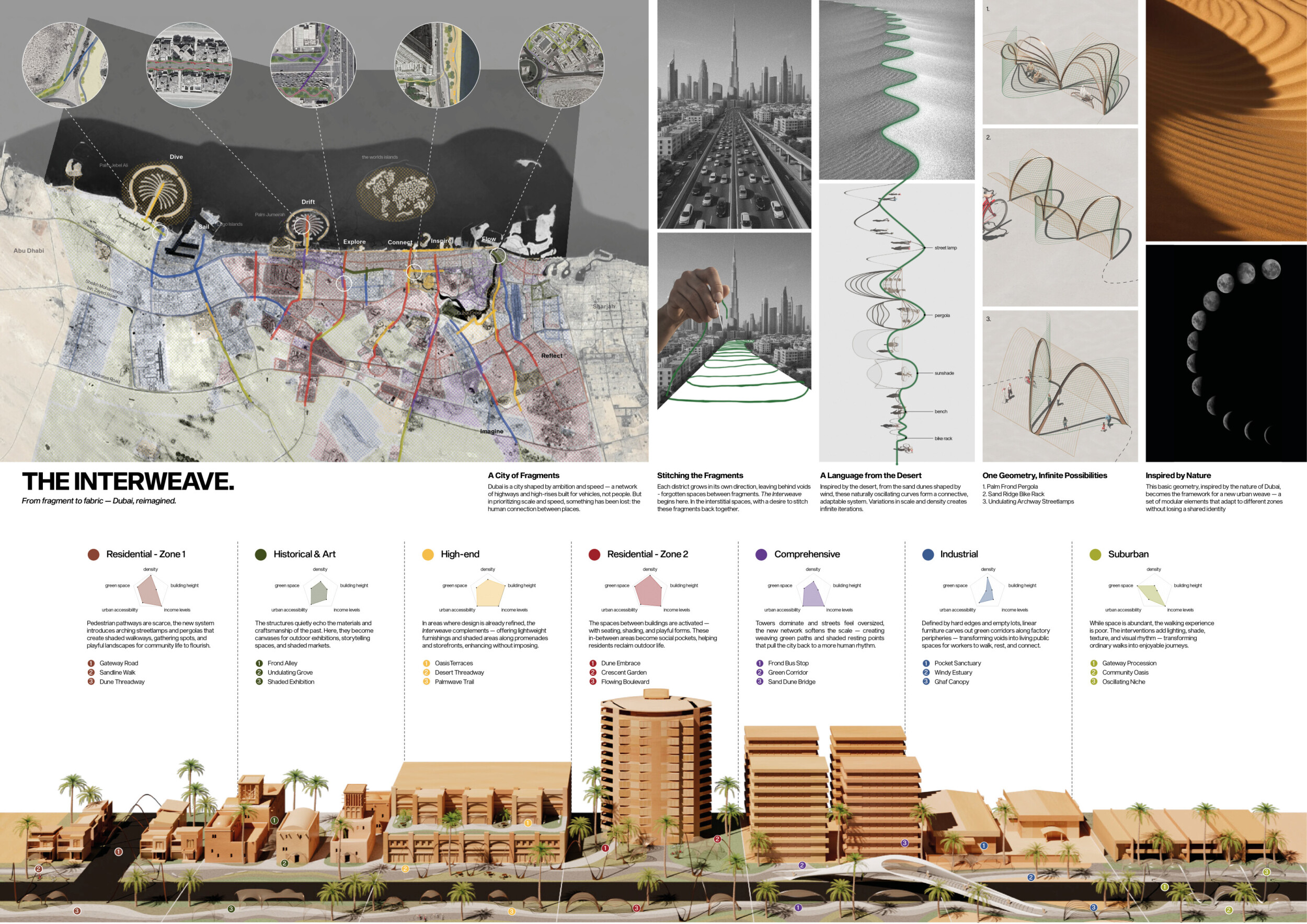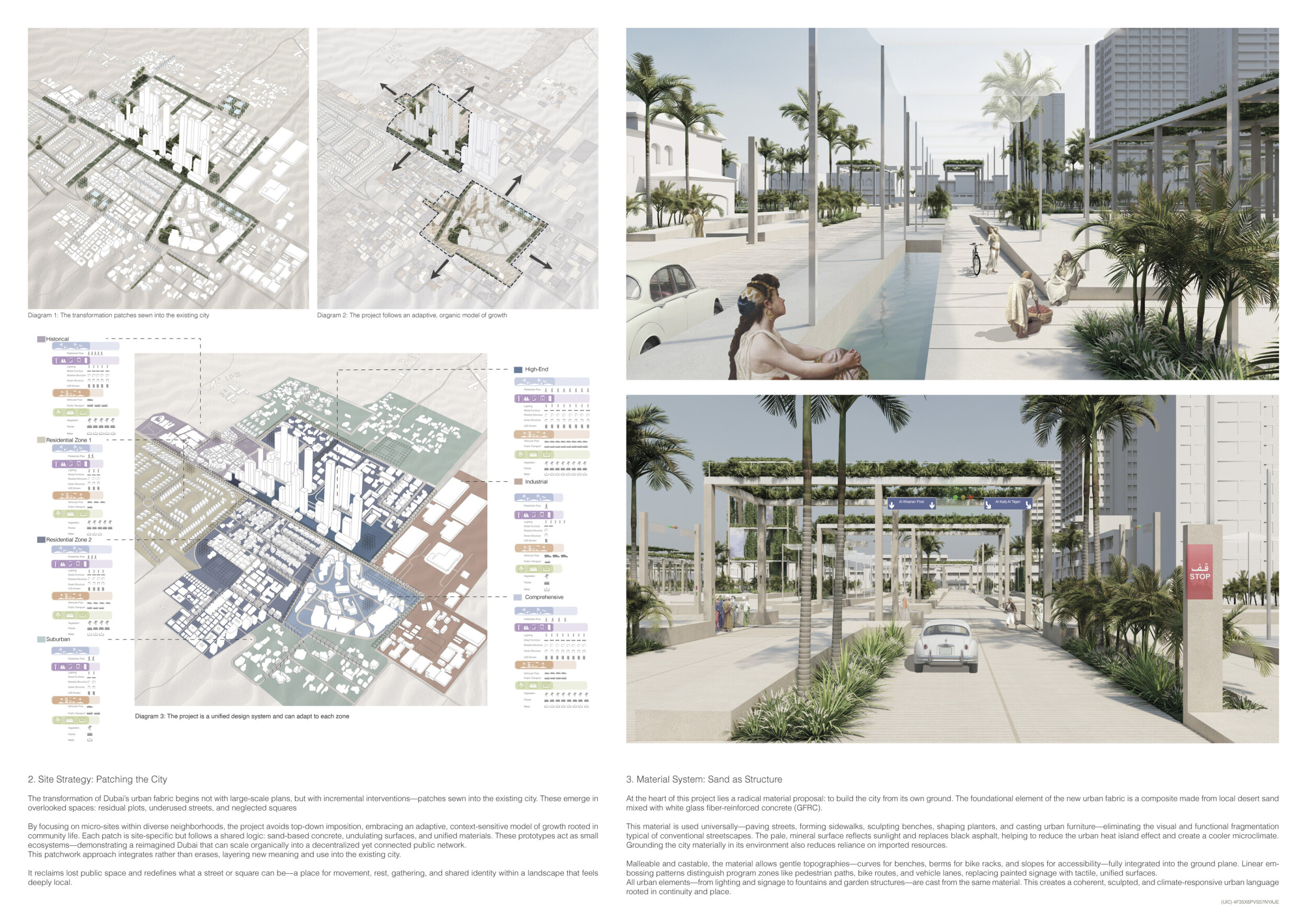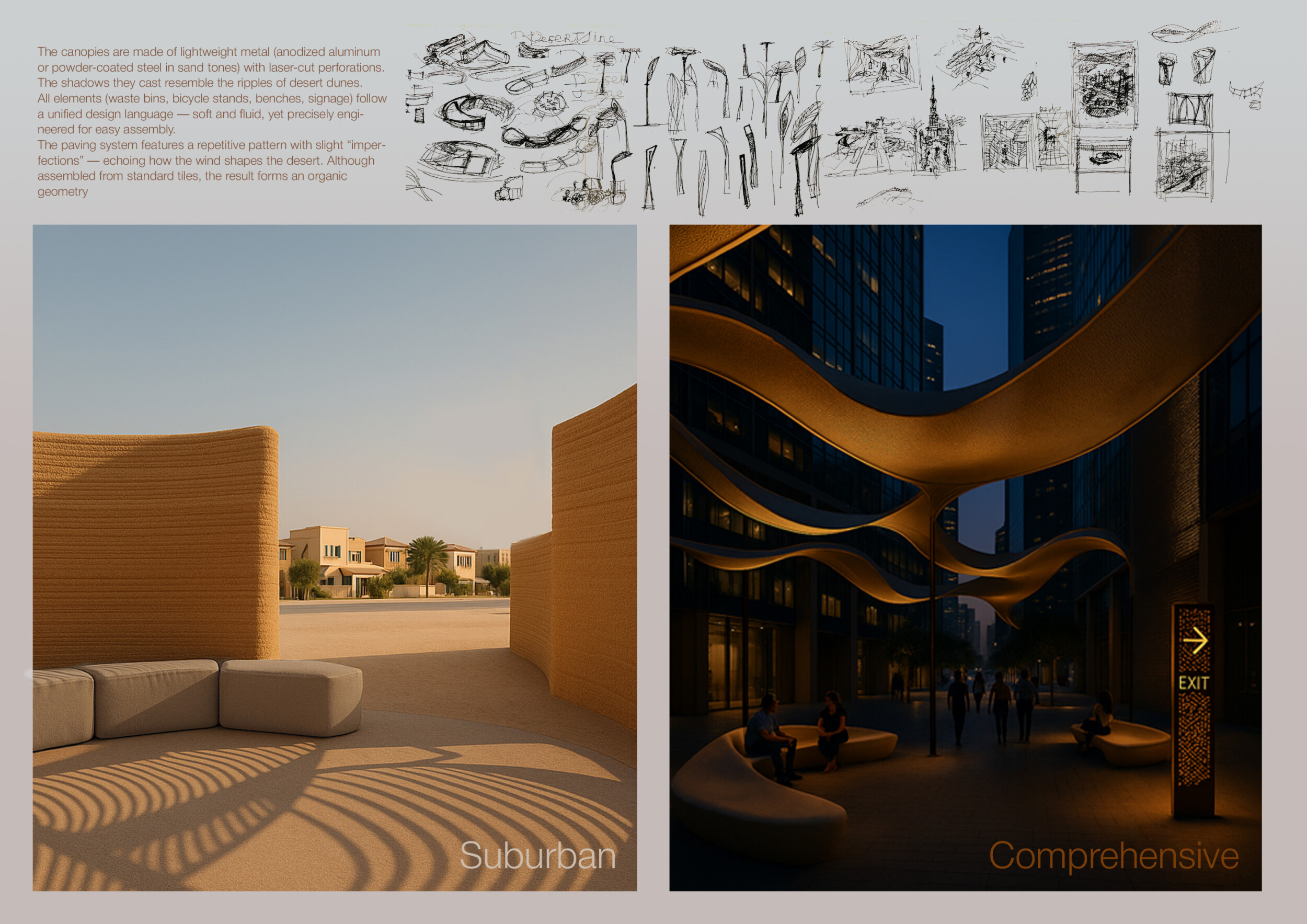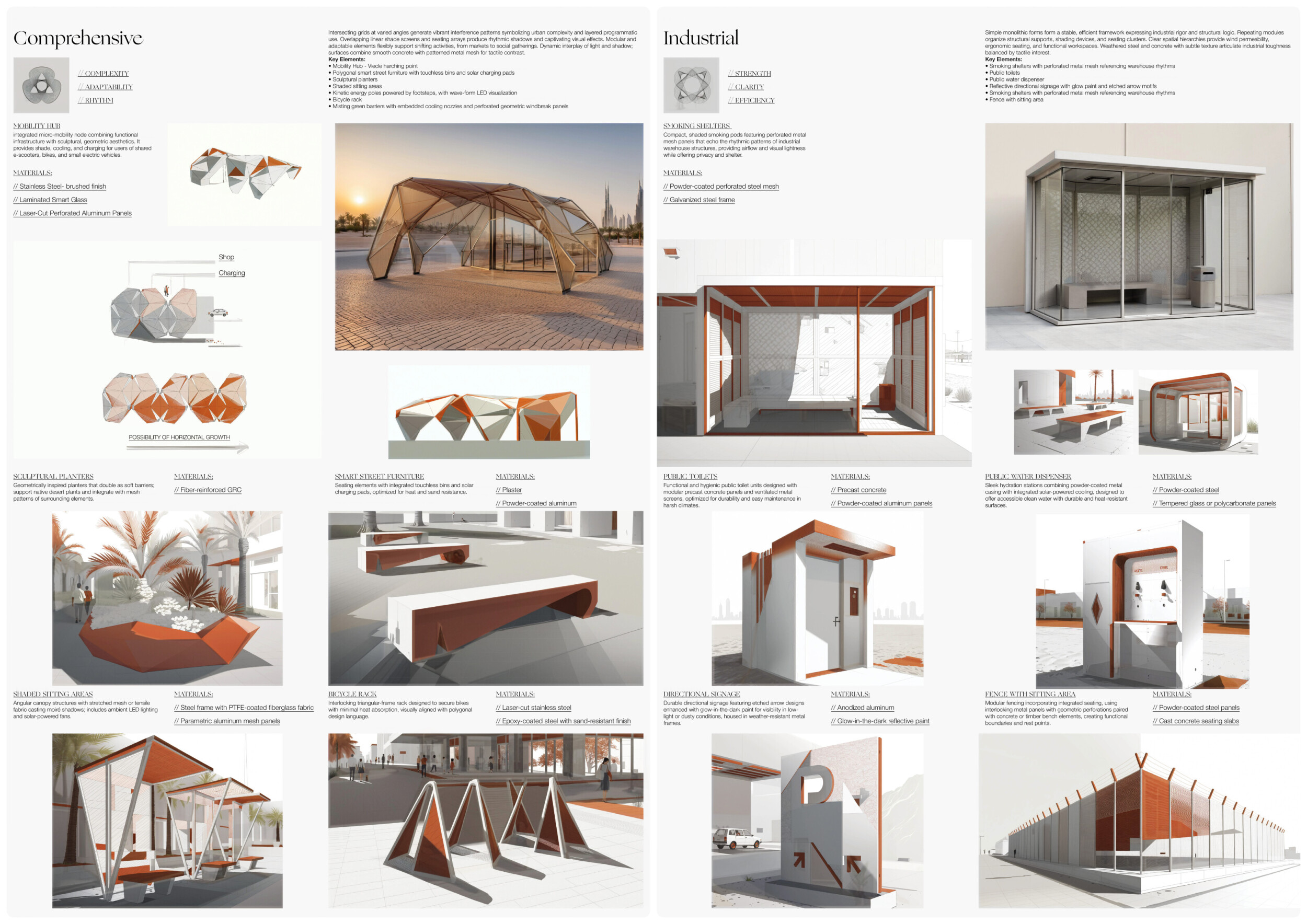 This project establishes a modular system of urban elements grounded in Dubai’s geology, ecology, and vernacular spatial systems. A comprehensive design strategy is first outlined through seven thematic lenses, from geological sands and socio-economic infrastructures to adaptive futures, before translating these into an urban design matrix of over 25 site-specific elements. Read more These include textured concrete pavers, extruded aluminum light poles with pattern perforations, mesh-clad pavilions, linear seating, and sculptural planters. Each item is assigned a color gradient based on sand hues, and a pattern logic that responds to local climatic conditions and neighborhood identities. Zones across the city receive tailored suites of elements that assemble into streetscapes emphasizing porosity, shade, and pedestrian connectivity.