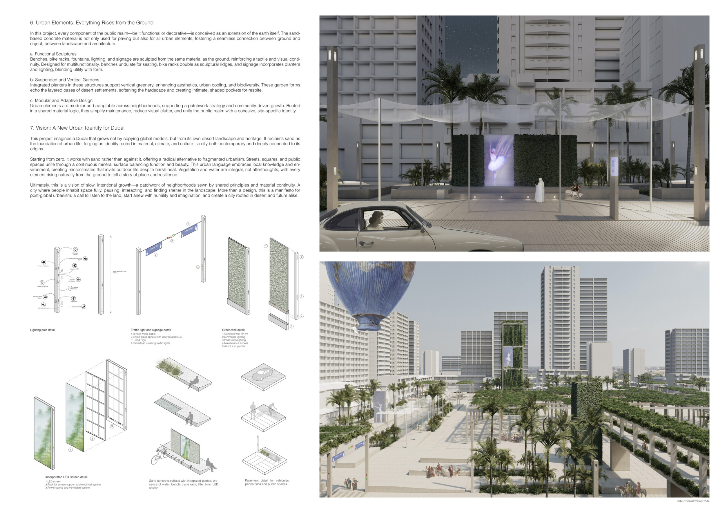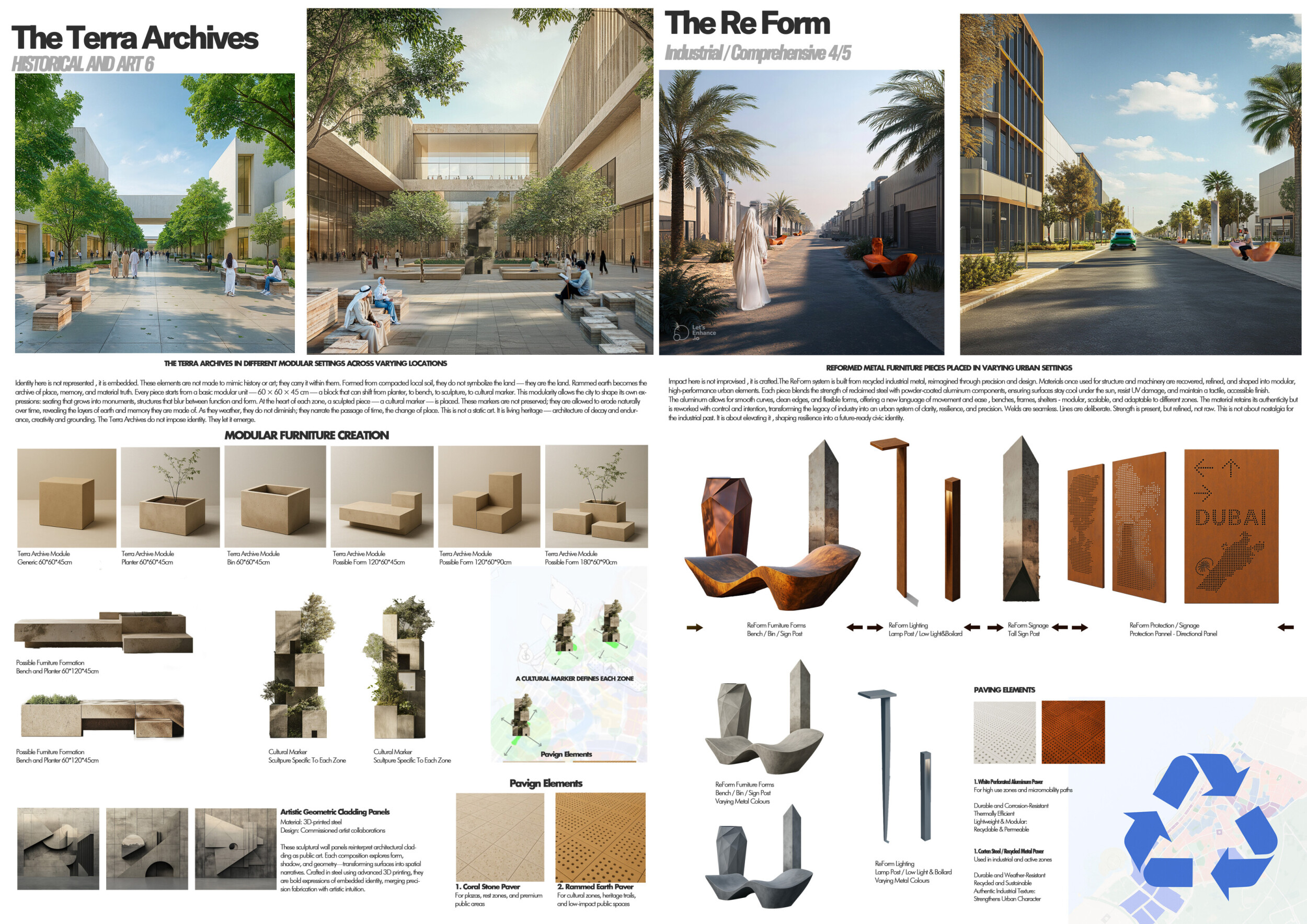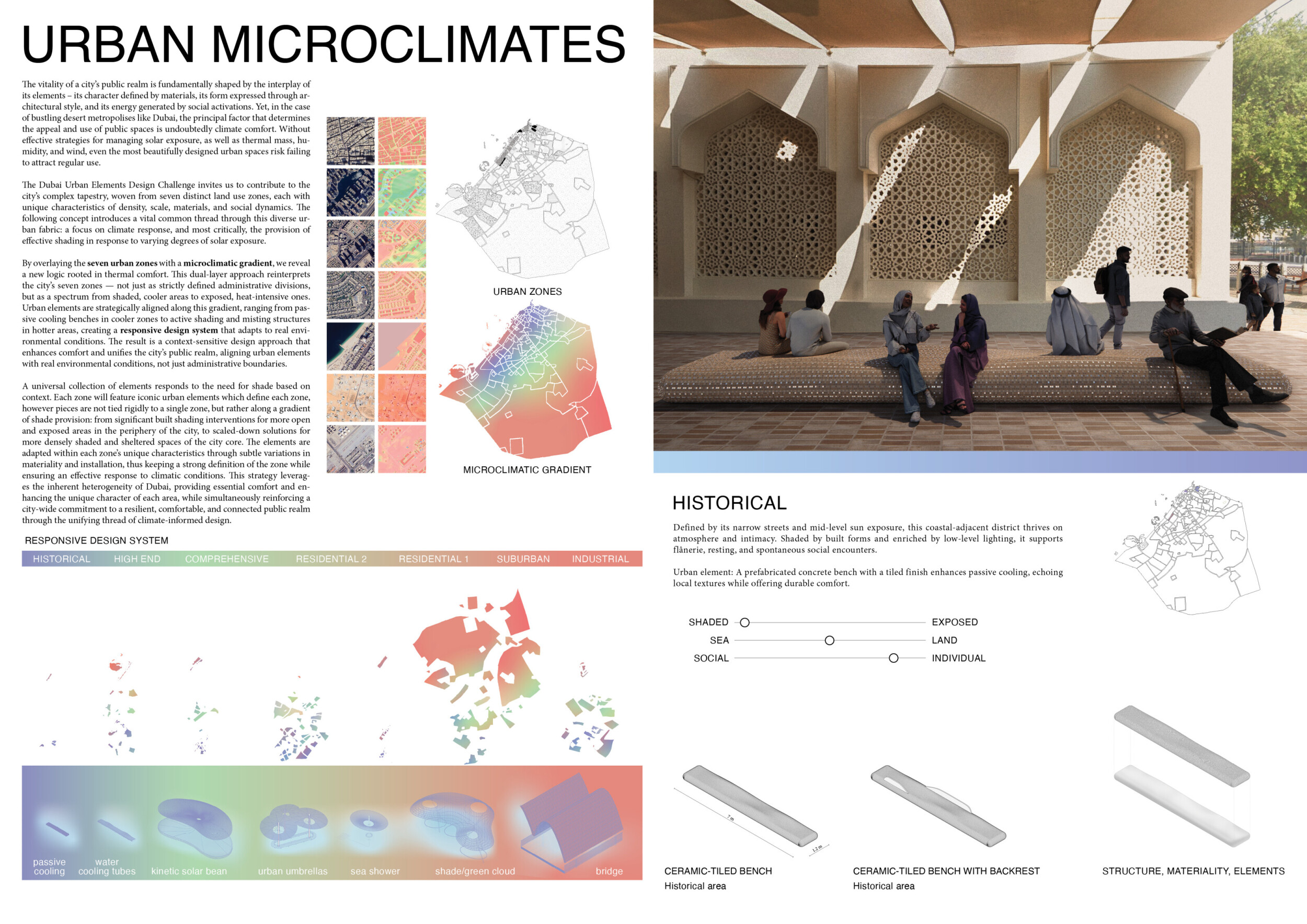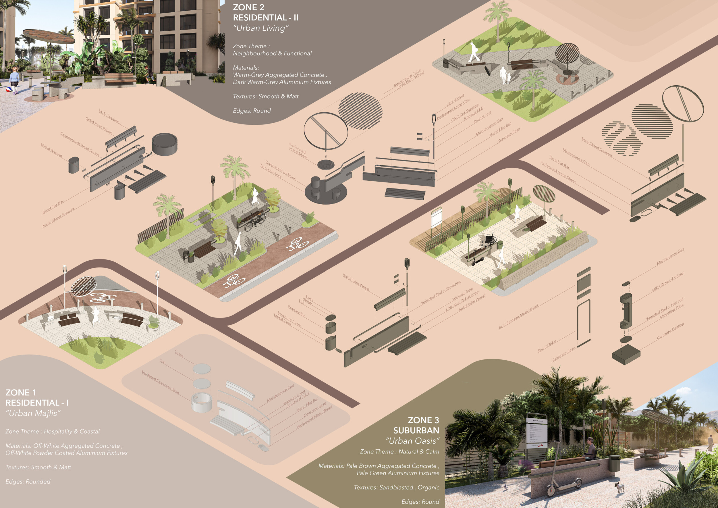 This project establishes a modular system of urban elements grounded in Dubai’s geology, ecology, and vernacular spatial systems. A comprehensive design strategy is first outlined through seven thematic lenses, from geological sands and socio-economic infrastructures to adaptive futures, before translating these into an urban design matrix of over 25 site-specific elements. Read more These include textured concrete pavers, extruded aluminum light poles with pattern perforations, mesh-clad pavilions, linear seating, and sculptural planters. Each item is assigned a color gradient based on sand hues, and a pattern logic that responds to local climatic conditions and neighborhood identities. Zones across the city receive tailored suites of elements that assemble into streetscapes emphasizing porosity, shade, and pedestrian connectivity.