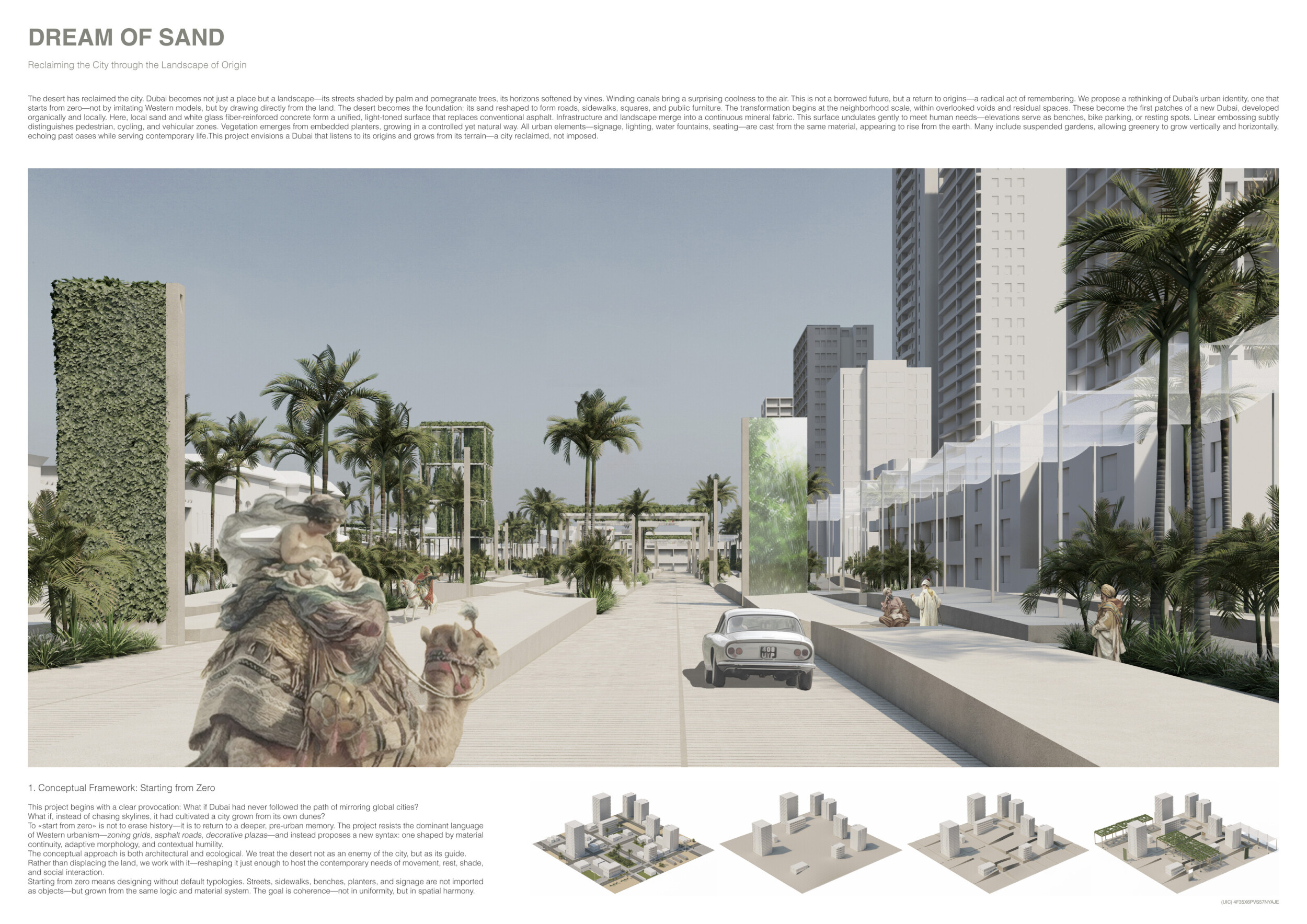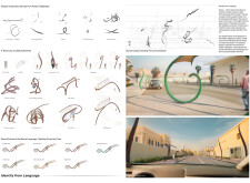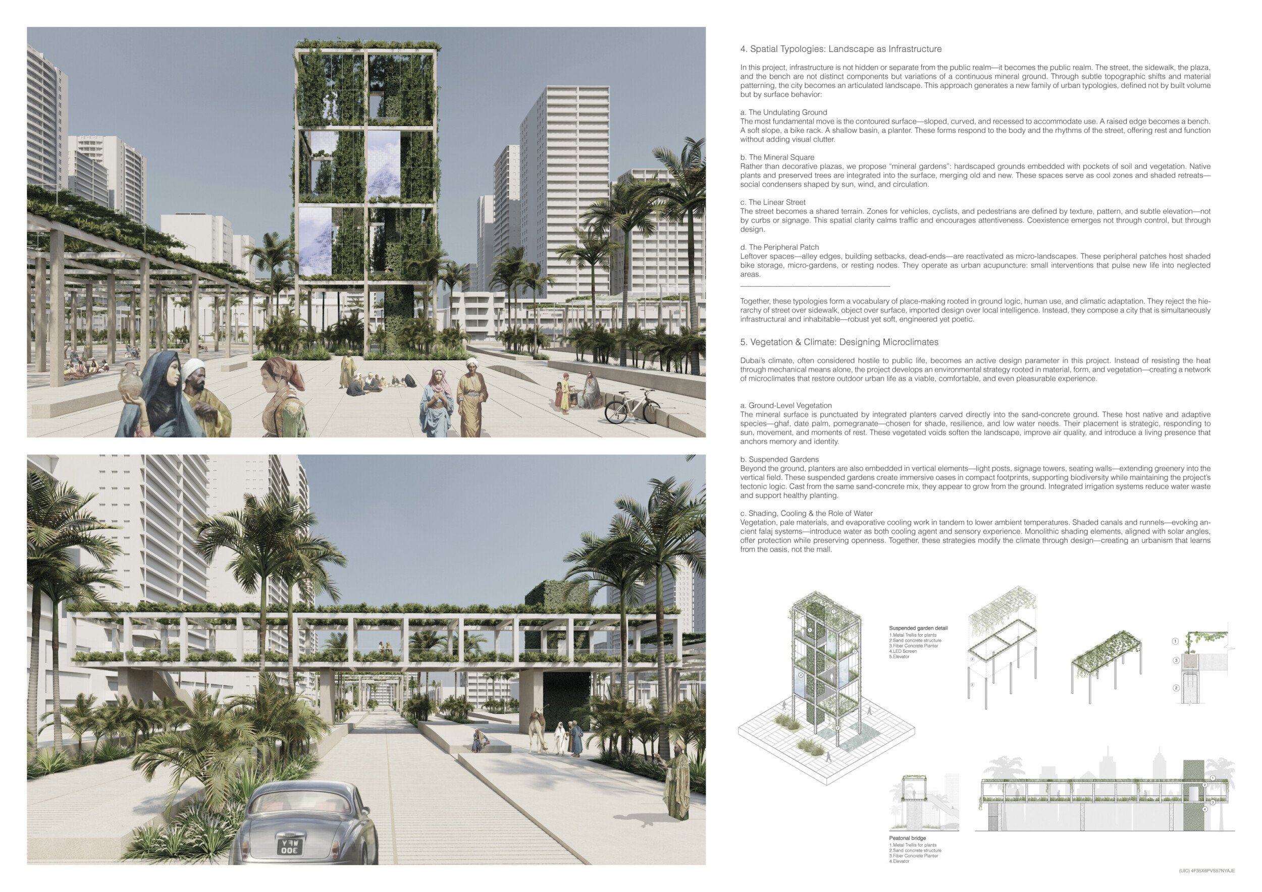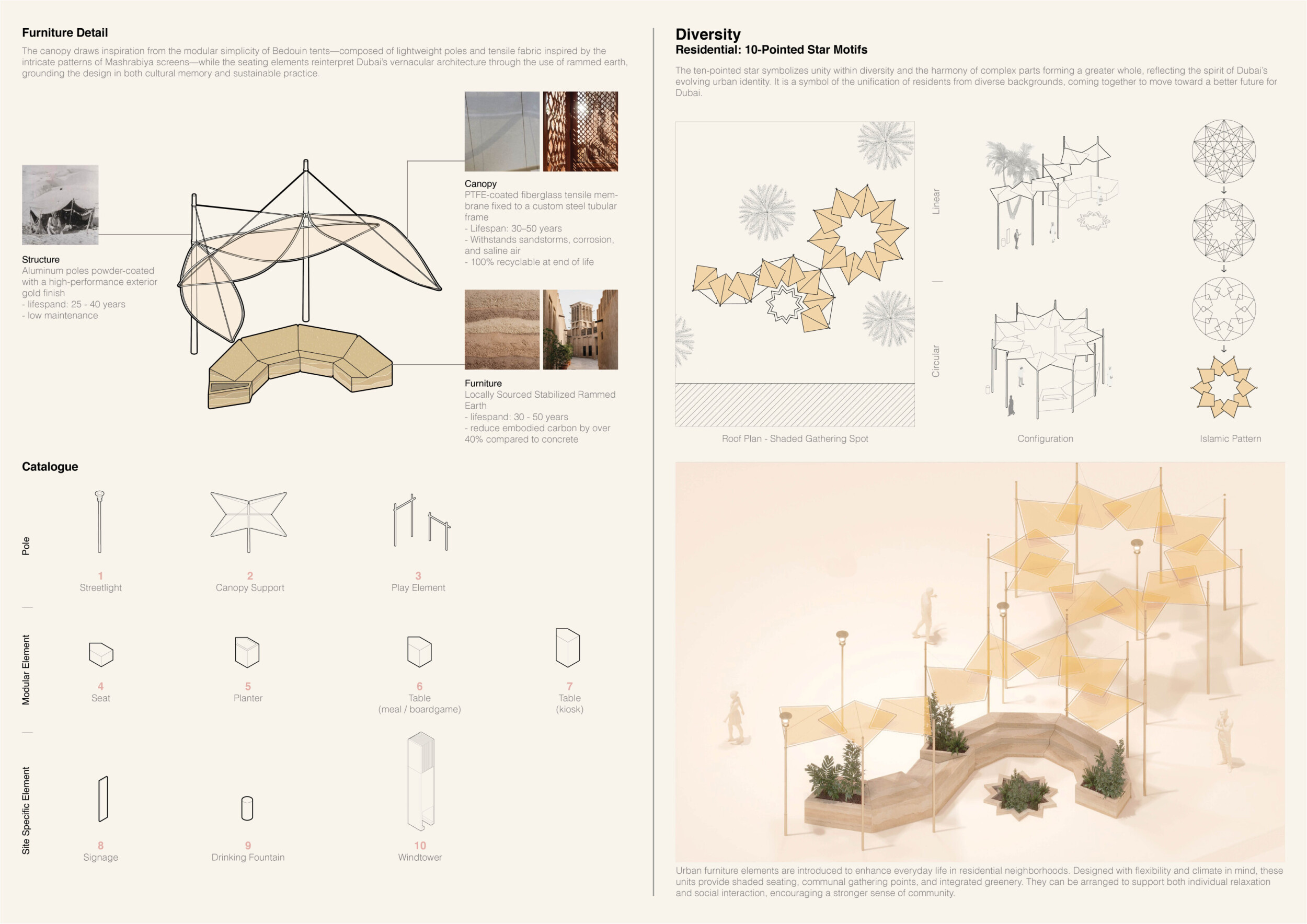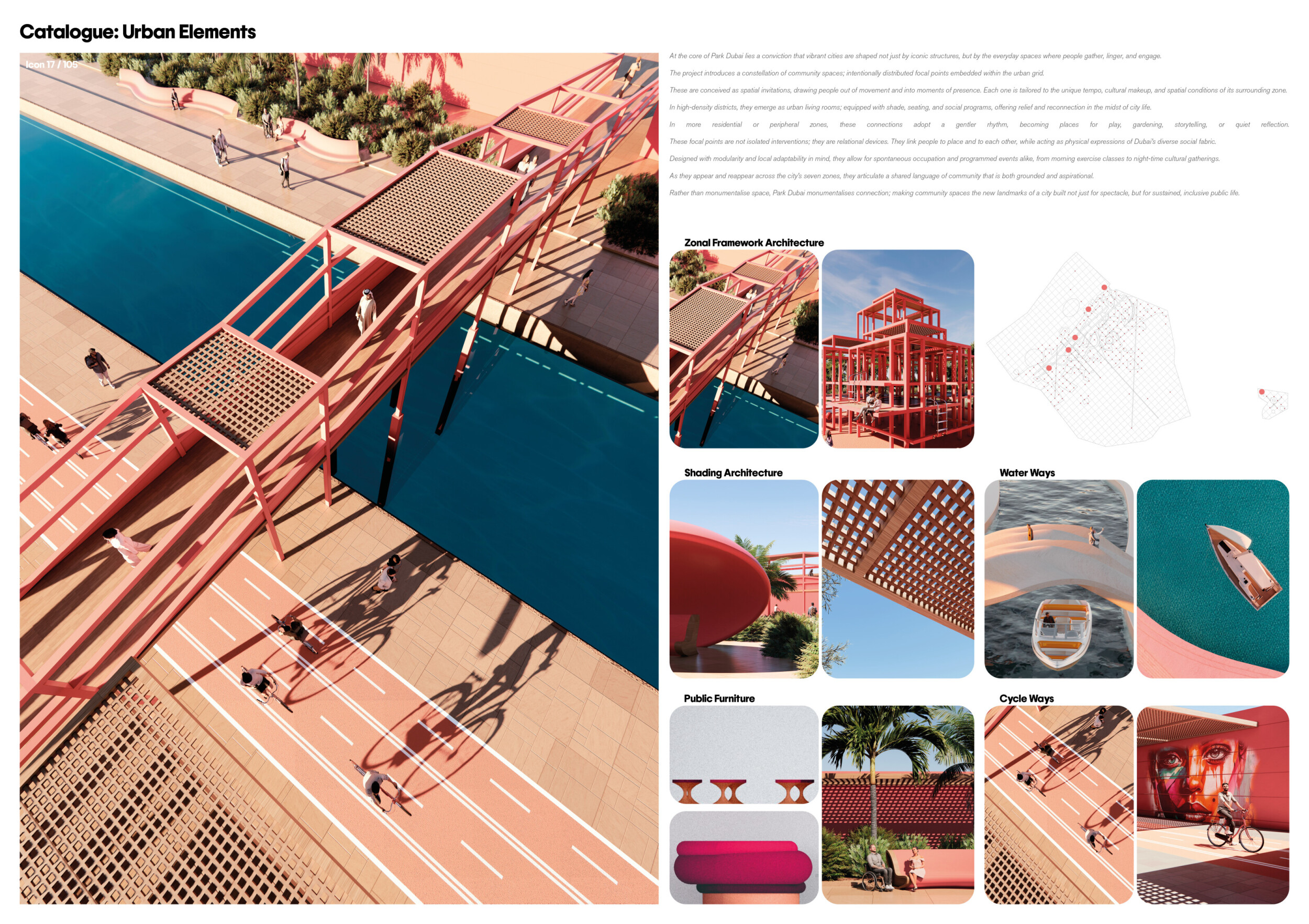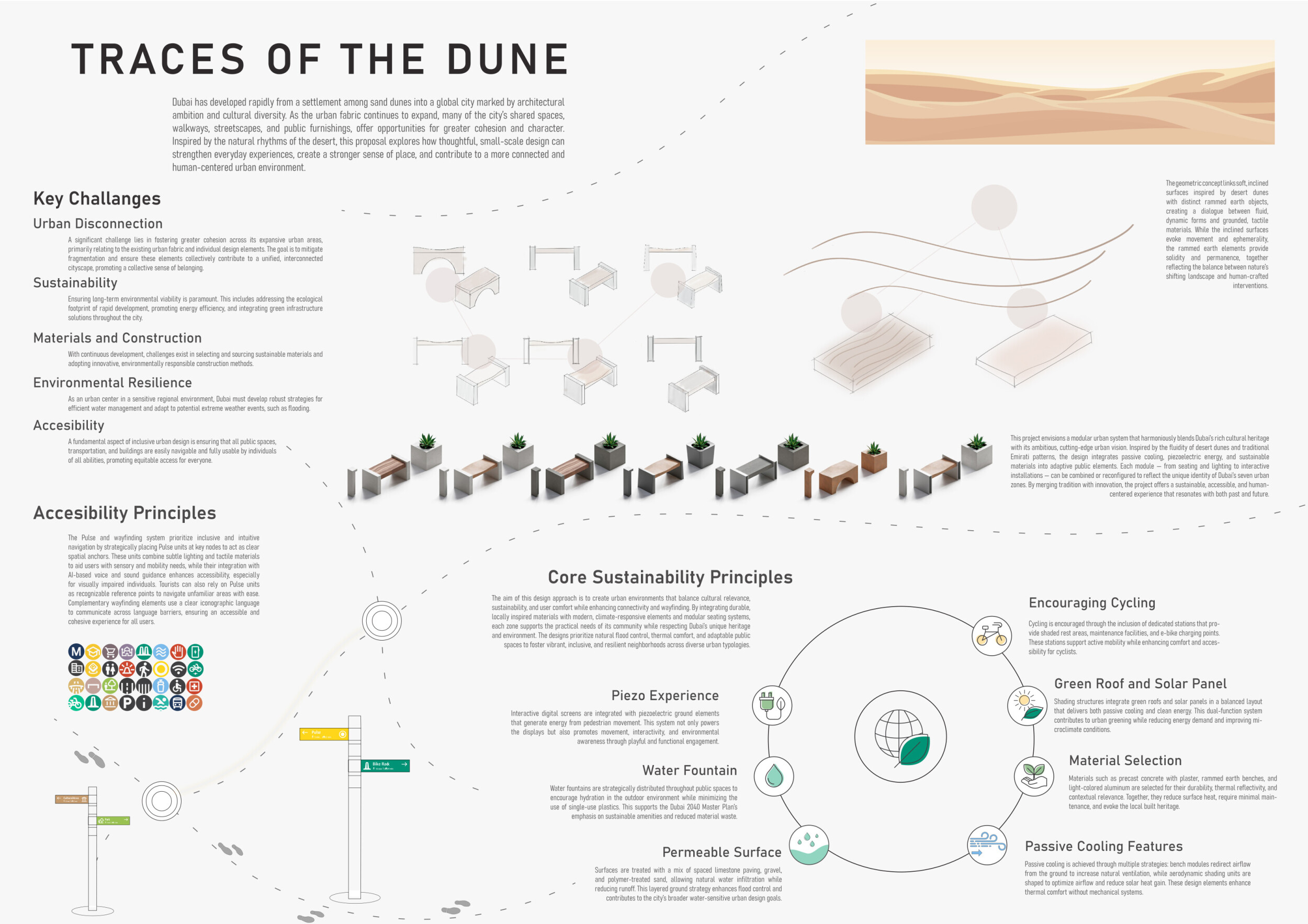 This project establishes a modular system of urban elements grounded in Dubai’s geology, ecology, and vernacular spatial systems. A comprehensive design strategy is first outlined through seven thematic lenses, from geological sands and socio-economic infrastructures to adaptive futures, before translating these into an urban design matrix of over 25 site-specific elements. Read more These include textured concrete pavers, extruded aluminum light poles with pattern perforations, mesh-clad pavilions, linear seating, and sculptural planters. Each item is assigned a color gradient based on sand hues, and a pattern logic that responds to local climatic conditions and neighborhood identities. Zones across the city receive tailored suites of elements that assemble into streetscapes emphasizing porosity, shade, and pedestrian connectivity.