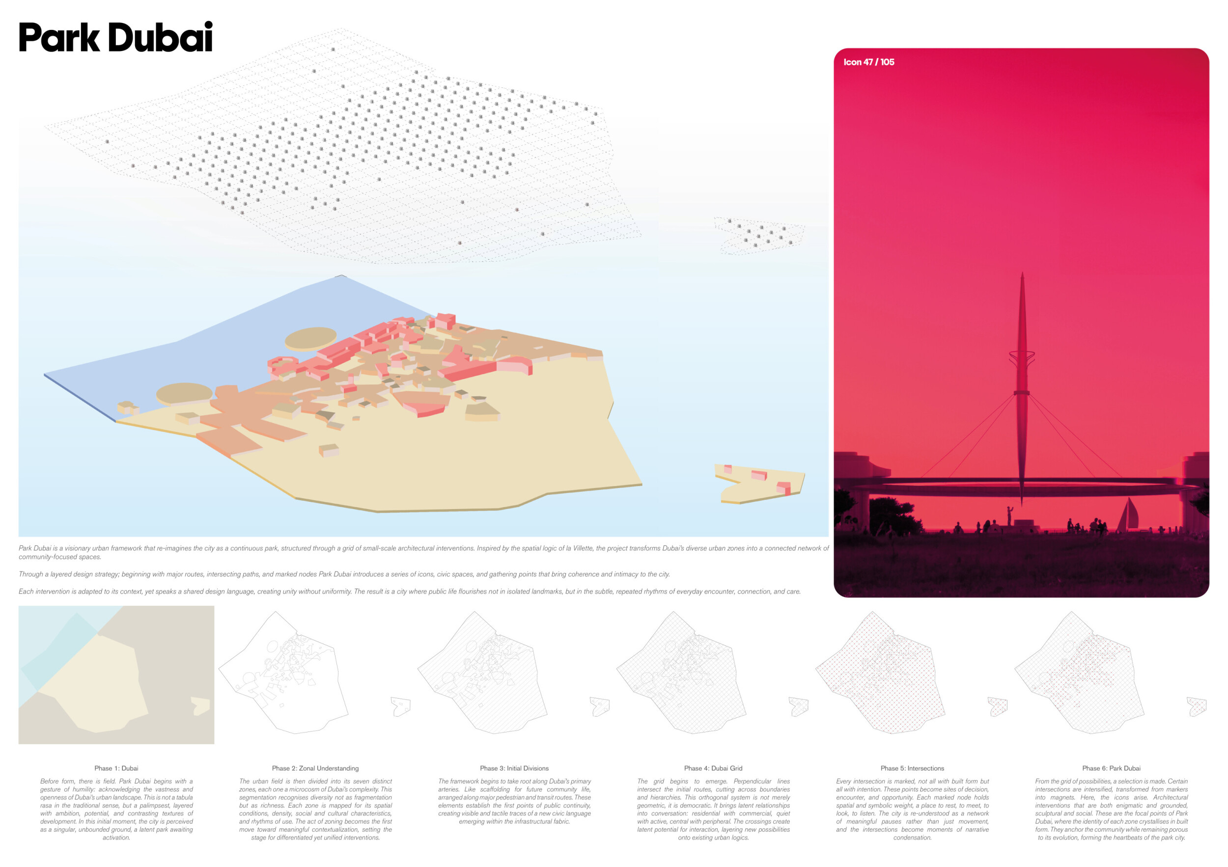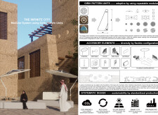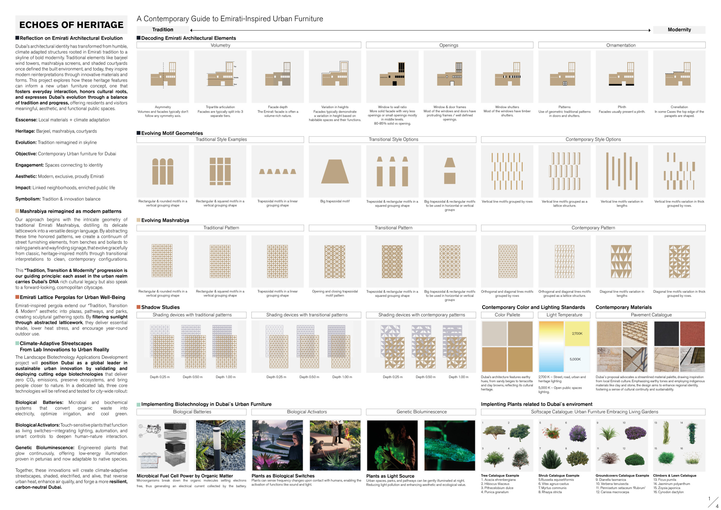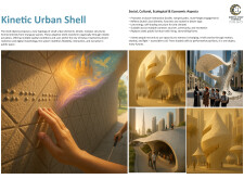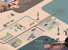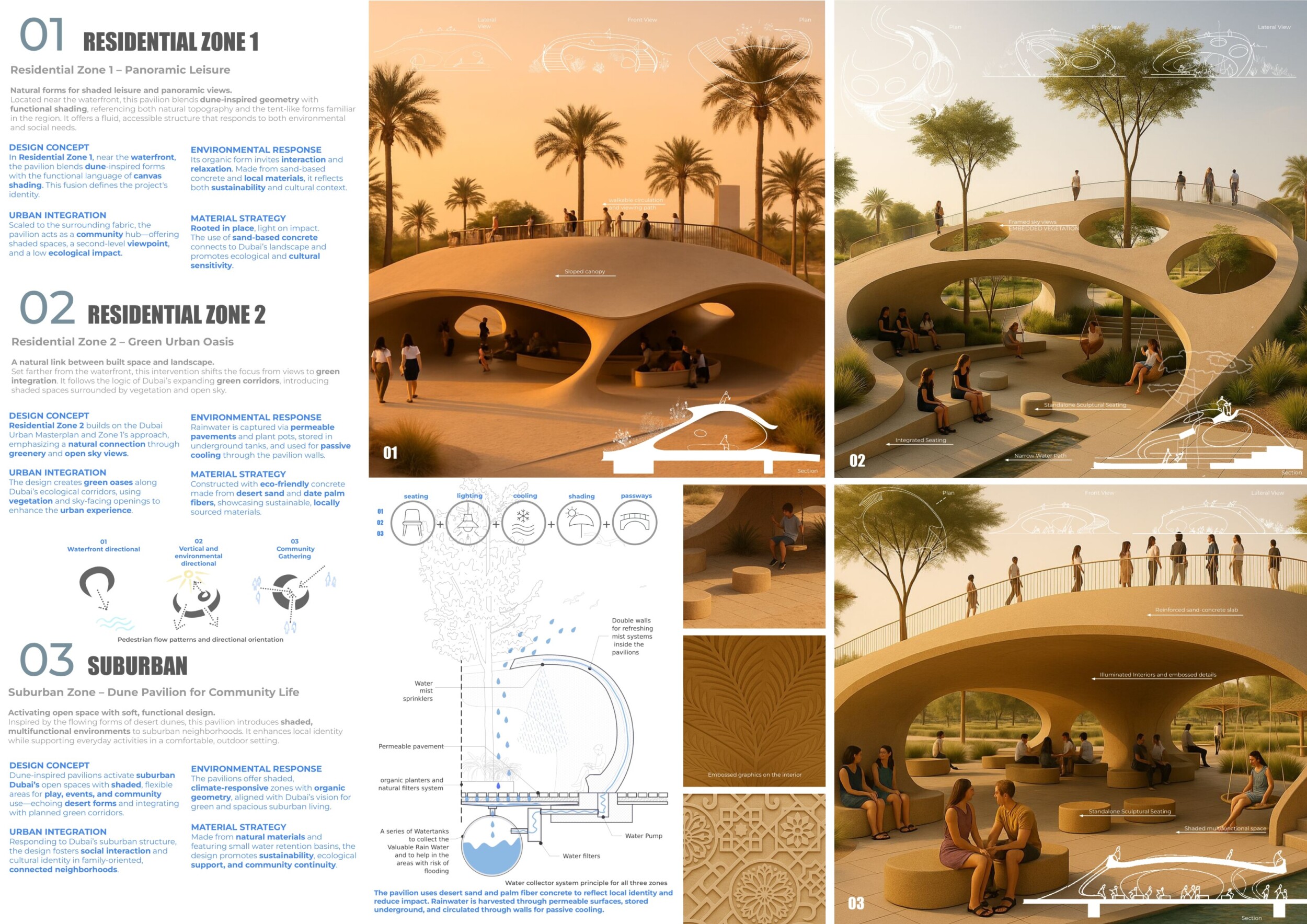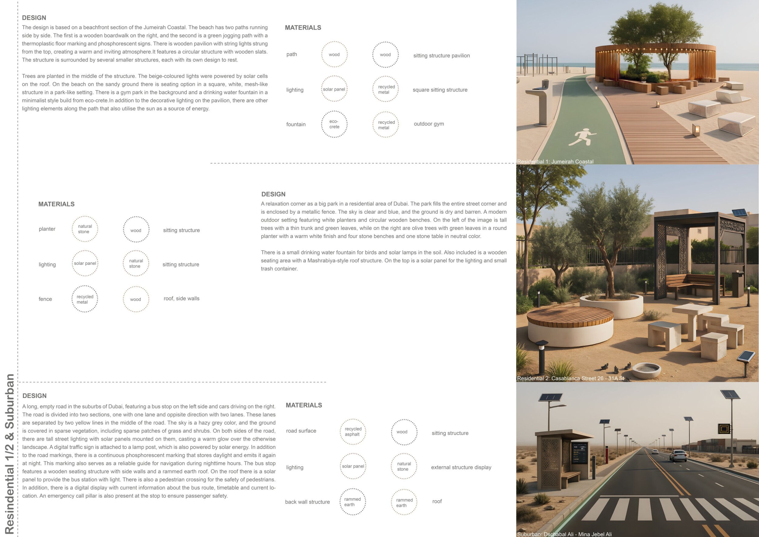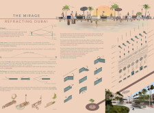 This project establishes a modular system of urban elements grounded in Dubai’s geology, ecology, and vernacular spatial systems. A comprehensive design strategy is first outlined through seven thematic lenses, from geological sands and socio-economic infrastructures to adaptive futures, before translating these into an urban design matrix of over 25 site-specific elements. Read more These include textured concrete pavers, extruded aluminum light poles with pattern perforations, mesh-clad pavilions, linear seating, and sculptural planters. Each item is assigned a color gradient based on sand hues, and a pattern logic that responds to local climatic conditions and neighborhood identities. Zones across the city receive tailored suites of elements that assemble into streetscapes emphasizing porosity, shade, and pedestrian connectivity.