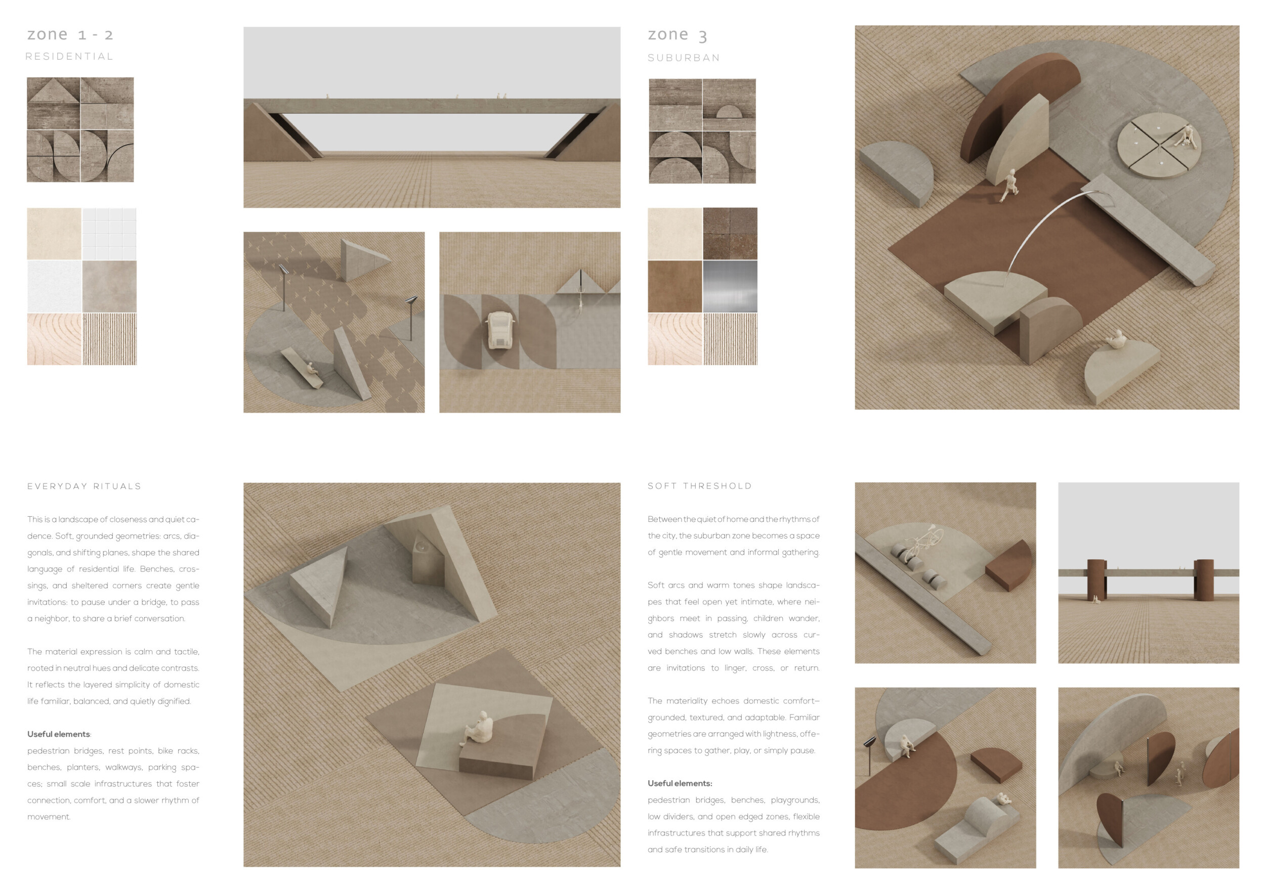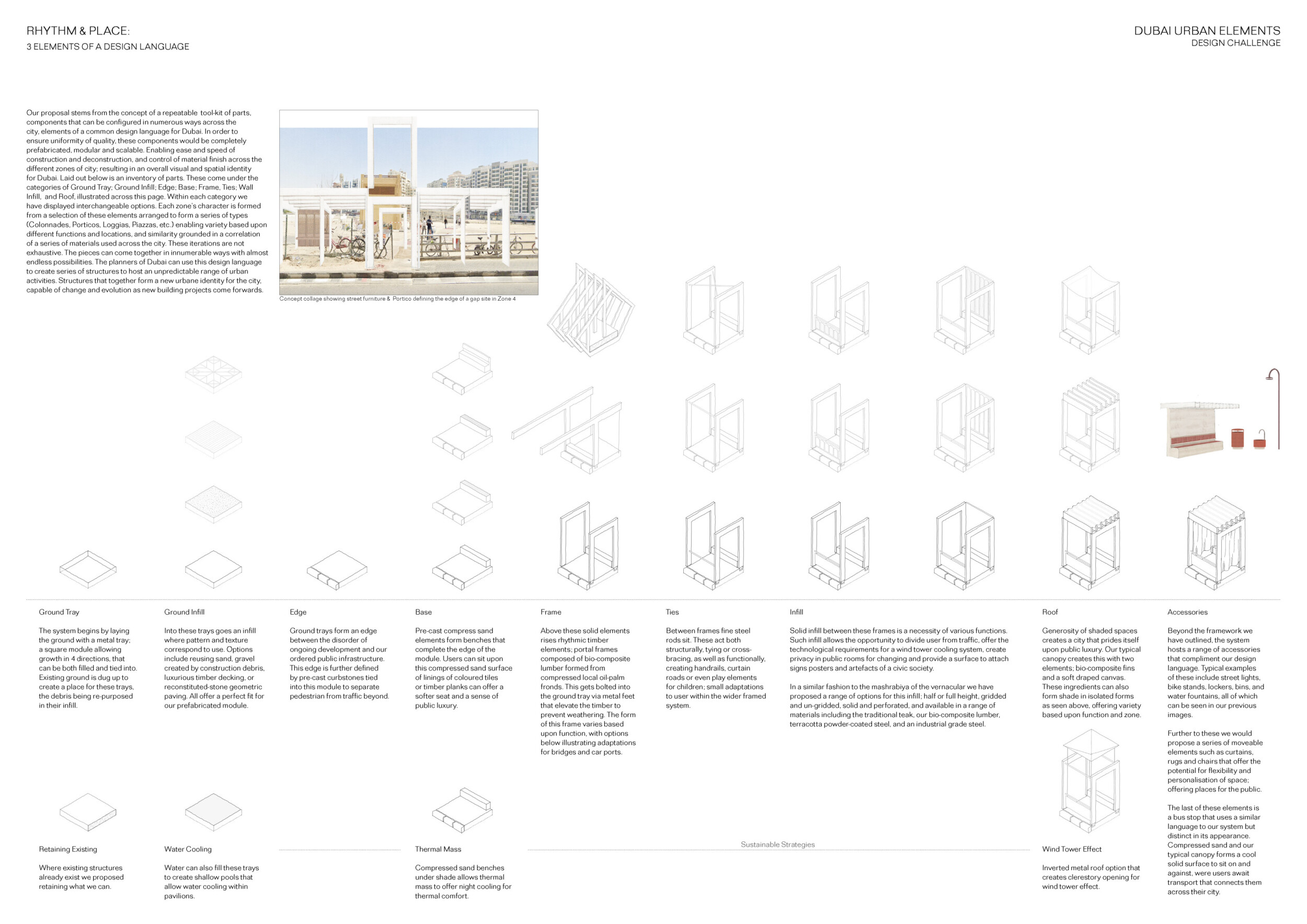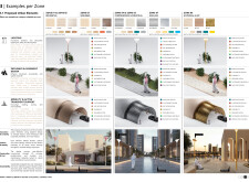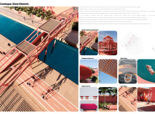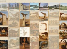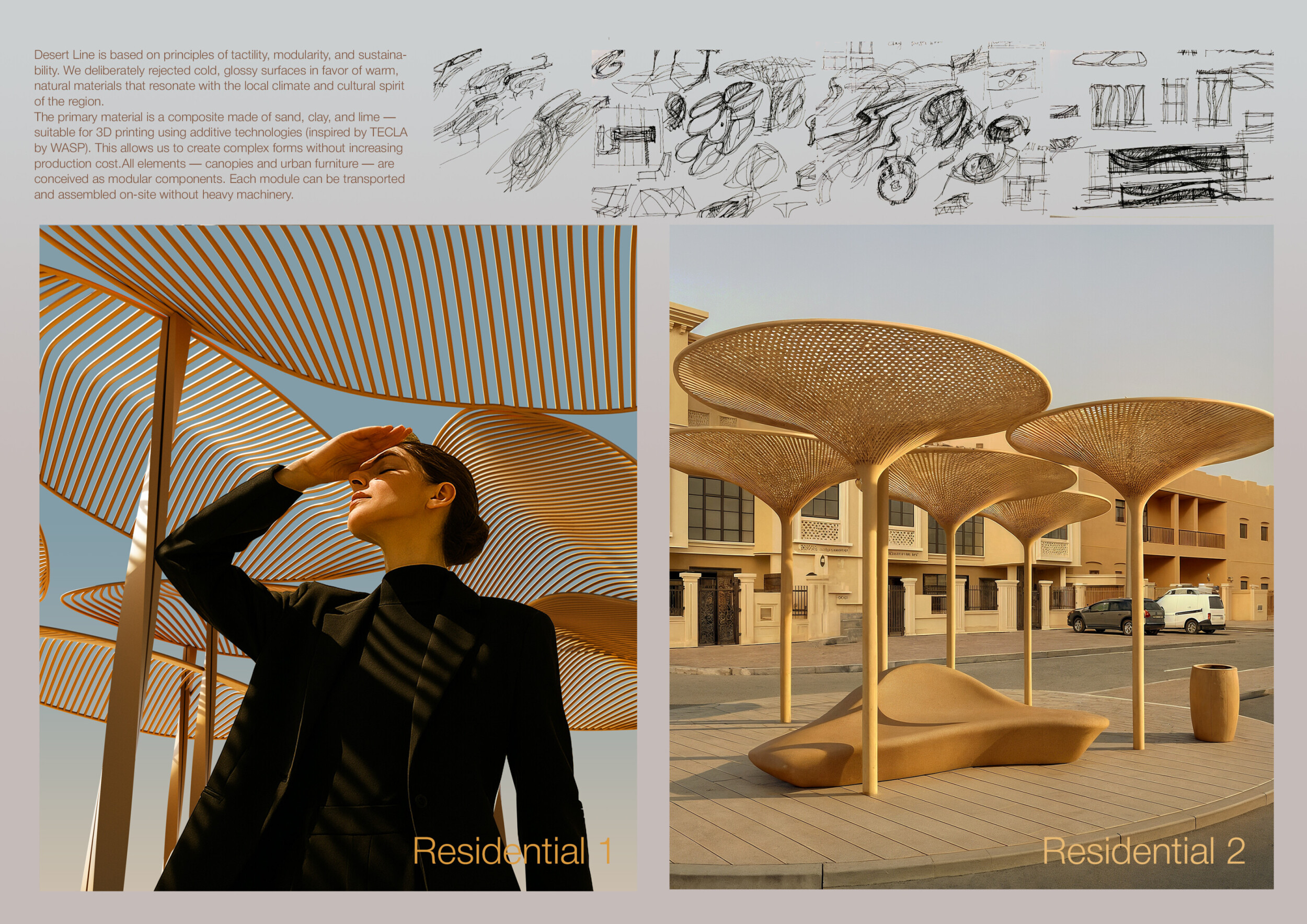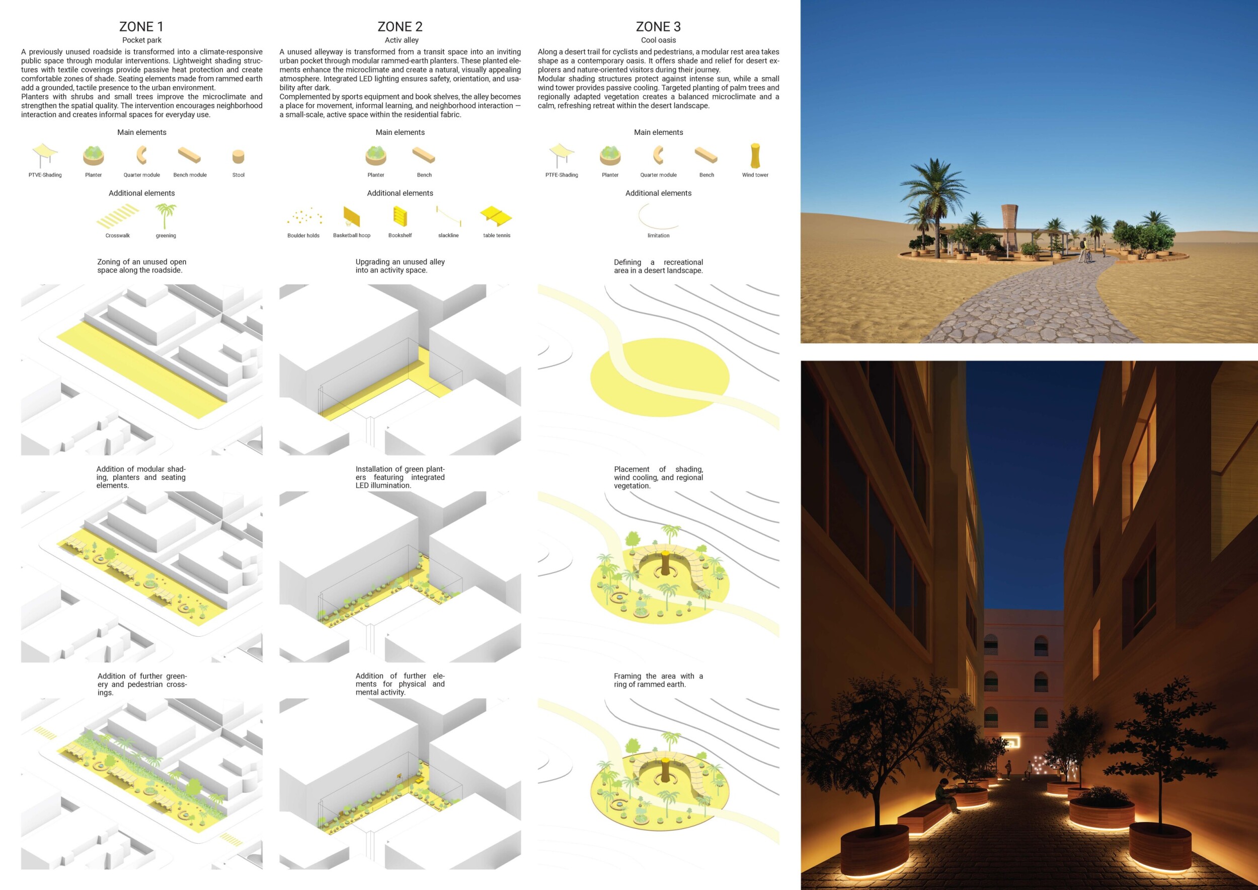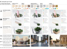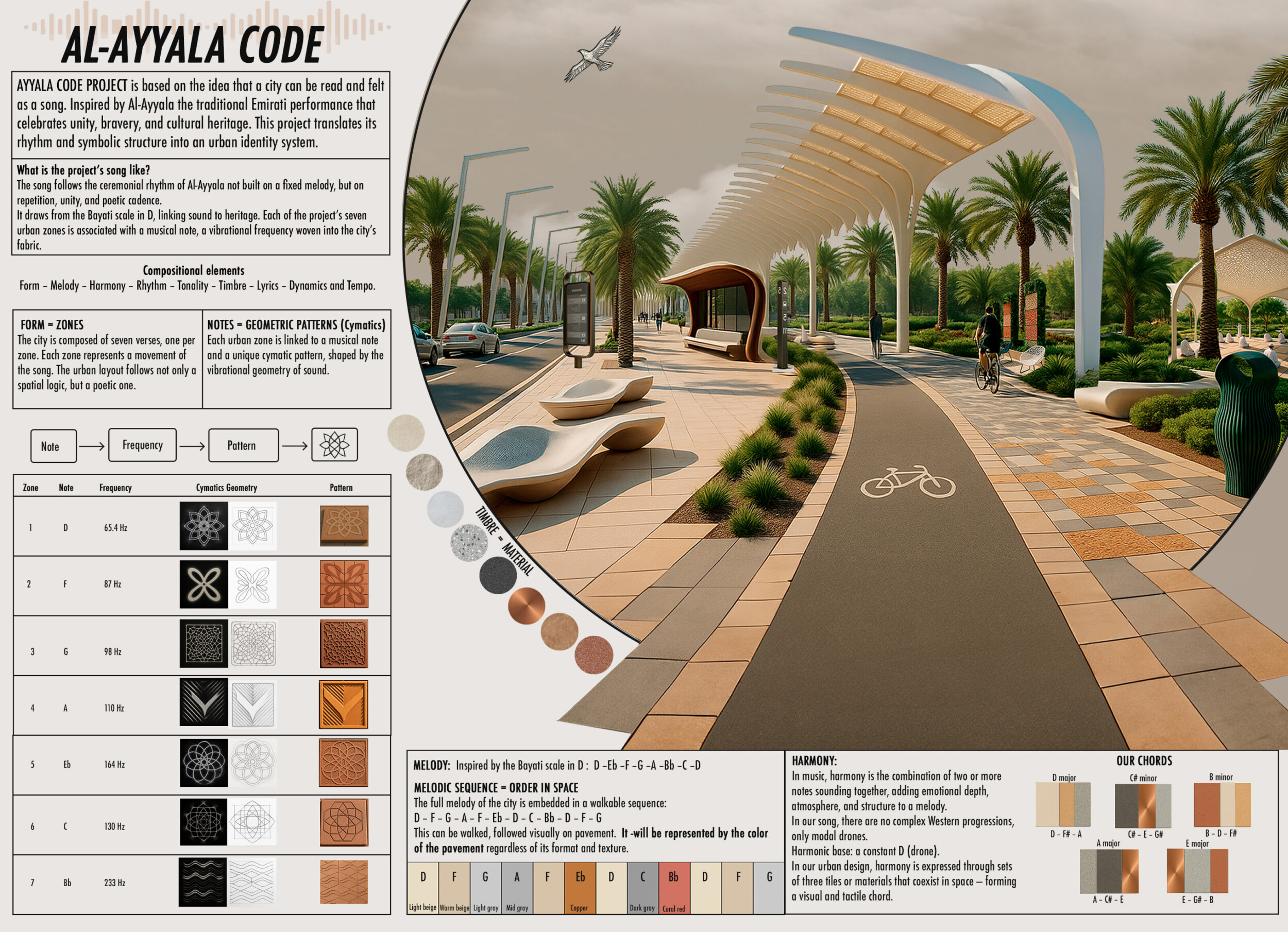 This project establishes a modular system of urban elements grounded in Dubai’s geology, ecology, and vernacular spatial systems. A comprehensive design strategy is first outlined through seven thematic lenses, from geological sands and socio-economic infrastructures to adaptive futures, before translating these into an urban design matrix of over 25 site-specific elements. Read more These include textured concrete pavers, extruded aluminum light poles with pattern perforations, mesh-clad pavilions, linear seating, and sculptural planters. Each item is assigned a color gradient based on sand hues, and a pattern logic that responds to local climatic conditions and neighborhood identities. Zones across the city receive tailored suites of elements that assemble into streetscapes emphasizing porosity, shade, and pedestrian connectivity.