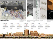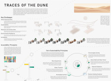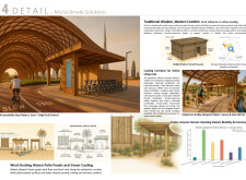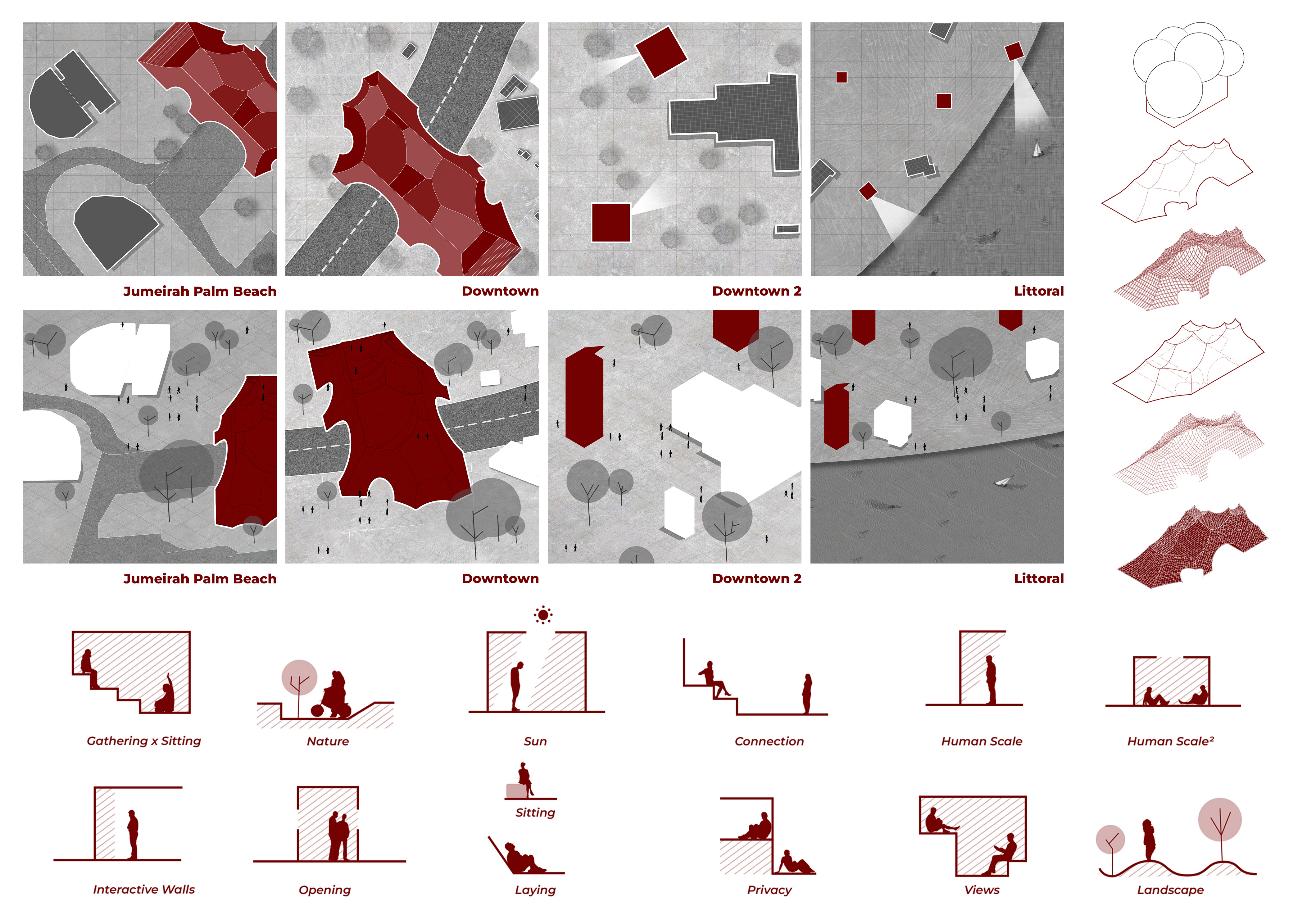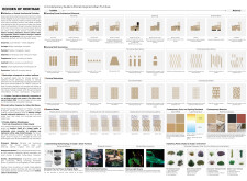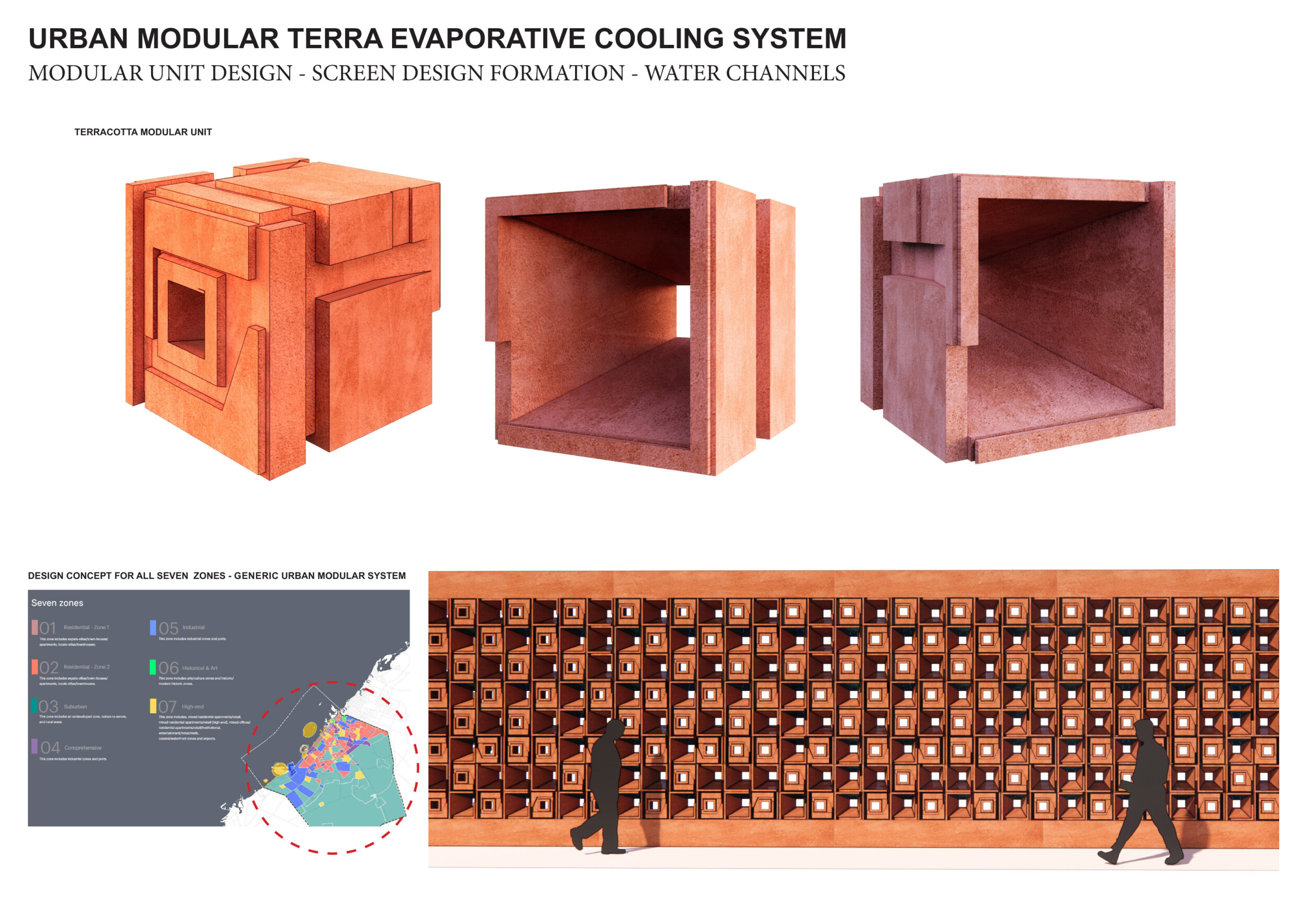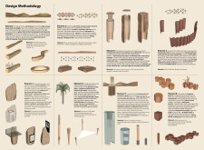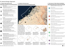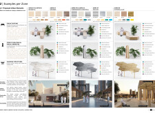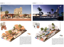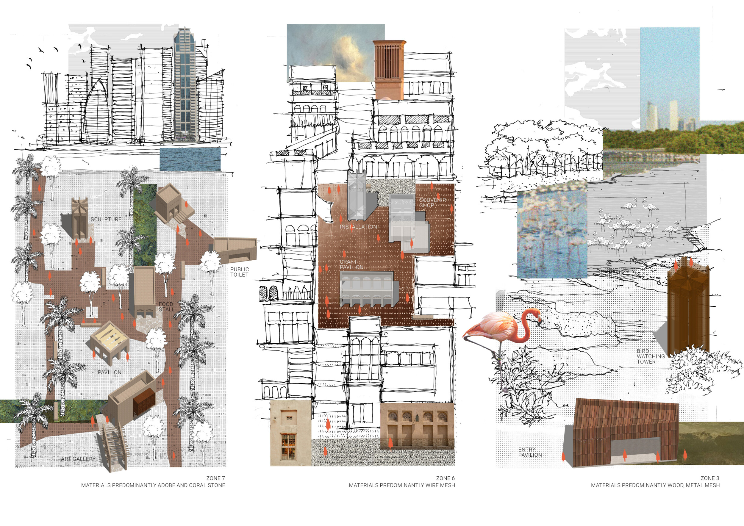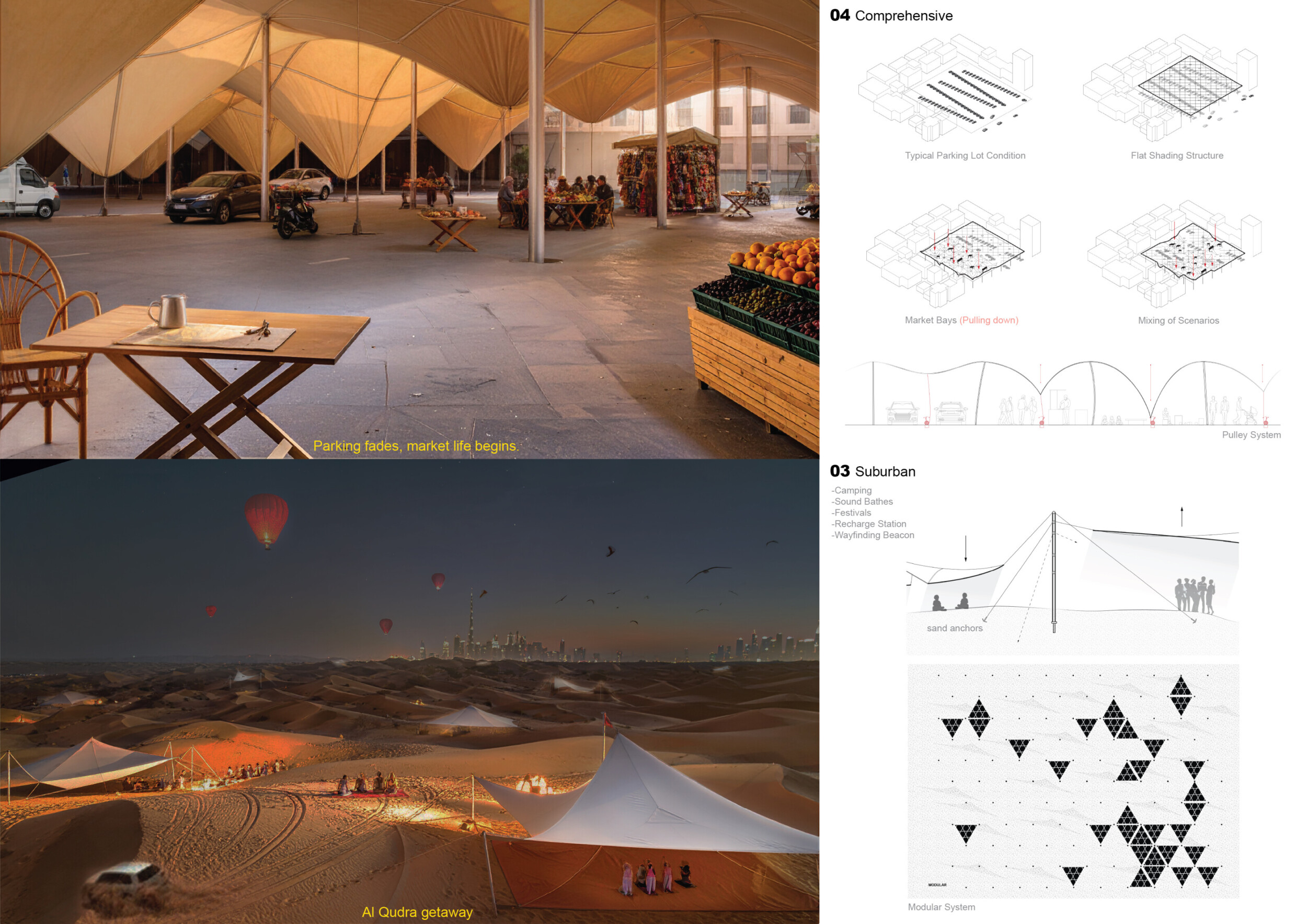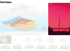 This project establishes a modular system of urban elements grounded in Dubai’s geology, ecology, and vernacular spatial systems. A comprehensive design strategy is first outlined through seven thematic lenses, from geological sands and socio-economic infrastructures to adaptive futures, before translating these into an urban design matrix of over 25 site-specific elements. Read more These include textured concrete pavers, extruded aluminum light poles with pattern perforations, mesh-clad pavilions, linear seating, and sculptural planters. Each item is assigned a color gradient based on sand hues, and a pattern logic that responds to local climatic conditions and neighborhood identities. Zones across the city receive tailored suites of elements that assemble into streetscapes emphasizing porosity, shade, and pedestrian connectivity.