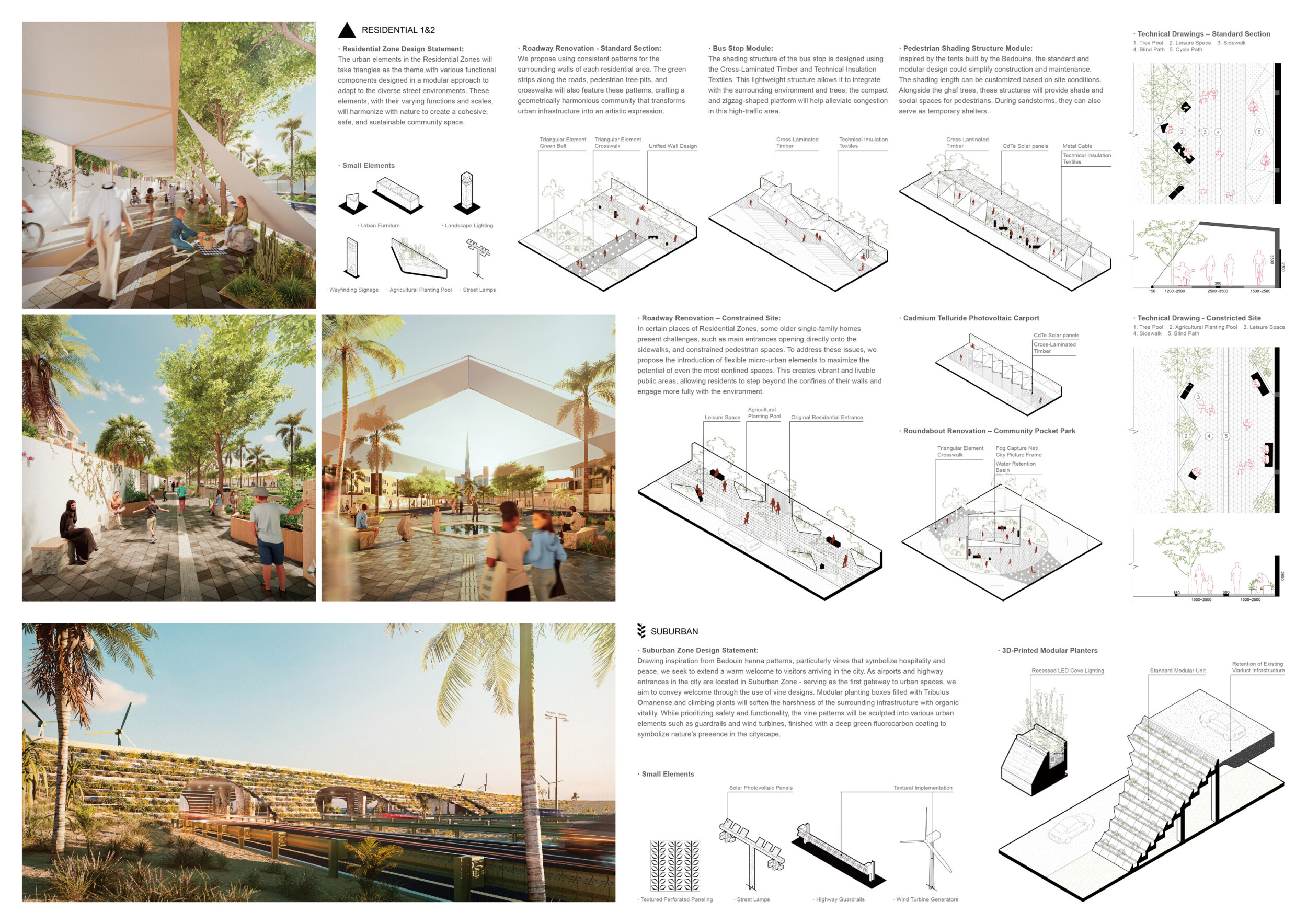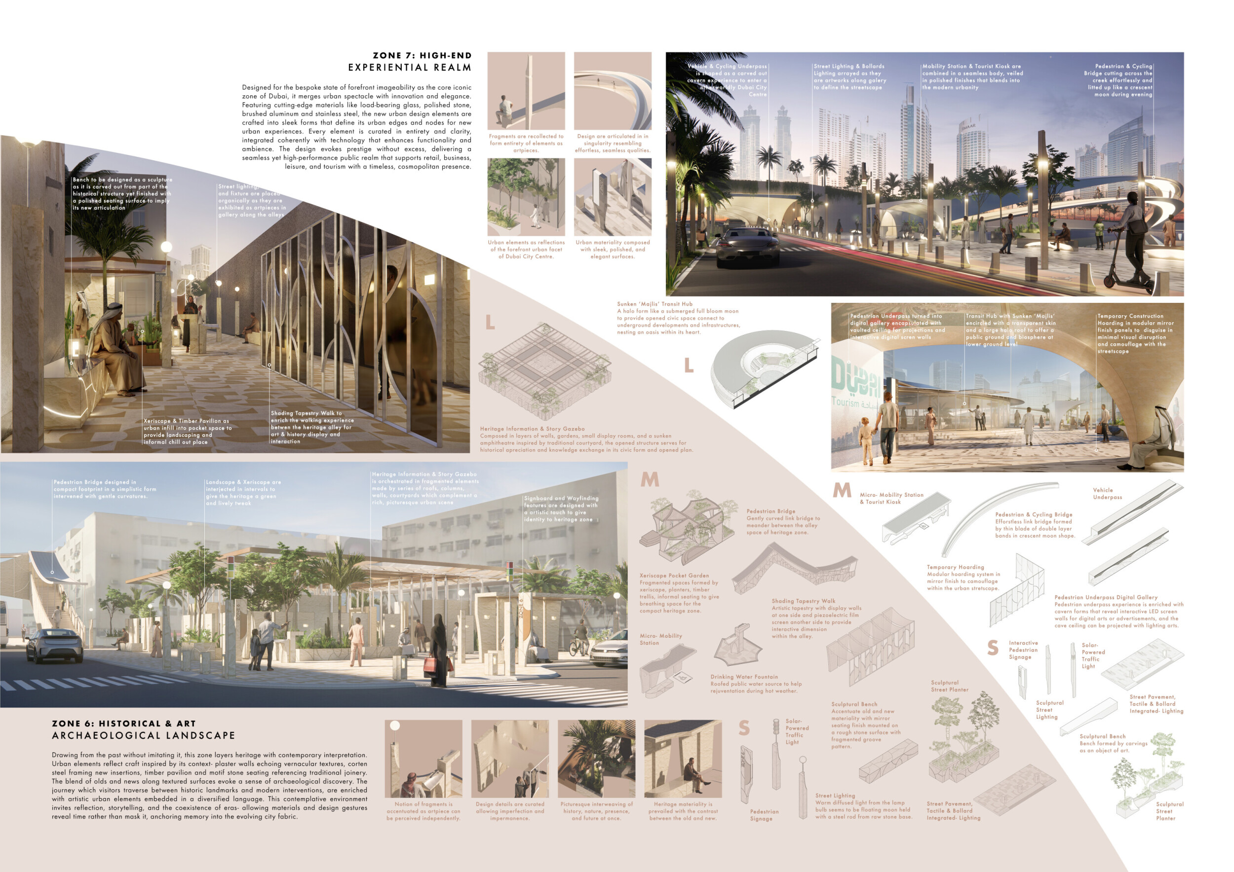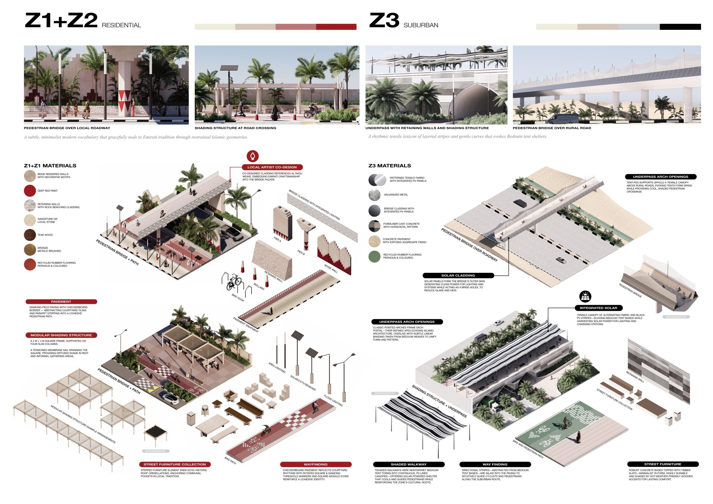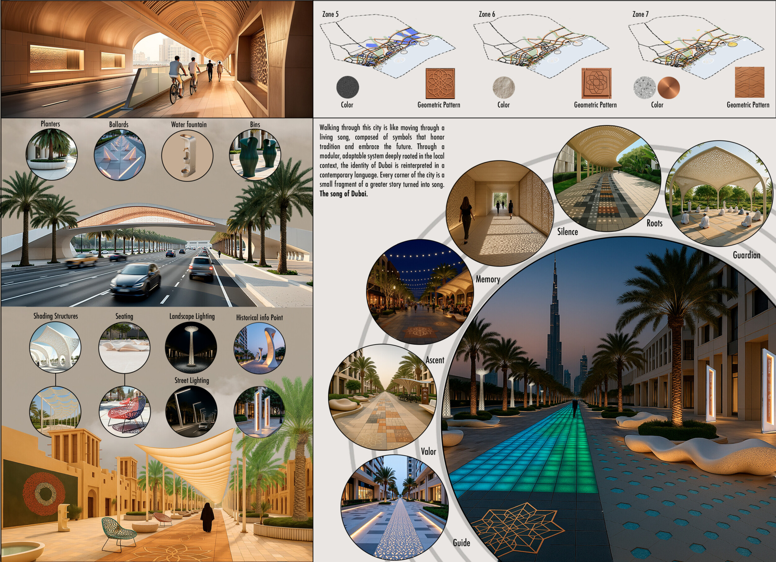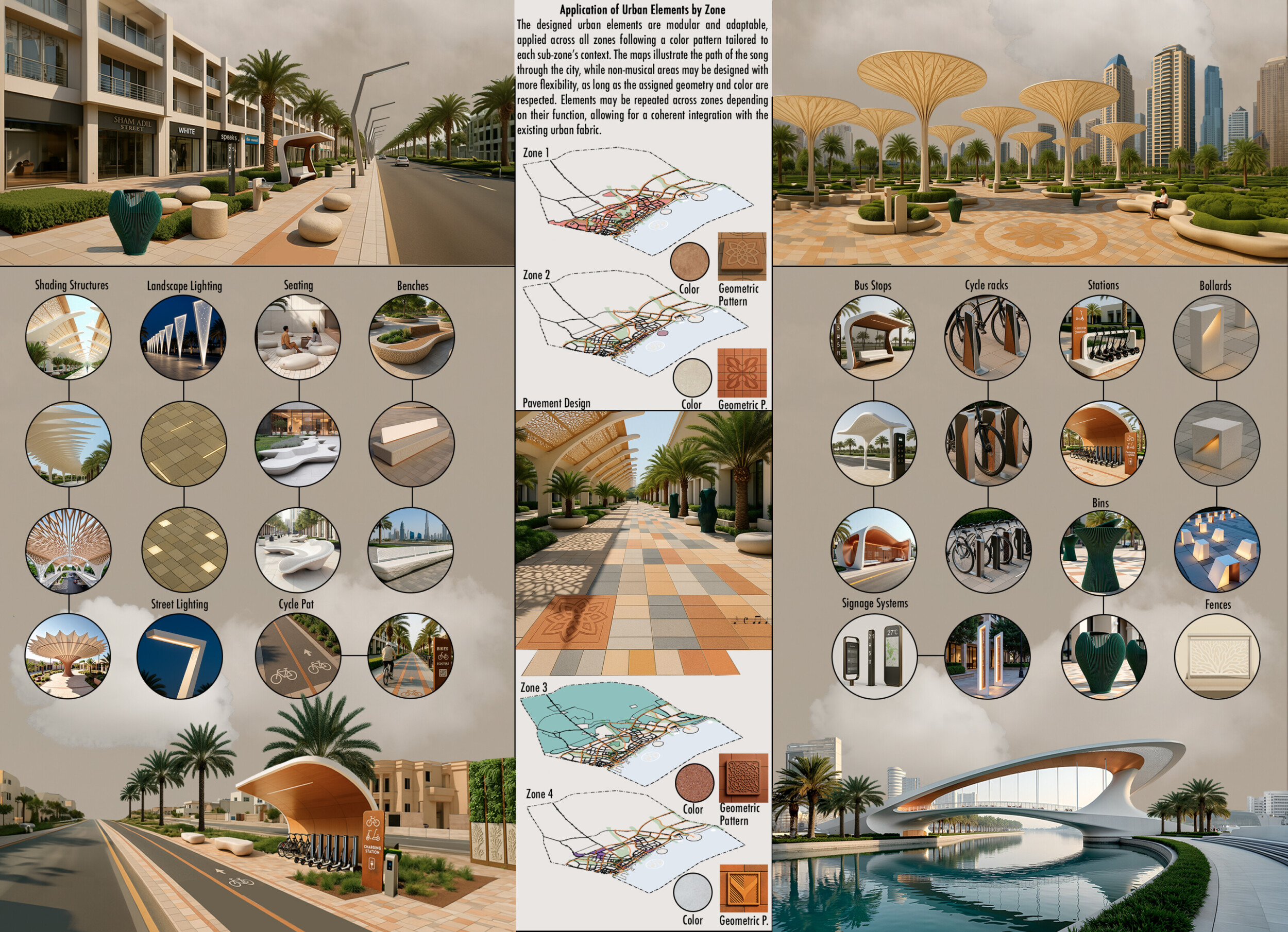 This proposal establishes a cohesive urban design system tailored to Dubai’s diverse zoning contexts, translating each area’s cultural, climatic, and programmatic character into a unified streetscape language. Seven distinct zone typologies—ranging from residential to industrial, heritage, and high-end—are articulated through a matrix of core geometries, modular shading elements, curated material palettes, and contextual wayfinding. Read more Each typology introduces unique visual identifiers: Z1 and Z2 draw on Islamic motifs and neighborhood intimacy, Z3 evokes Bedouin tents and soft landforms, while Z5 and Z7 leverage sharper geometries and premium finishes to express industrial rigor or luxury. The proposal integrates shading, pedestrian bridges, solar infrastructure, and street furniture into cohesive kit-of-parts systems adaptable across road hierarchies and public interfaces. Artistic co-design, climate-responsive strategies, and heritage continuity are embedded throughout, ensuring visual consistency while accommodating Dubai’s rapid growth, diverse urban fabrics, and the need for identity-driven public realm enhancements.