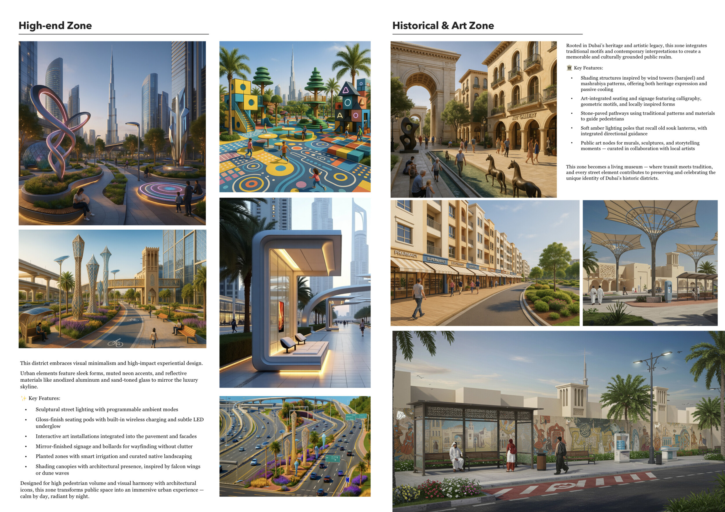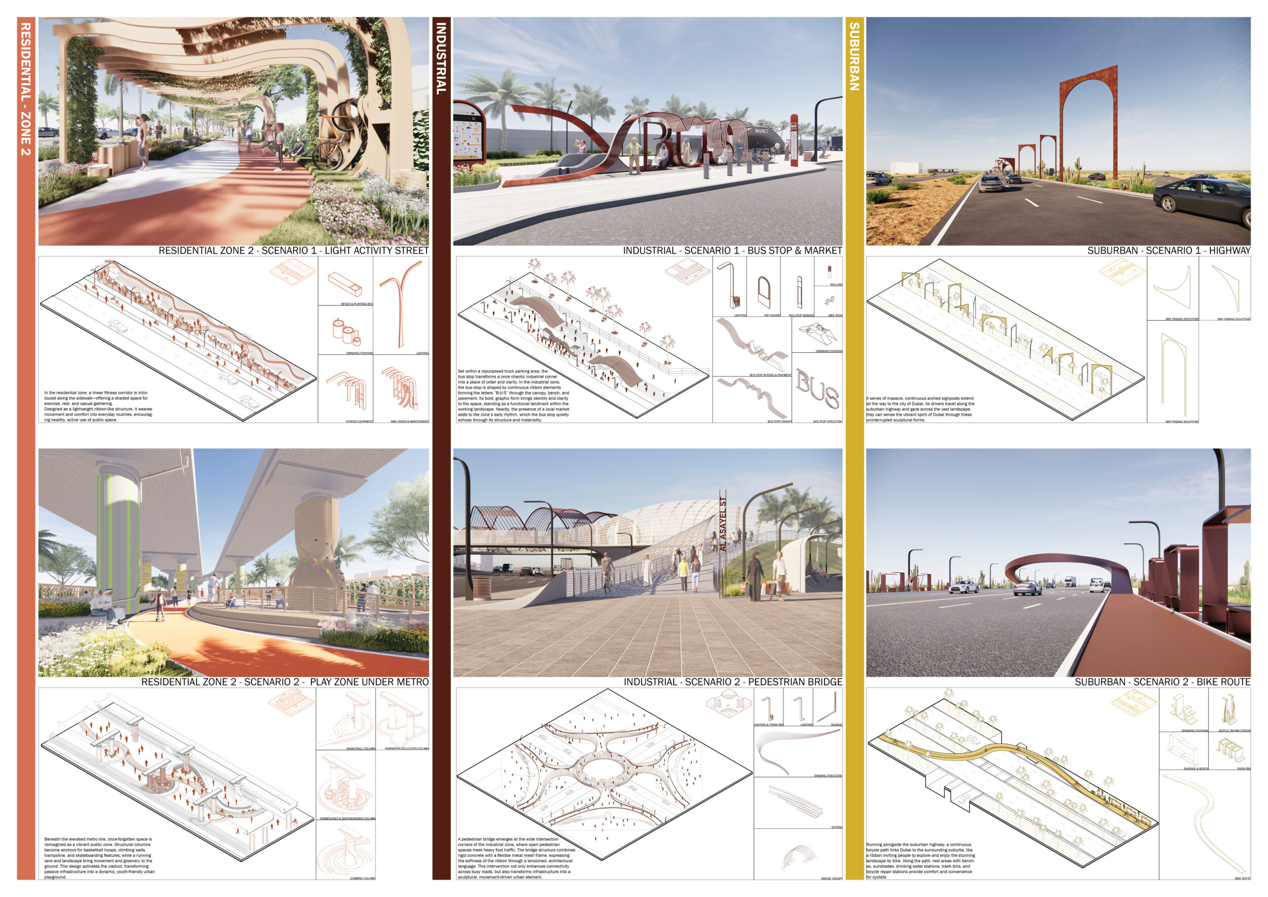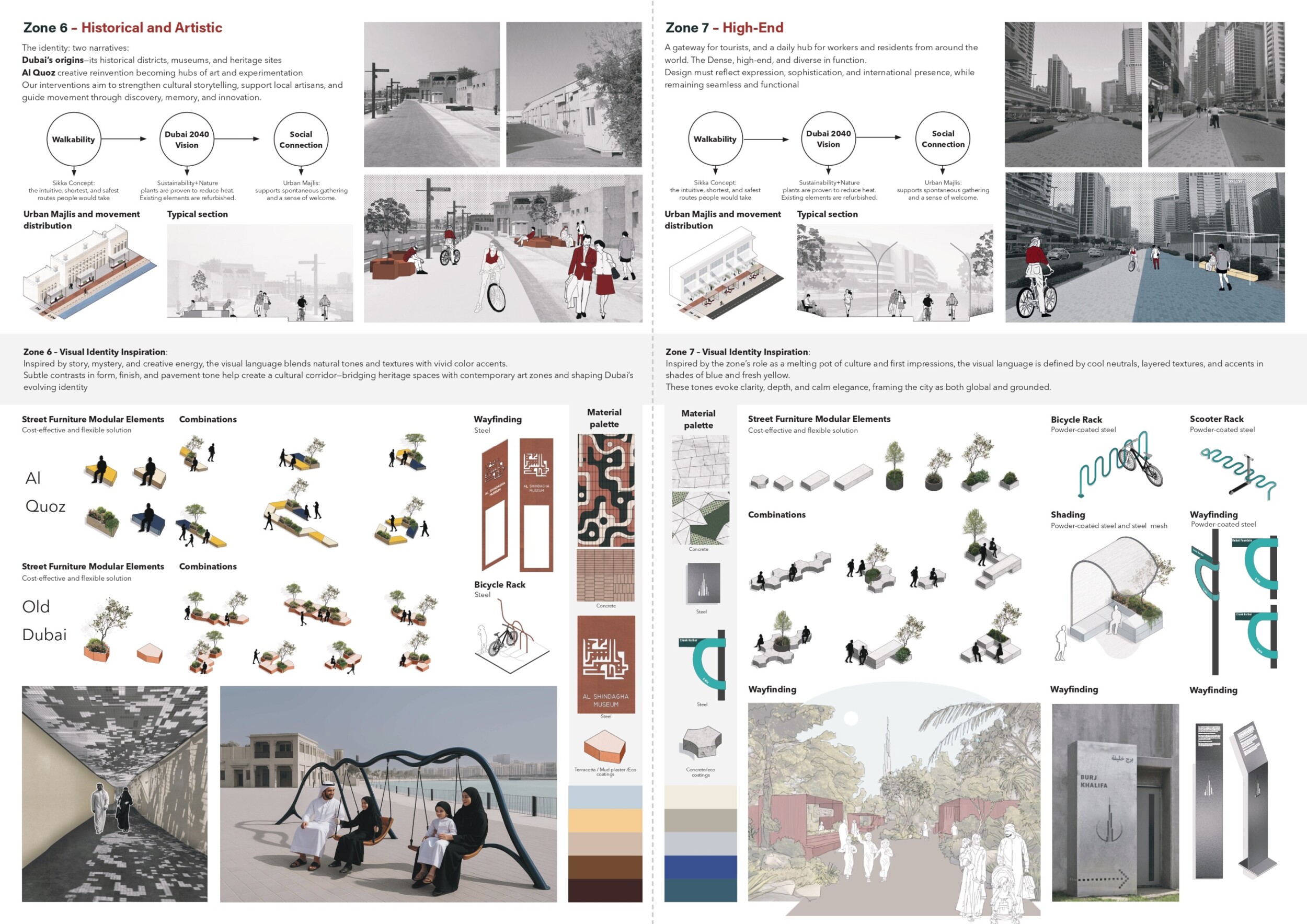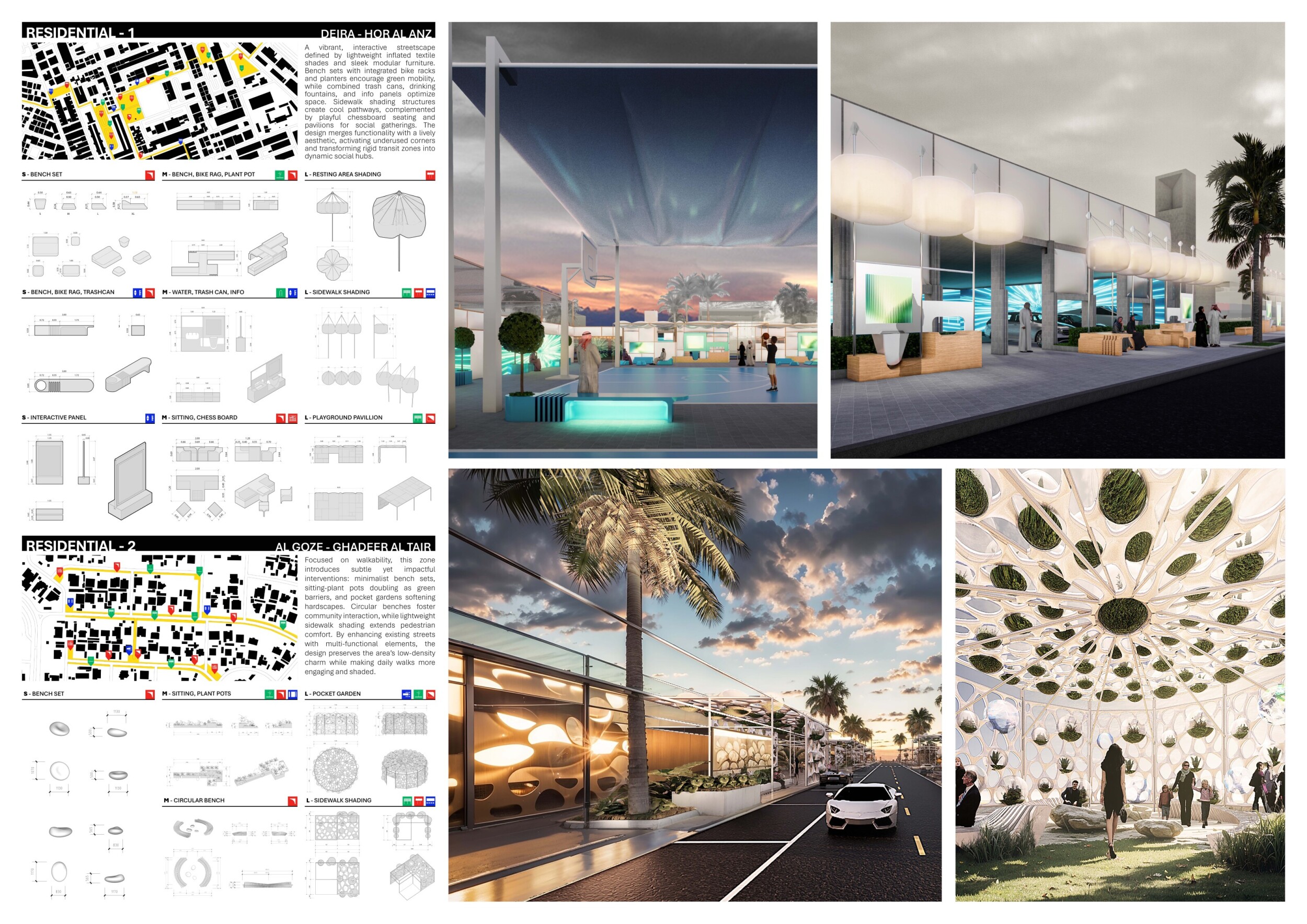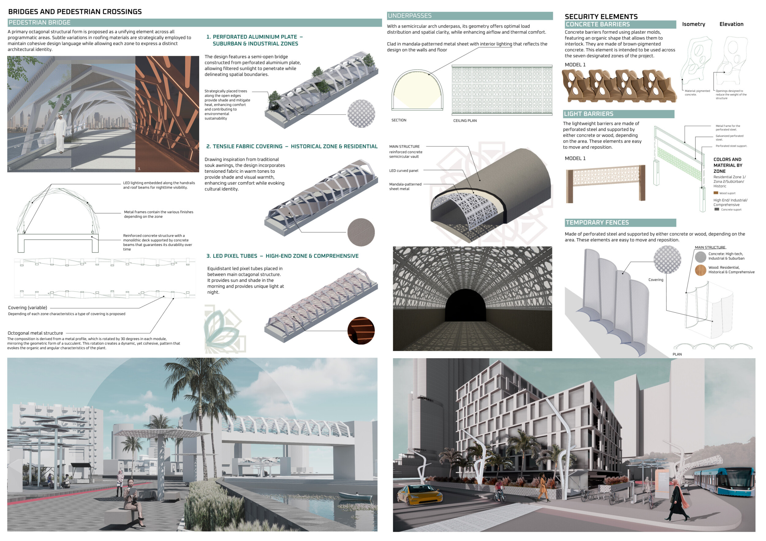 This proposal establishes a cohesive urban design system tailored to Dubai’s diverse zoning contexts, translating each area’s cultural, climatic, and programmatic character into a unified streetscape language. Seven distinct zone typologies—ranging from residential to industrial, heritage, and high-end—are articulated through a matrix of core geometries, modular shading elements, curated material palettes, and contextual wayfinding. Read more Each typology introduces unique visual identifiers: Z1 and Z2 draw on Islamic motifs and neighborhood intimacy, Z3 evokes Bedouin tents and soft landforms, while Z5 and Z7 leverage sharper geometries and premium finishes to express industrial rigor or luxury. The proposal integrates shading, pedestrian bridges, solar infrastructure, and street furniture into cohesive kit-of-parts systems adaptable across road hierarchies and public interfaces. Artistic co-design, climate-responsive strategies, and heritage continuity are embedded throughout, ensuring visual consistency while accommodating Dubai’s rapid growth, diverse urban fabrics, and the need for identity-driven public realm enhancements.
