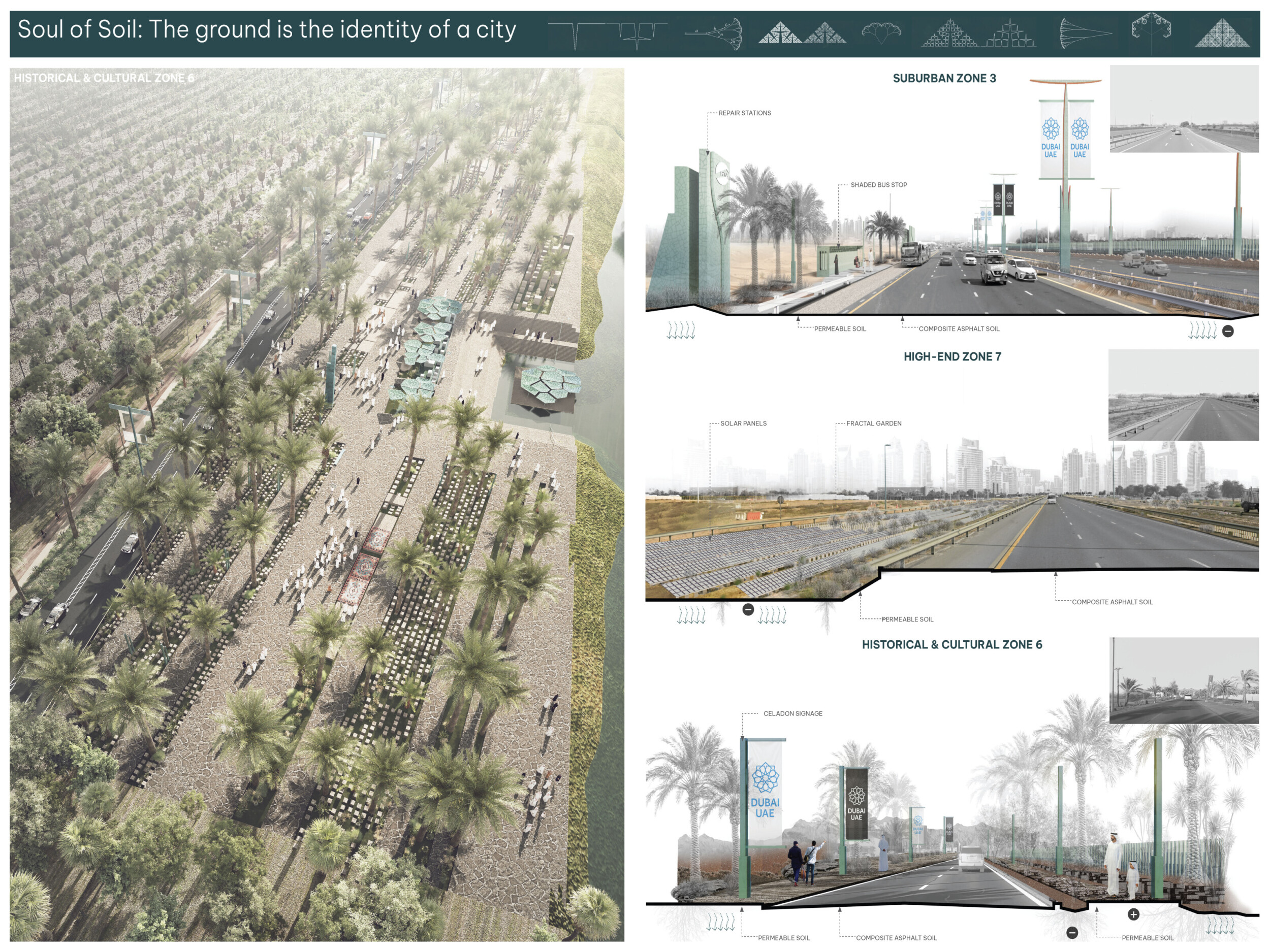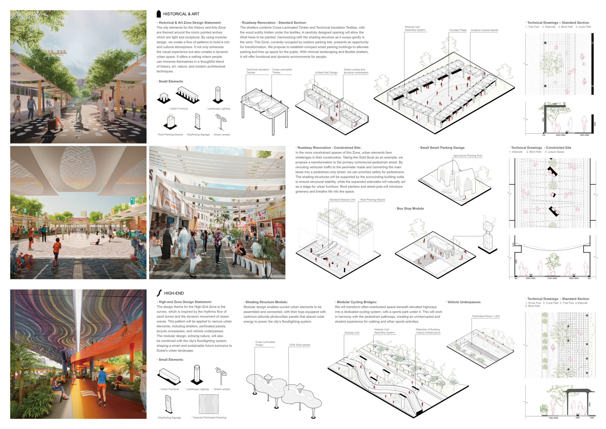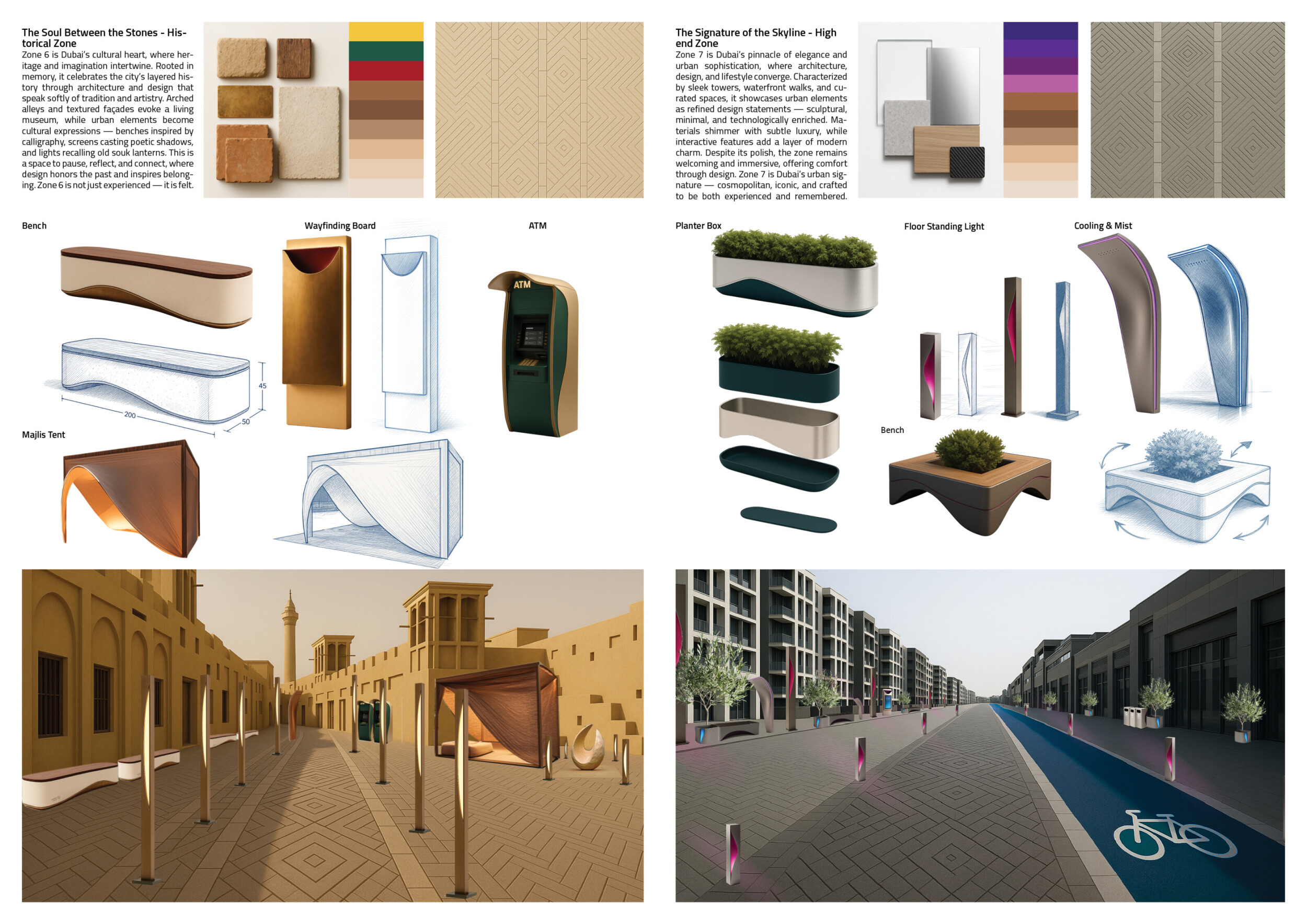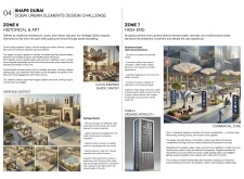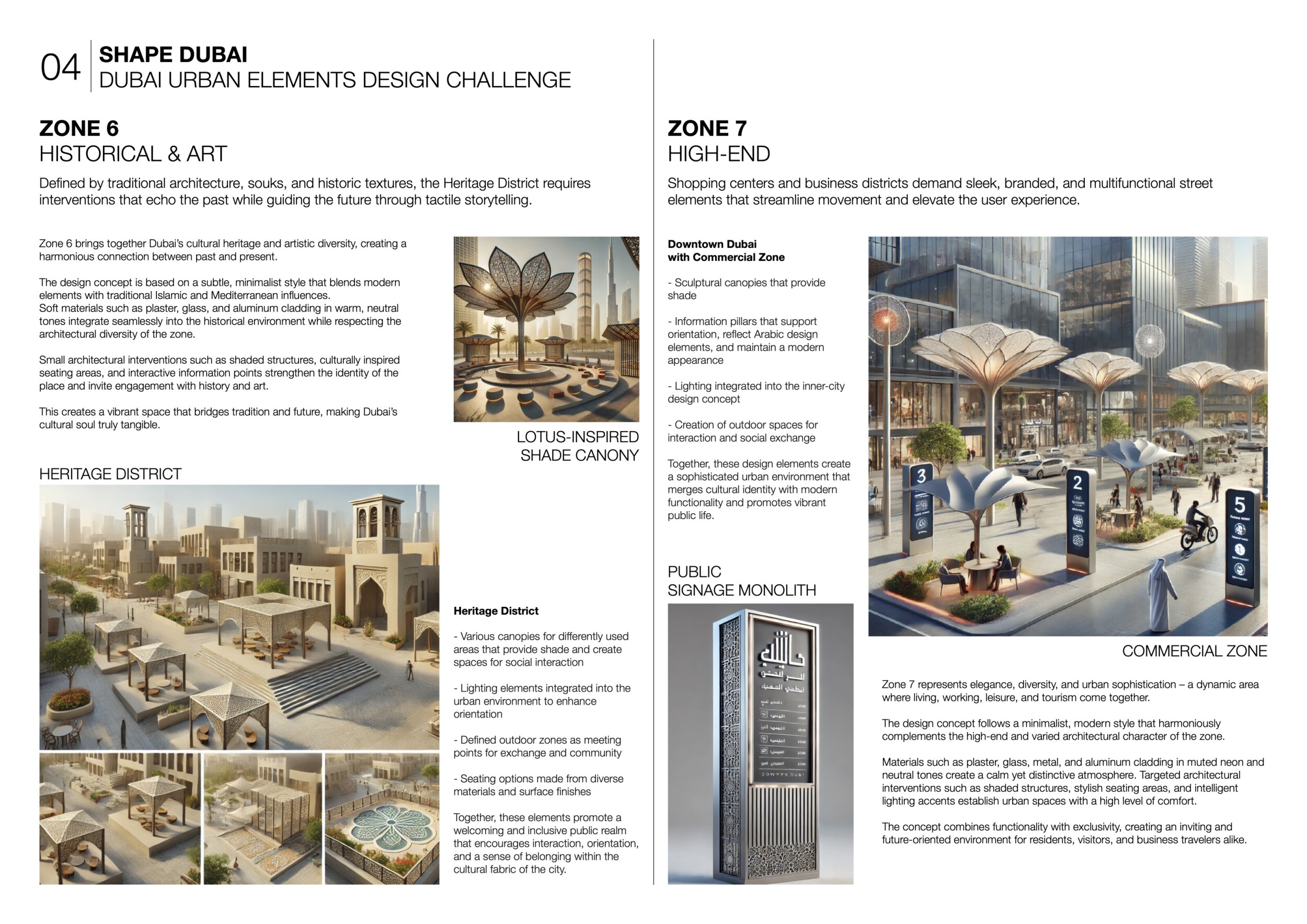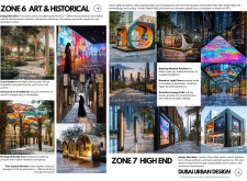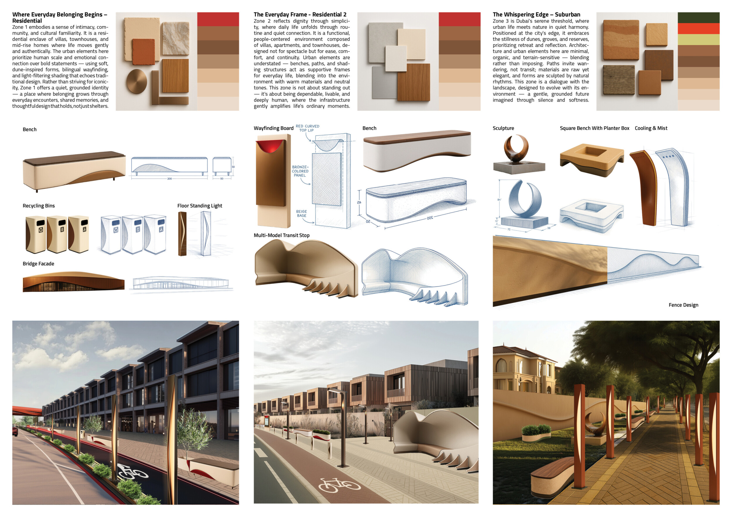 This proposal establishes a cohesive urban design system tailored to Dubai’s diverse zoning contexts, translating each area’s cultural, climatic, and programmatic character into a unified streetscape language. Seven distinct zone typologies—ranging from residential to industrial, heritage, and high-end—are articulated through a matrix of core geometries, modular shading elements, curated material palettes, and contextual wayfinding. Read more Each typology introduces unique visual identifiers: Z1 and Z2 draw on Islamic motifs and neighborhood intimacy, Z3 evokes Bedouin tents and soft landforms, while Z5 and Z7 leverage sharper geometries and premium finishes to express industrial rigor or luxury. The proposal integrates shading, pedestrian bridges, solar infrastructure, and street furniture into cohesive kit-of-parts systems adaptable across road hierarchies and public interfaces. Artistic co-design, climate-responsive strategies, and heritage continuity are embedded throughout, ensuring visual consistency while accommodating Dubai’s rapid growth, diverse urban fabrics, and the need for identity-driven public realm enhancements.