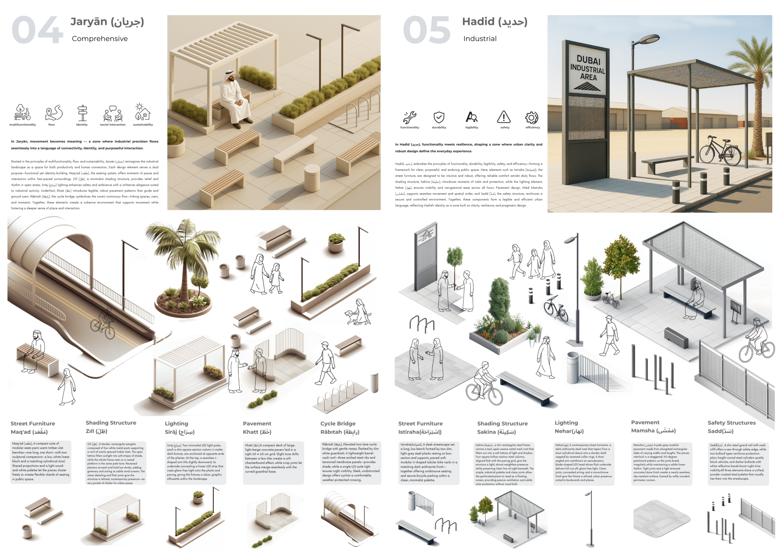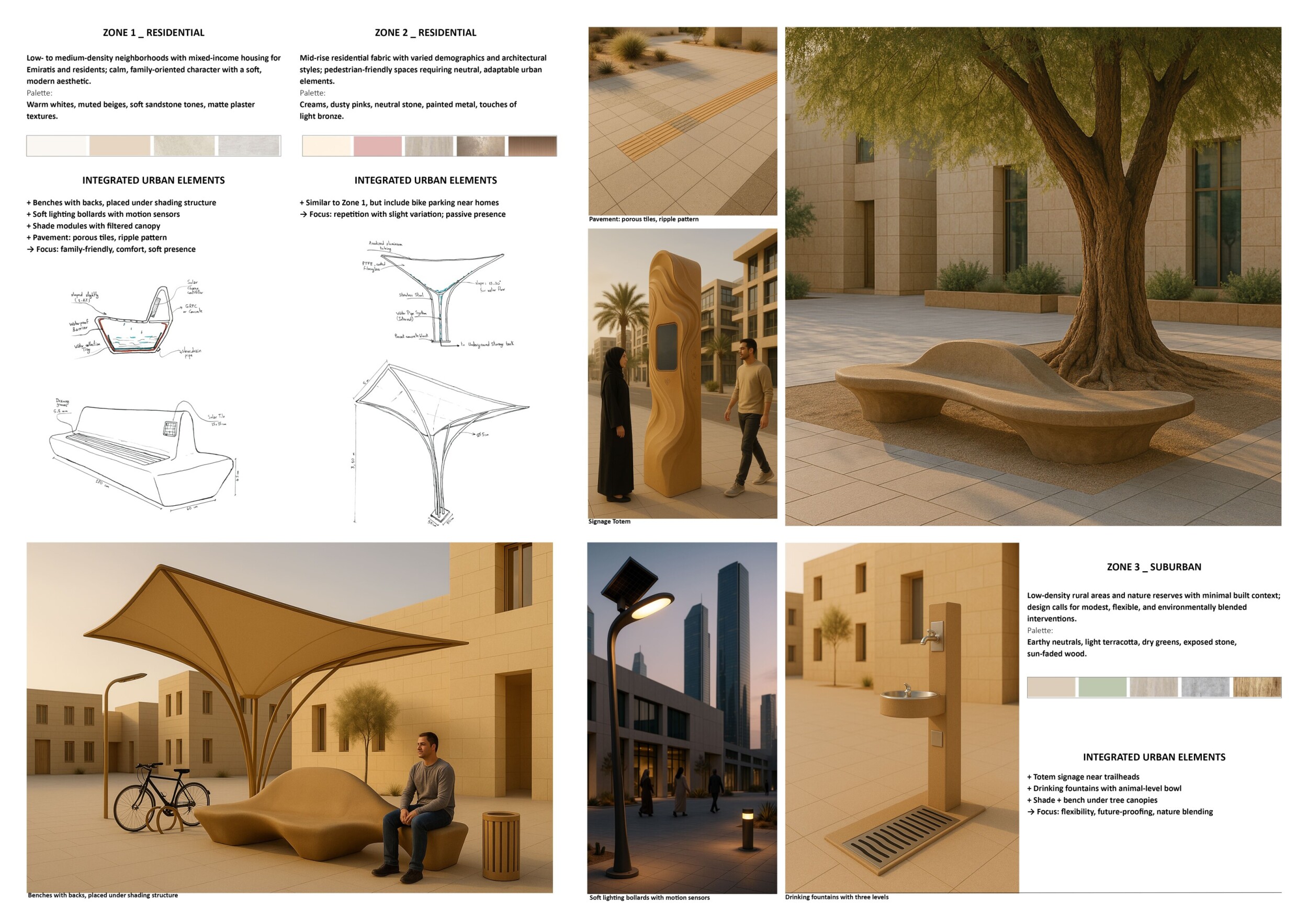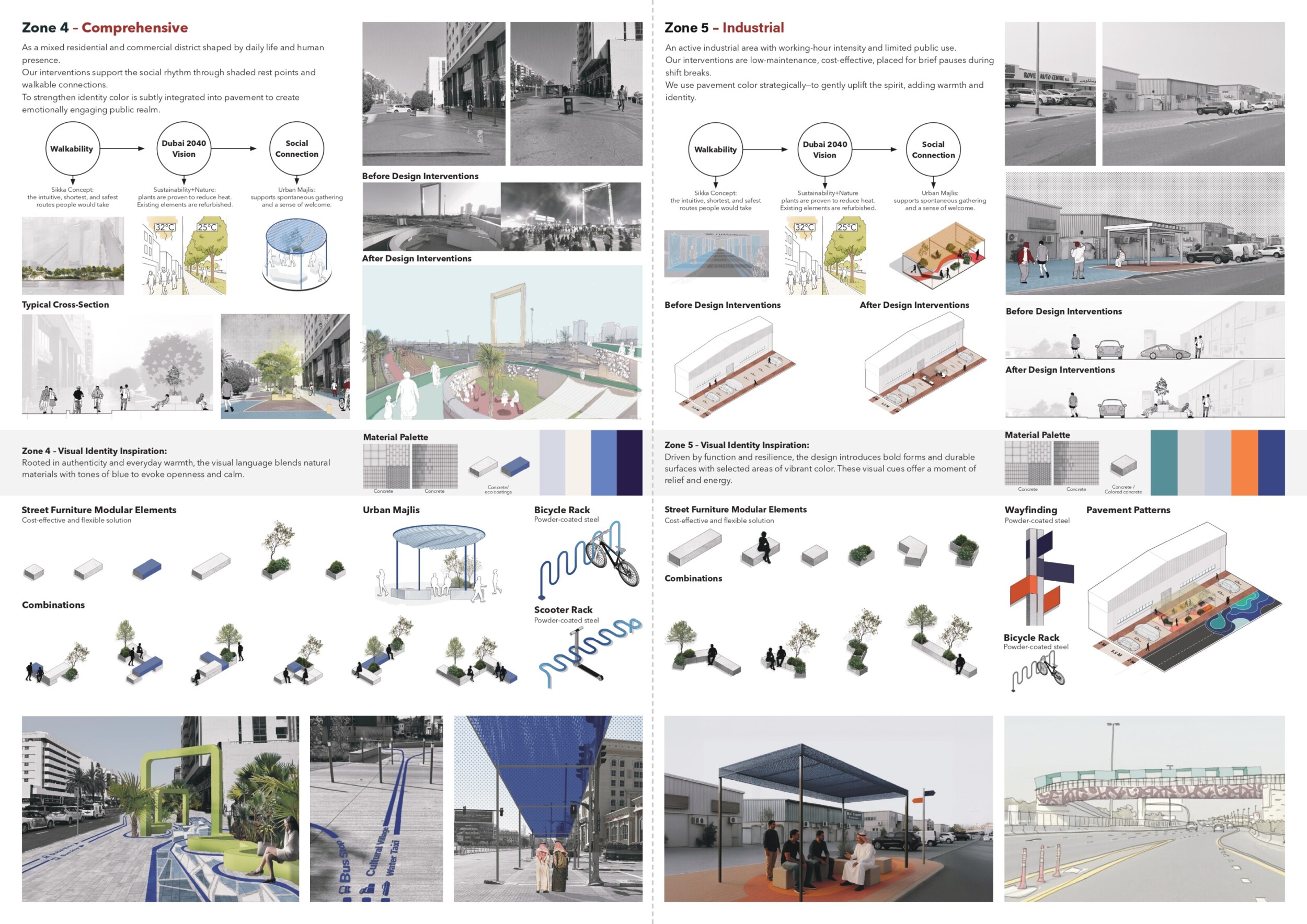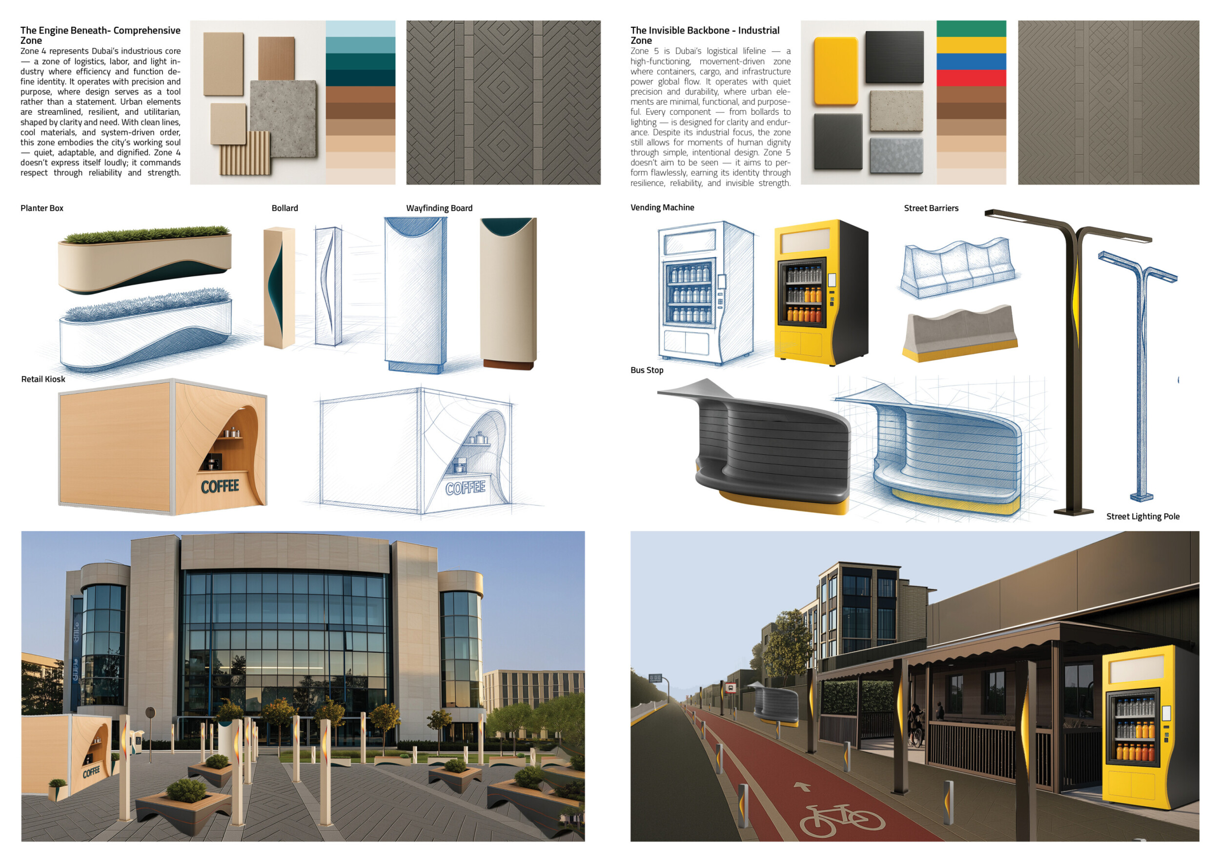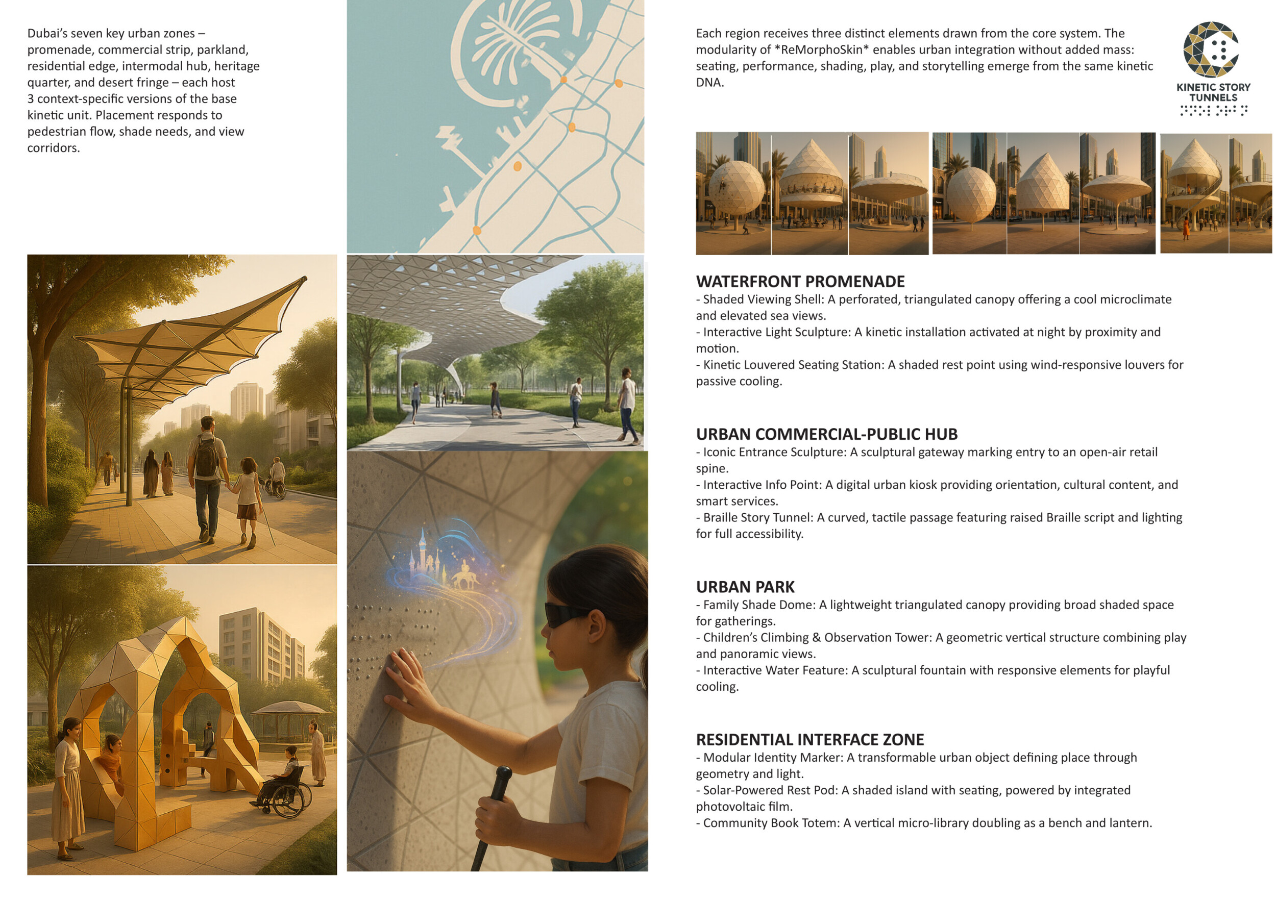 This proposal establishes a cohesive urban design system tailored to Dubai’s diverse zoning contexts, translating each area’s cultural, climatic, and programmatic character into a unified streetscape language. Seven distinct zone typologies—ranging from residential to industrial, heritage, and high-end—are articulated through a matrix of core geometries, modular shading elements, curated material palettes, and contextual wayfinding. Read more Each typology introduces unique visual identifiers: Z1 and Z2 draw on Islamic motifs and neighborhood intimacy, Z3 evokes Bedouin tents and soft landforms, while Z5 and Z7 leverage sharper geometries and premium finishes to express industrial rigor or luxury. The proposal integrates shading, pedestrian bridges, solar infrastructure, and street furniture into cohesive kit-of-parts systems adaptable across road hierarchies and public interfaces. Artistic co-design, climate-responsive strategies, and heritage continuity are embedded throughout, ensuring visual consistency while accommodating Dubai’s rapid growth, diverse urban fabrics, and the need for identity-driven public realm enhancements.