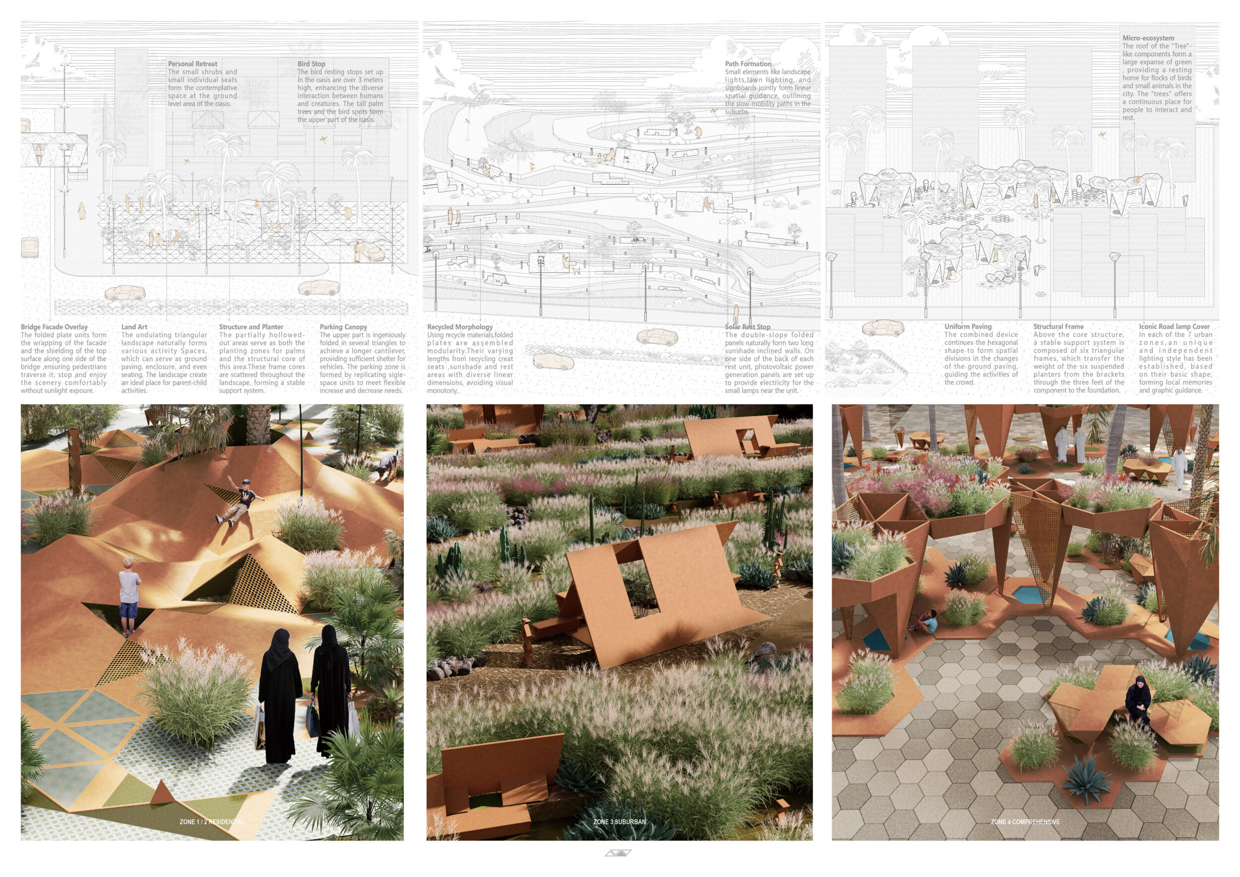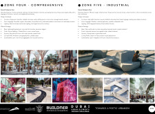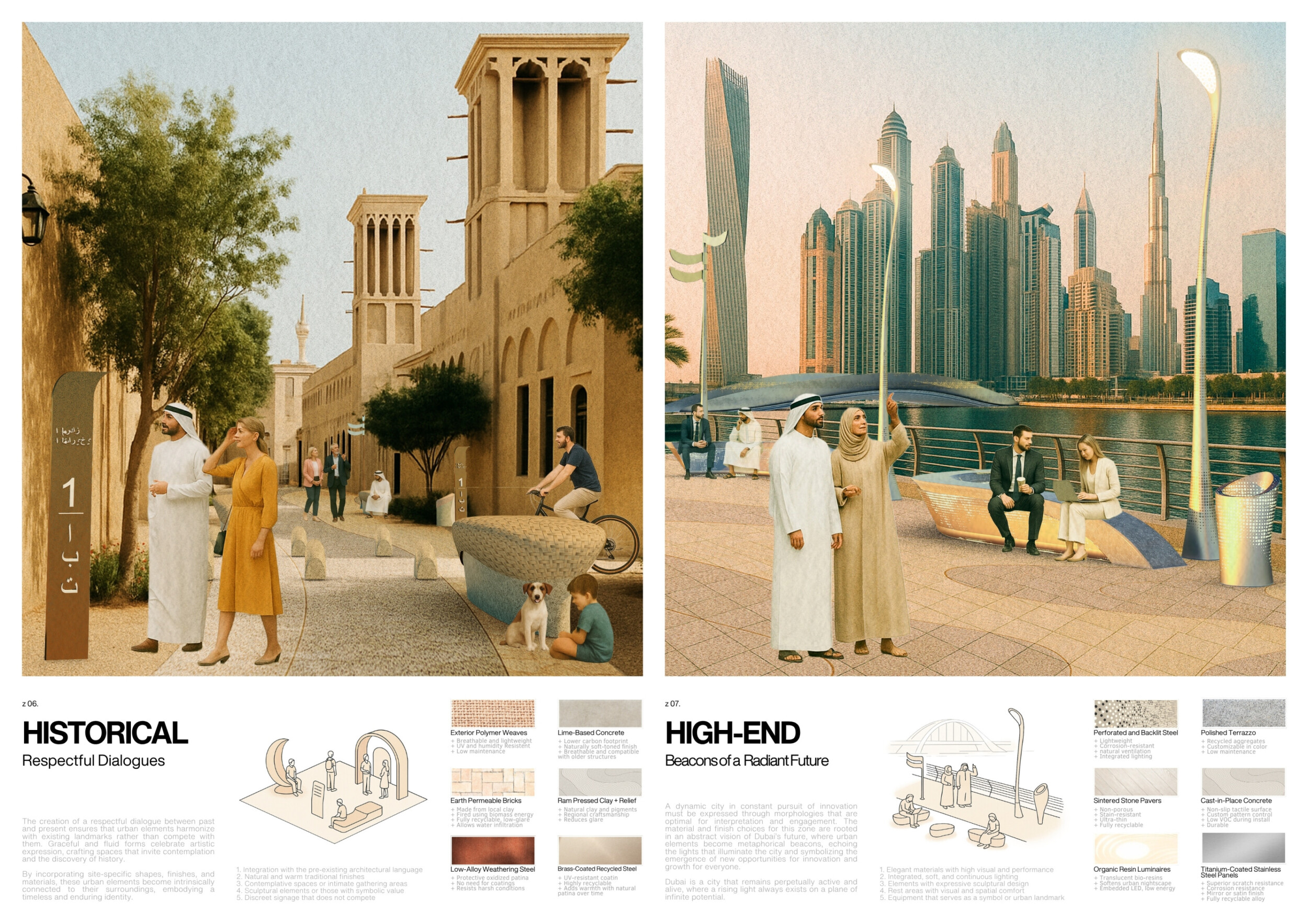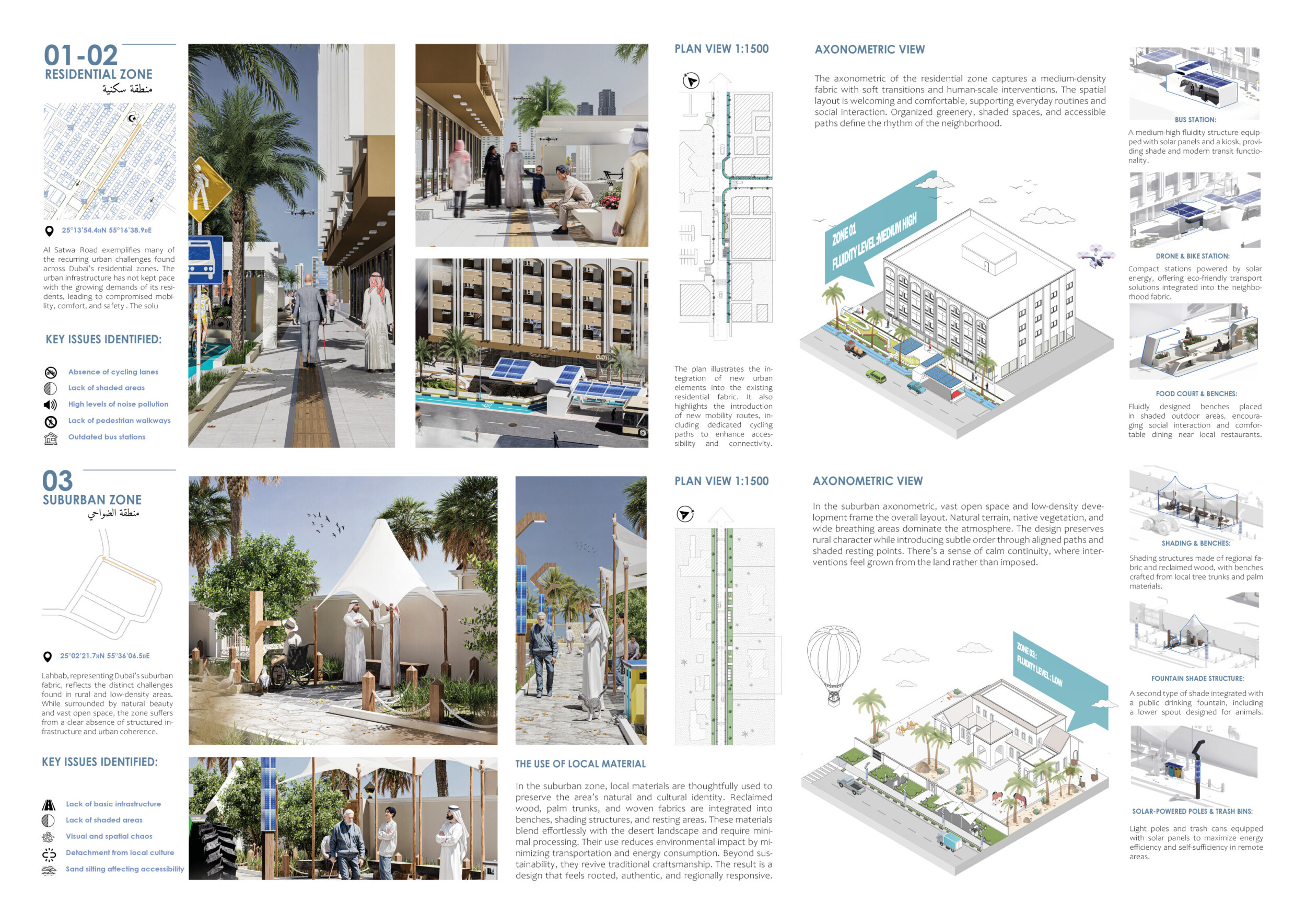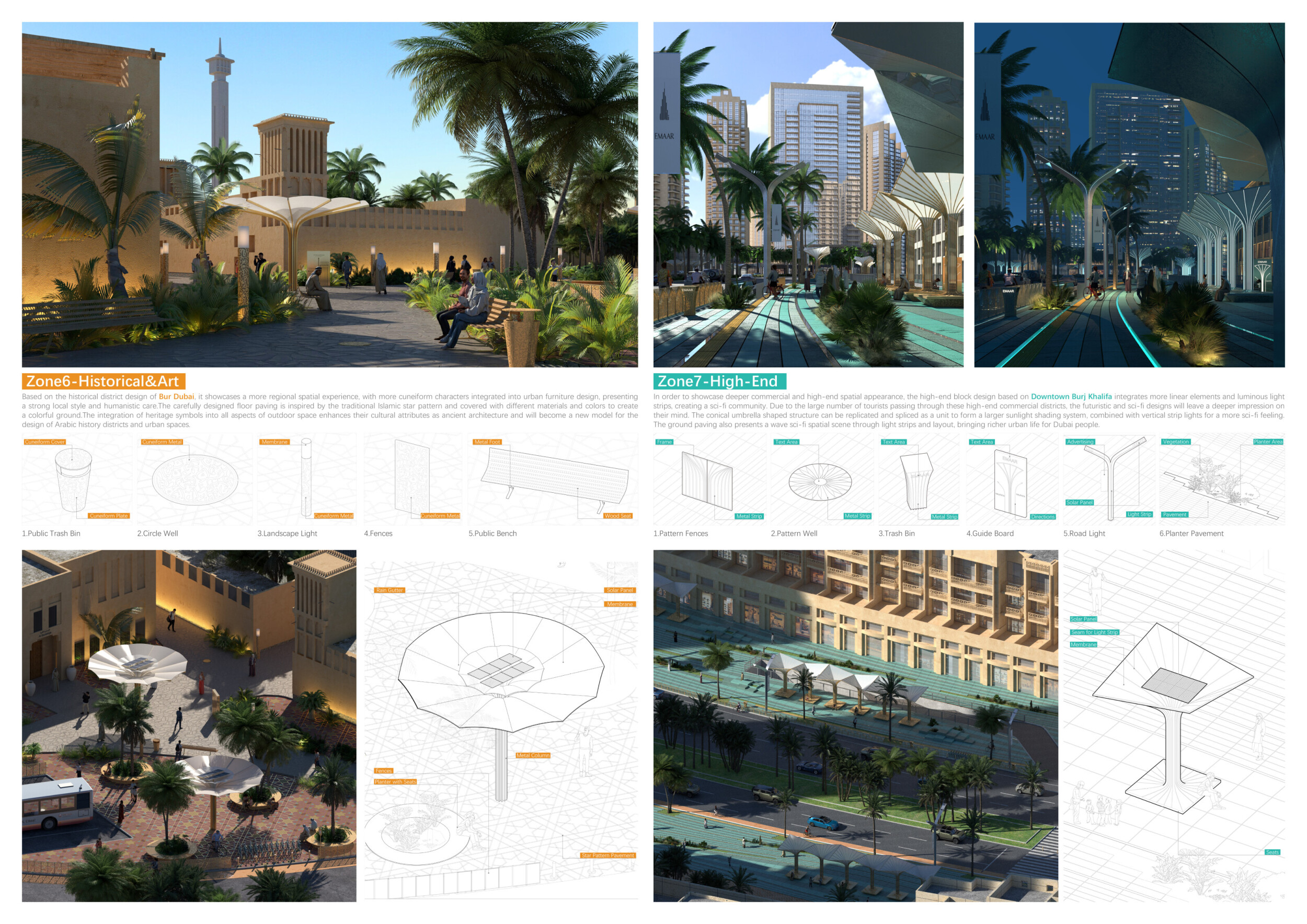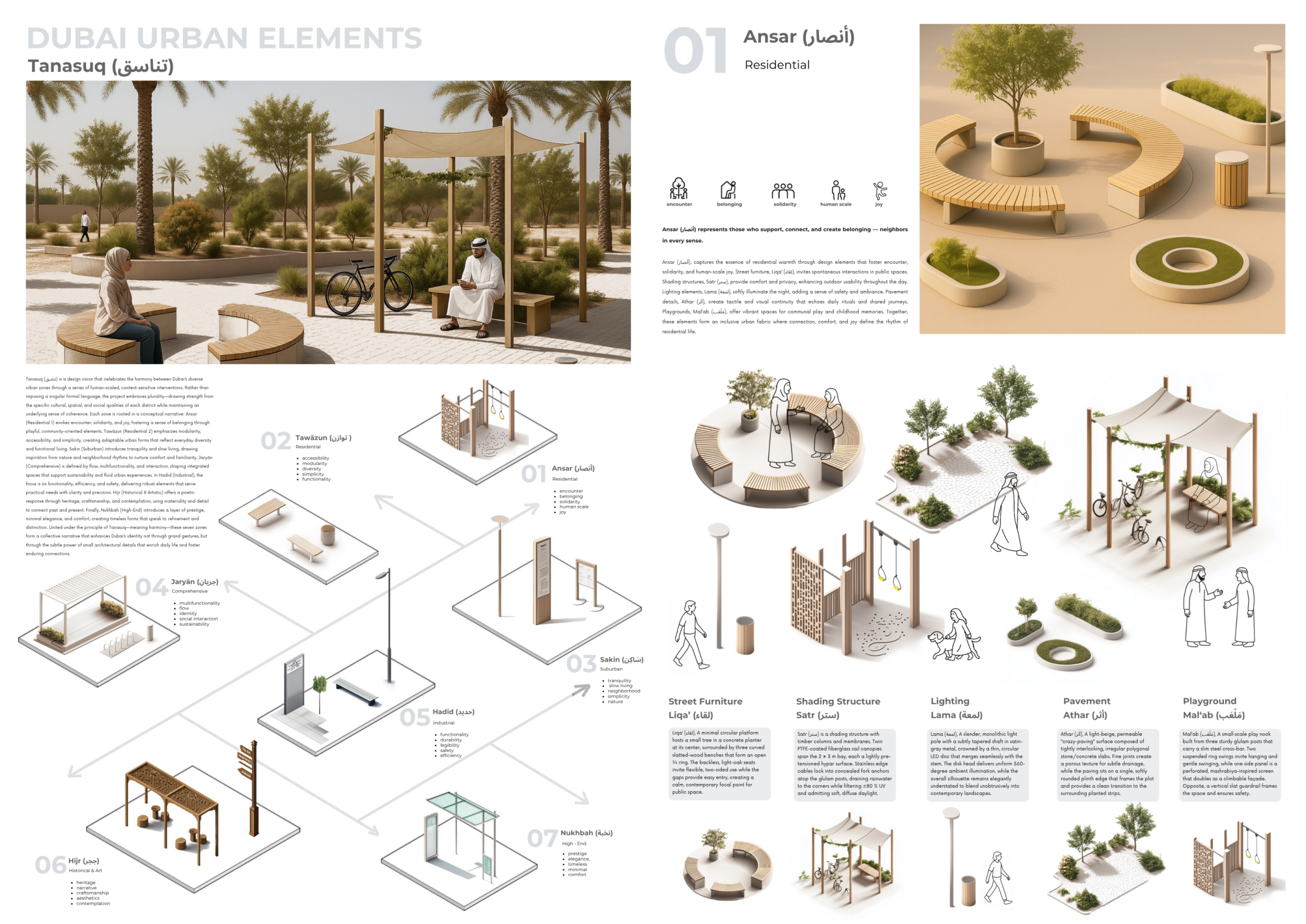 This proposal establishes a cohesive urban design system tailored to Dubai’s diverse zoning contexts, translating each area’s cultural, climatic, and programmatic character into a unified streetscape language. Seven distinct zone typologies—ranging from residential to industrial, heritage, and high-end—are articulated through a matrix of core geometries, modular shading elements, curated material palettes, and contextual wayfinding. Read more Each typology introduces unique visual identifiers: Z1 and Z2 draw on Islamic motifs and neighborhood intimacy, Z3 evokes Bedouin tents and soft landforms, while Z5 and Z7 leverage sharper geometries and premium finishes to express industrial rigor or luxury. The proposal integrates shading, pedestrian bridges, solar infrastructure, and street furniture into cohesive kit-of-parts systems adaptable across road hierarchies and public interfaces. Artistic co-design, climate-responsive strategies, and heritage continuity are embedded throughout, ensuring visual consistency while accommodating Dubai’s rapid growth, diverse urban fabrics, and the need for identity-driven public realm enhancements.