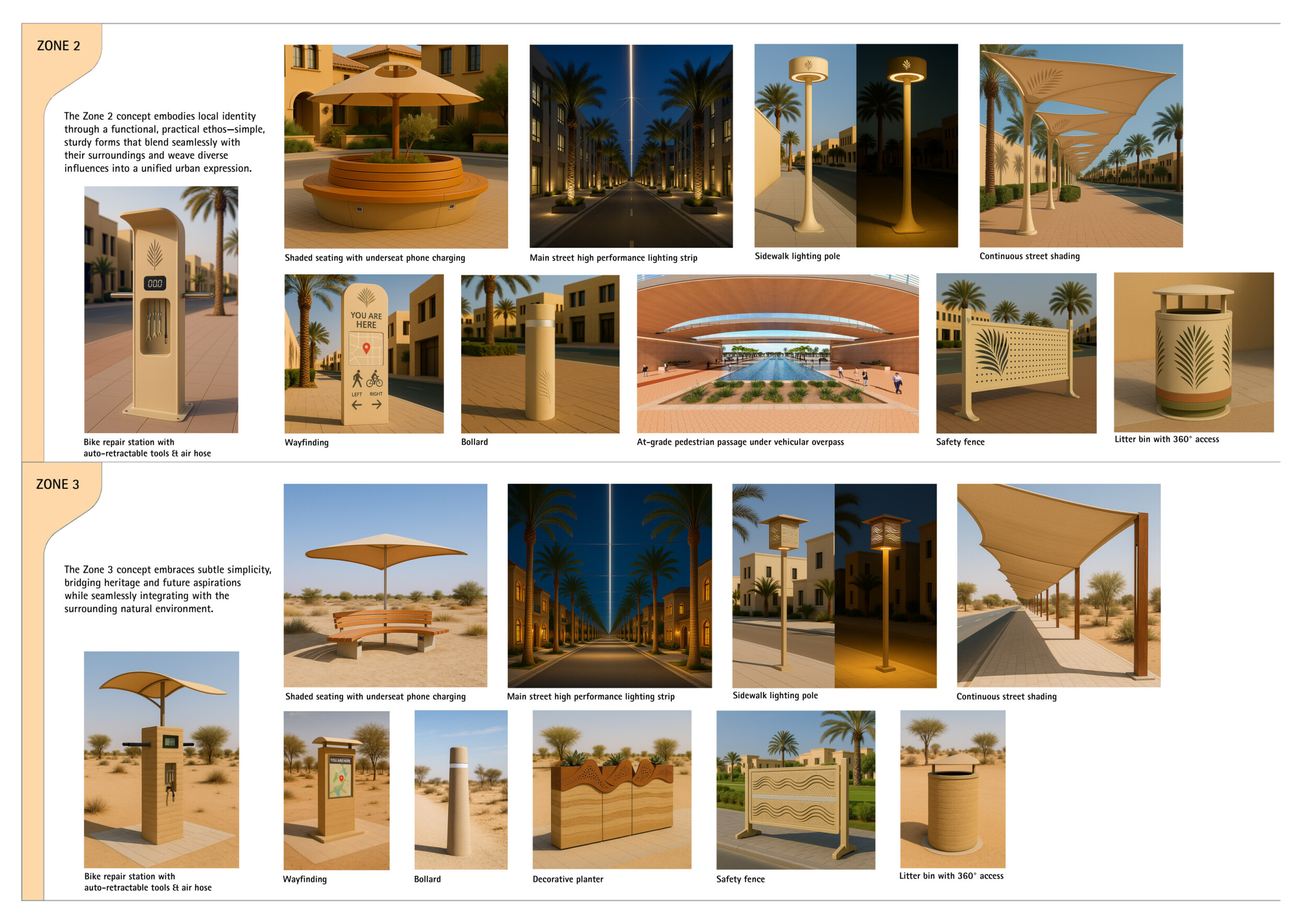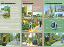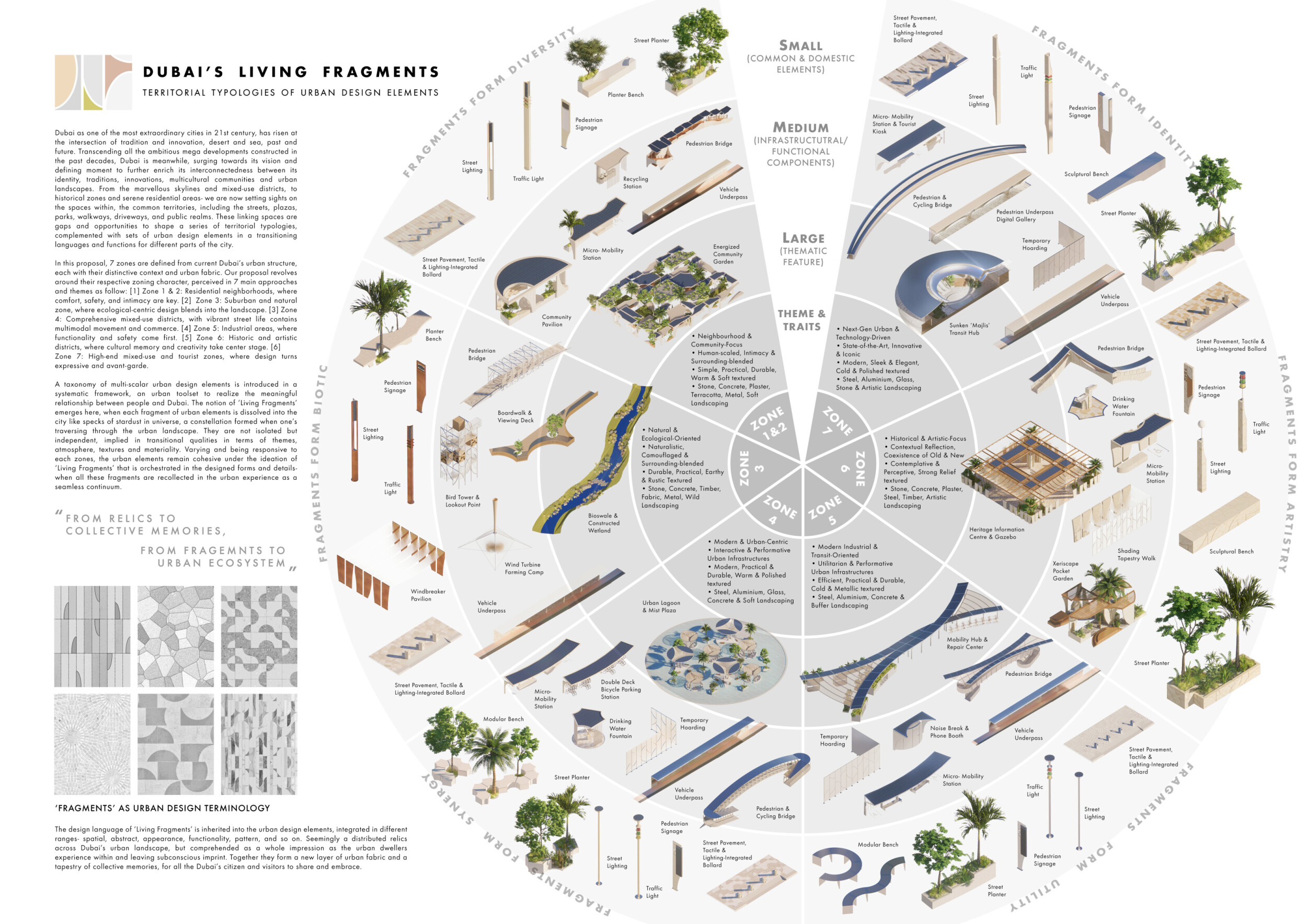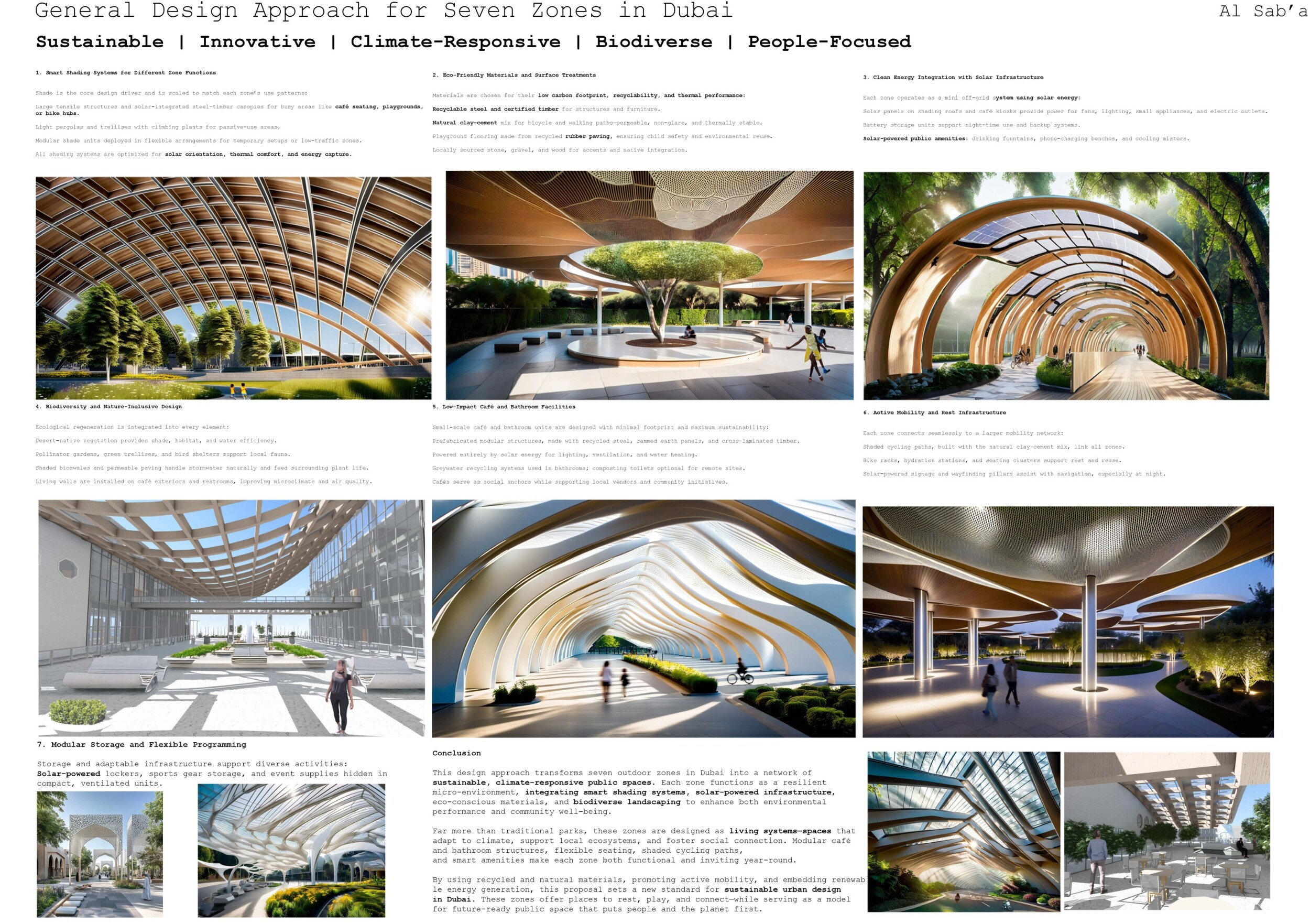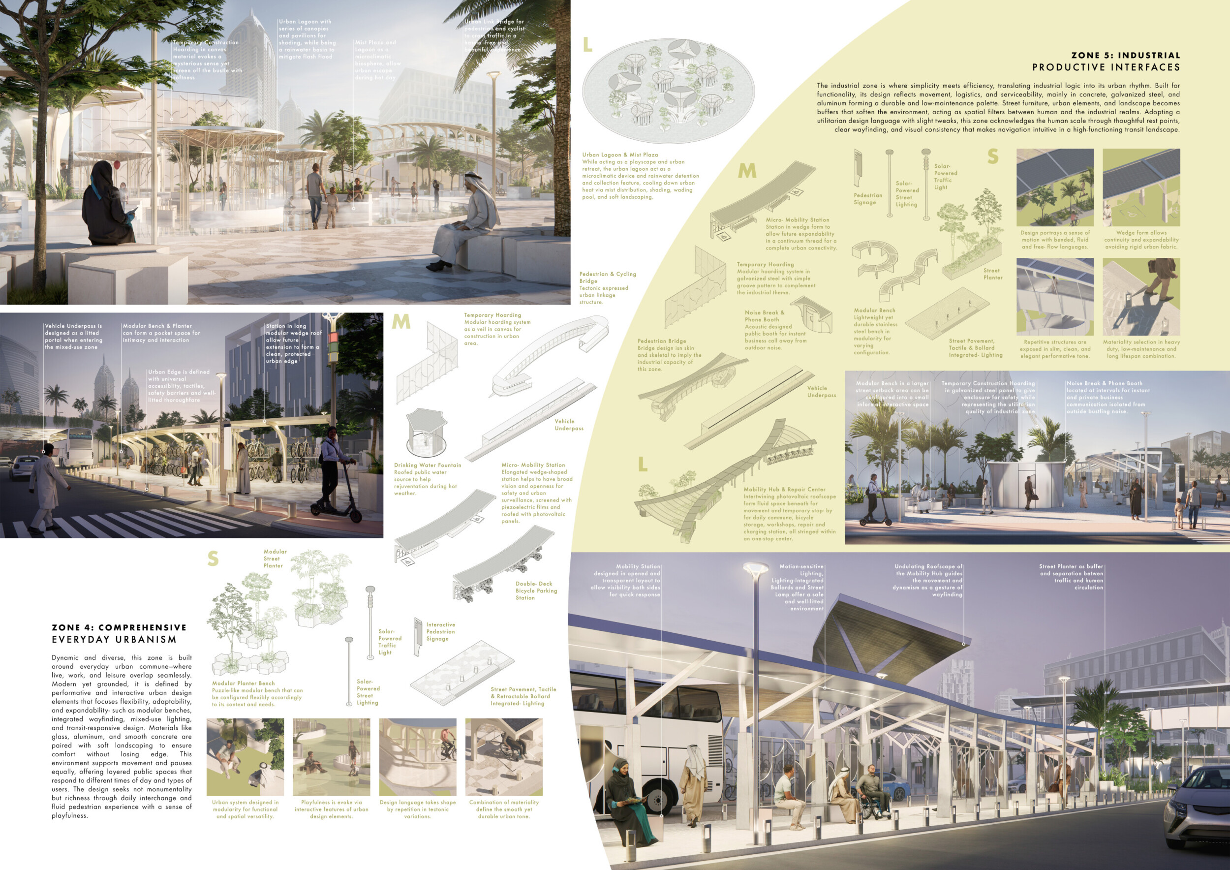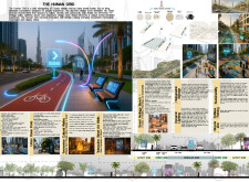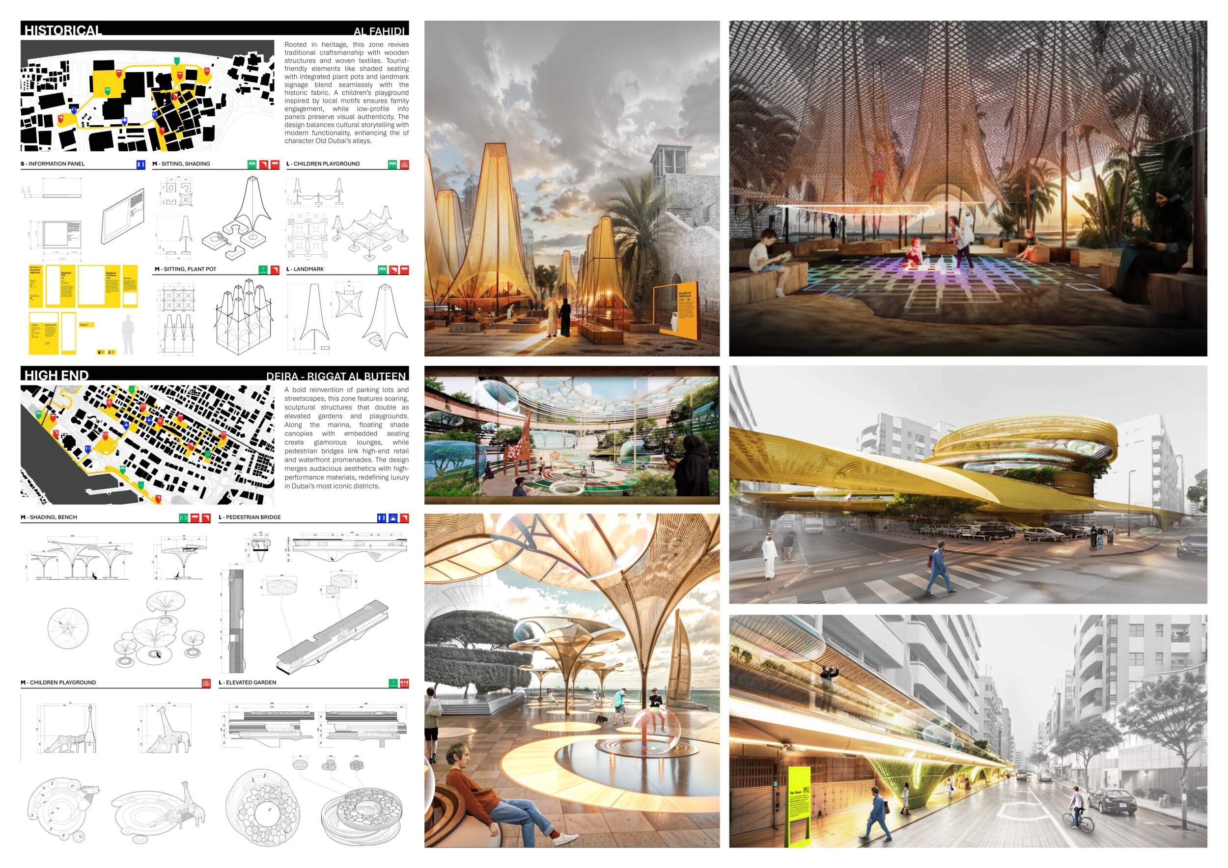 This proposal establishes a cohesive urban design system tailored to Dubai’s diverse zoning contexts, translating each area’s cultural, climatic, and programmatic character into a unified streetscape language. Seven distinct zone typologies—ranging from residential to industrial, heritage, and high-end—are articulated through a matrix of core geometries, modular shading elements, curated material palettes, and contextual wayfinding. Read more Each typology introduces unique visual identifiers: Z1 and Z2 draw on Islamic motifs and neighborhood intimacy, Z3 evokes Bedouin tents and soft landforms, while Z5 and Z7 leverage sharper geometries and premium finishes to express industrial rigor or luxury. The proposal integrates shading, pedestrian bridges, solar infrastructure, and street furniture into cohesive kit-of-parts systems adaptable across road hierarchies and public interfaces. Artistic co-design, climate-responsive strategies, and heritage continuity are embedded throughout, ensuring visual consistency while accommodating Dubai’s rapid growth, diverse urban fabrics, and the need for identity-driven public realm enhancements.