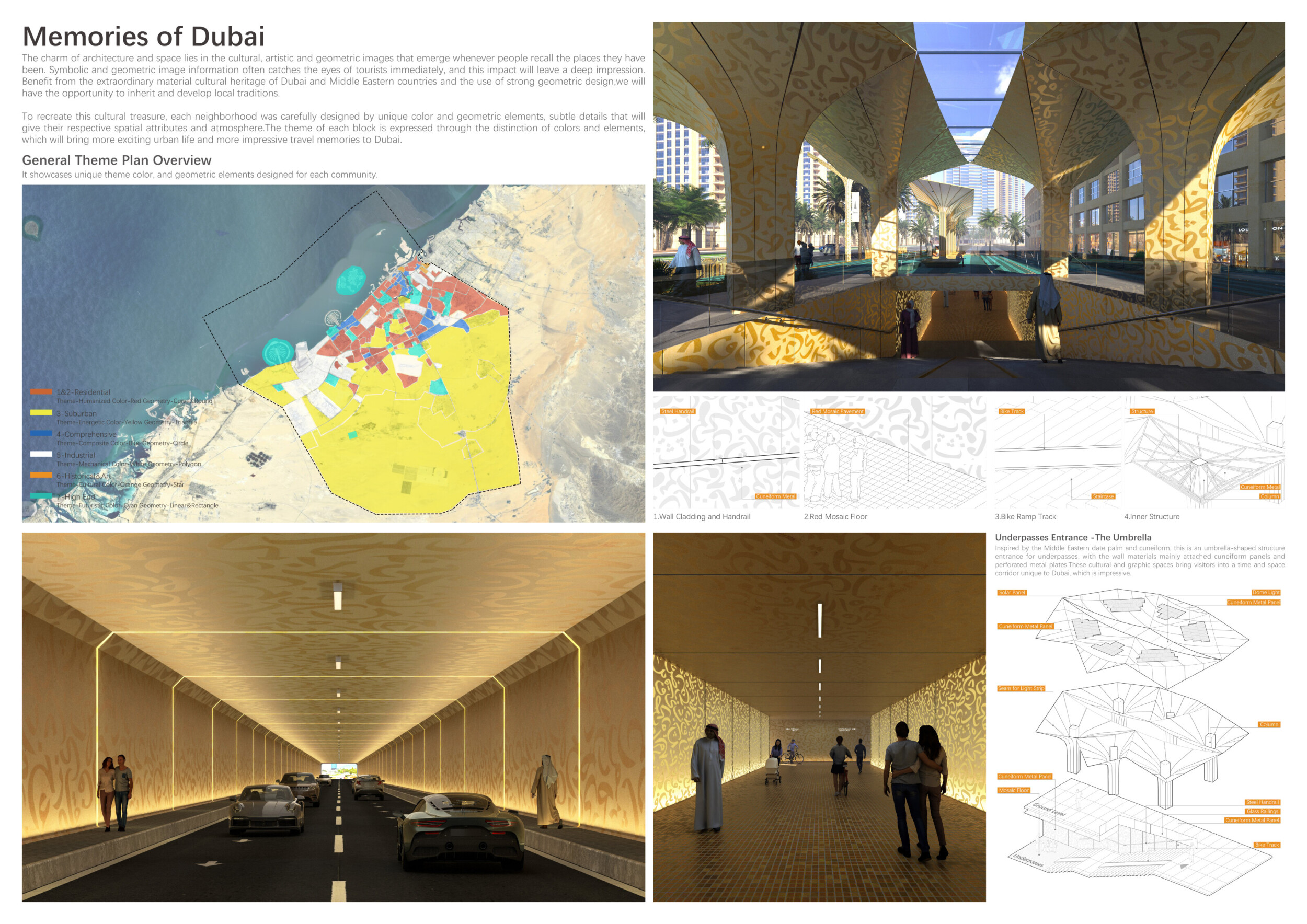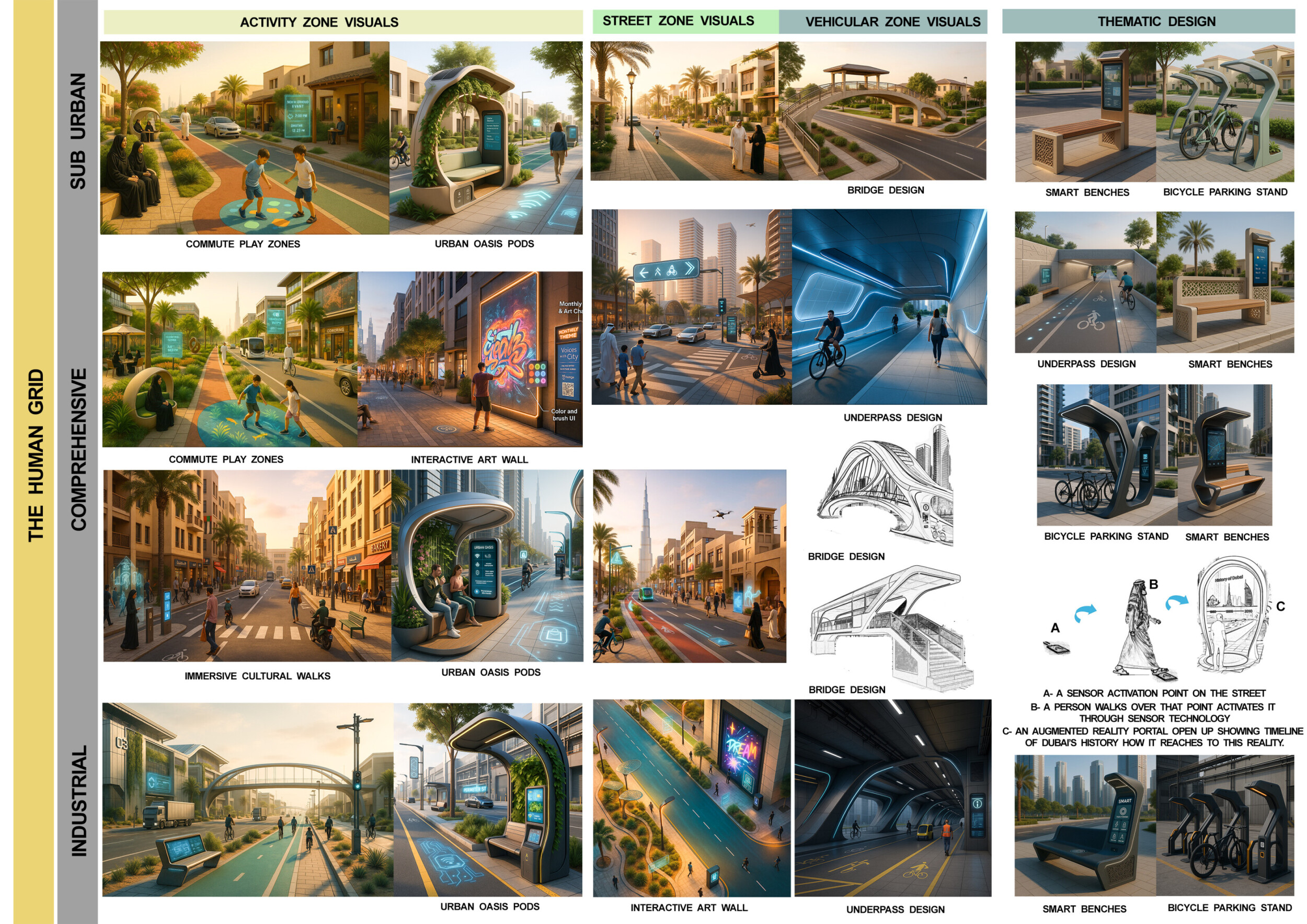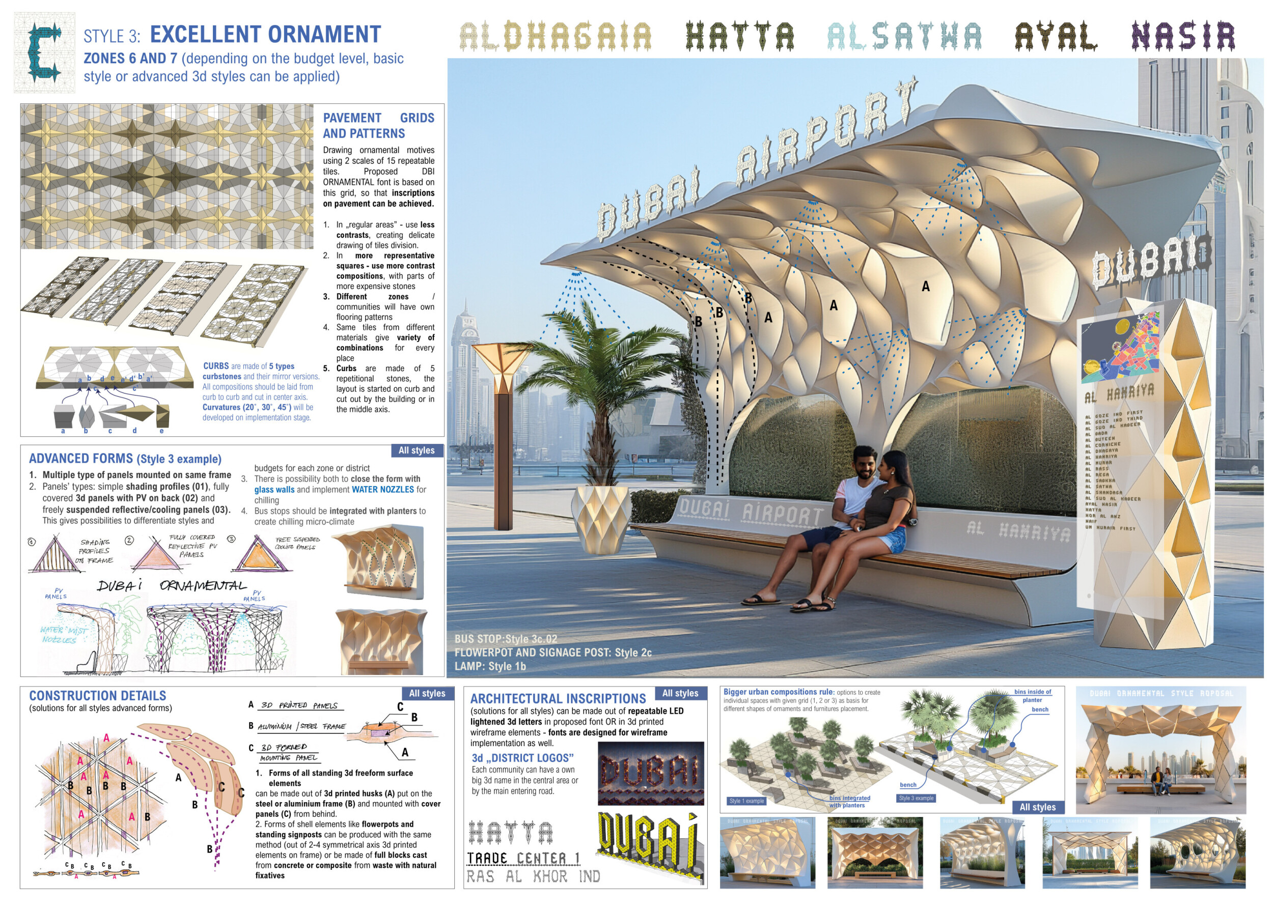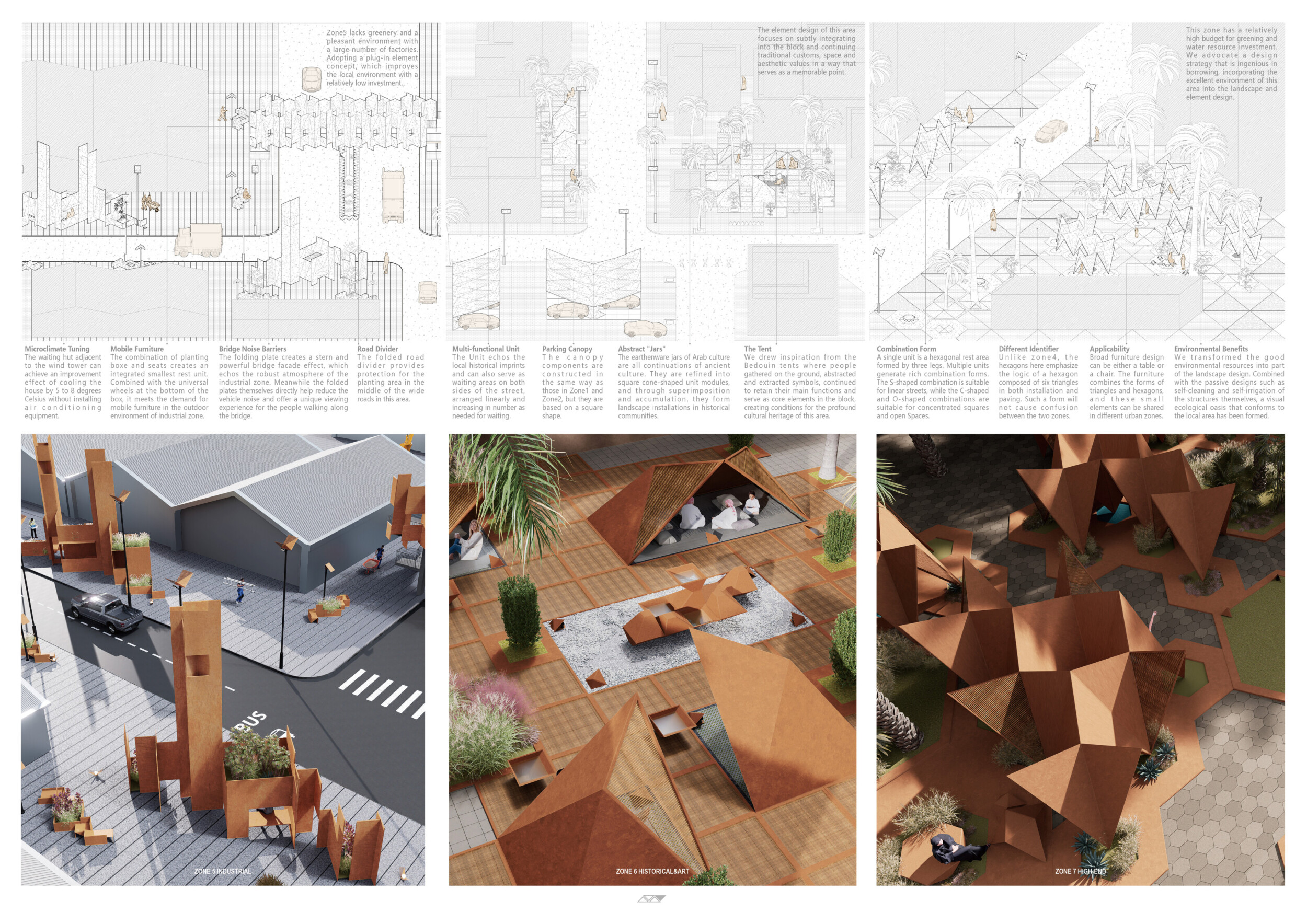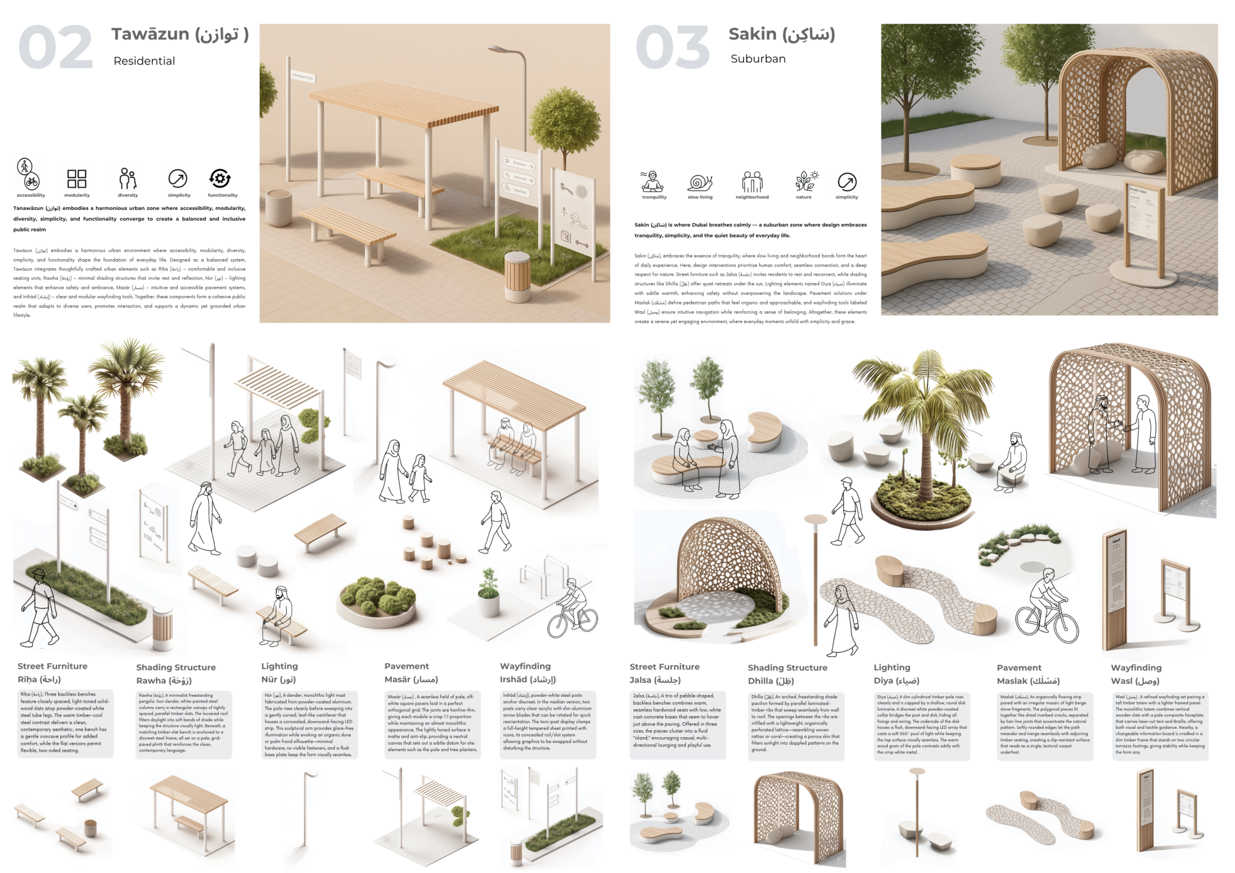 This proposal establishes a cohesive urban design system tailored to Dubai’s diverse zoning contexts, translating each area’s cultural, climatic, and programmatic character into a unified streetscape language. Seven distinct zone typologies—ranging from residential to industrial, heritage, and high-end—are articulated through a matrix of core geometries, modular shading elements, curated material palettes, and contextual wayfinding. Read more Each typology introduces unique visual identifiers: Z1 and Z2 draw on Islamic motifs and neighborhood intimacy, Z3 evokes Bedouin tents and soft landforms, while Z5 and Z7 leverage sharper geometries and premium finishes to express industrial rigor or luxury. The proposal integrates shading, pedestrian bridges, solar infrastructure, and street furniture into cohesive kit-of-parts systems adaptable across road hierarchies and public interfaces. Artistic co-design, climate-responsive strategies, and heritage continuity are embedded throughout, ensuring visual consistency while accommodating Dubai’s rapid growth, diverse urban fabrics, and the need for identity-driven public realm enhancements.