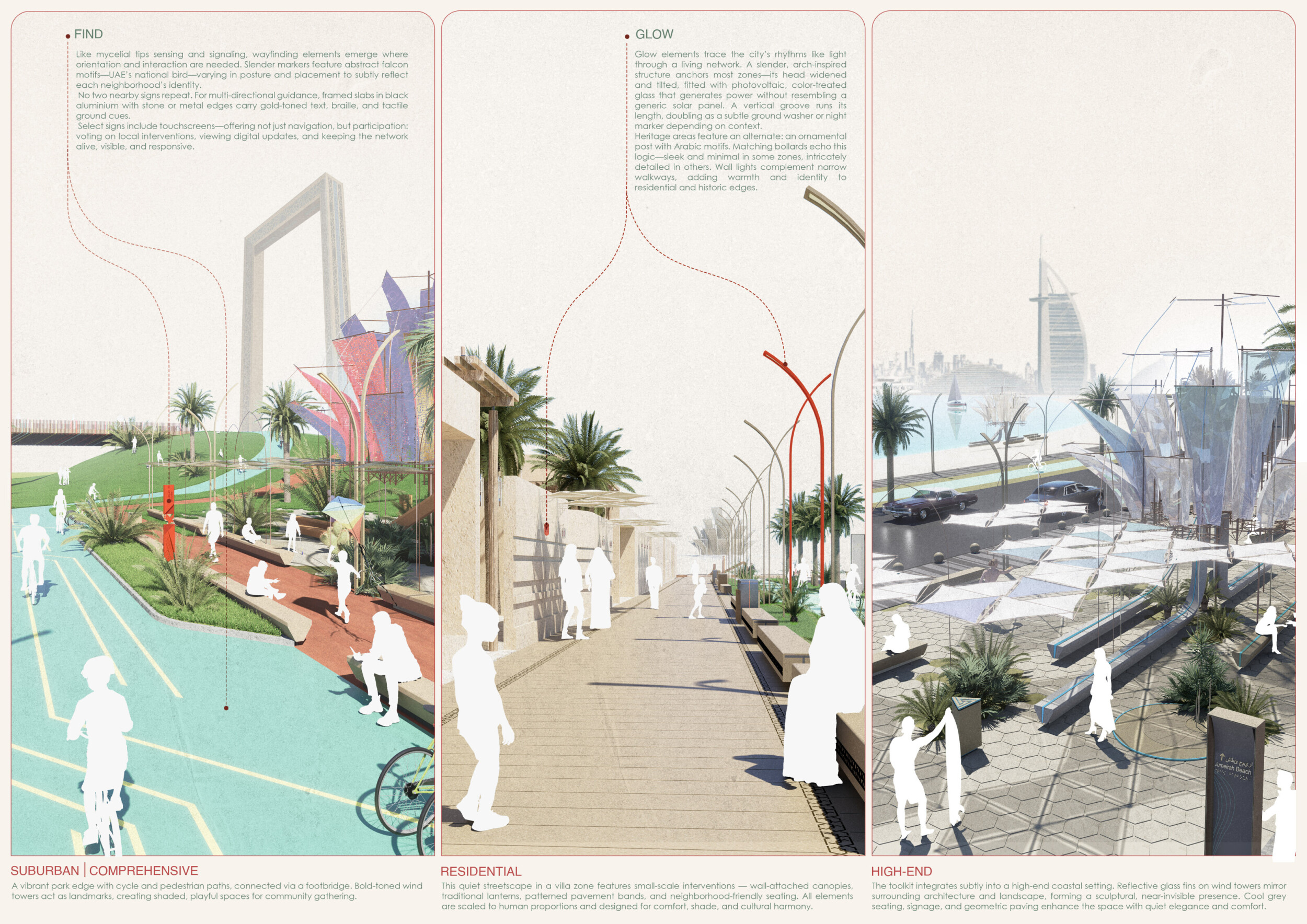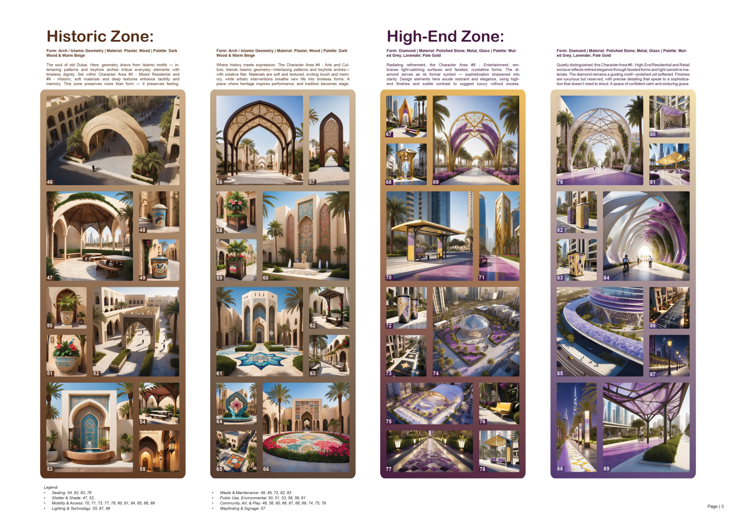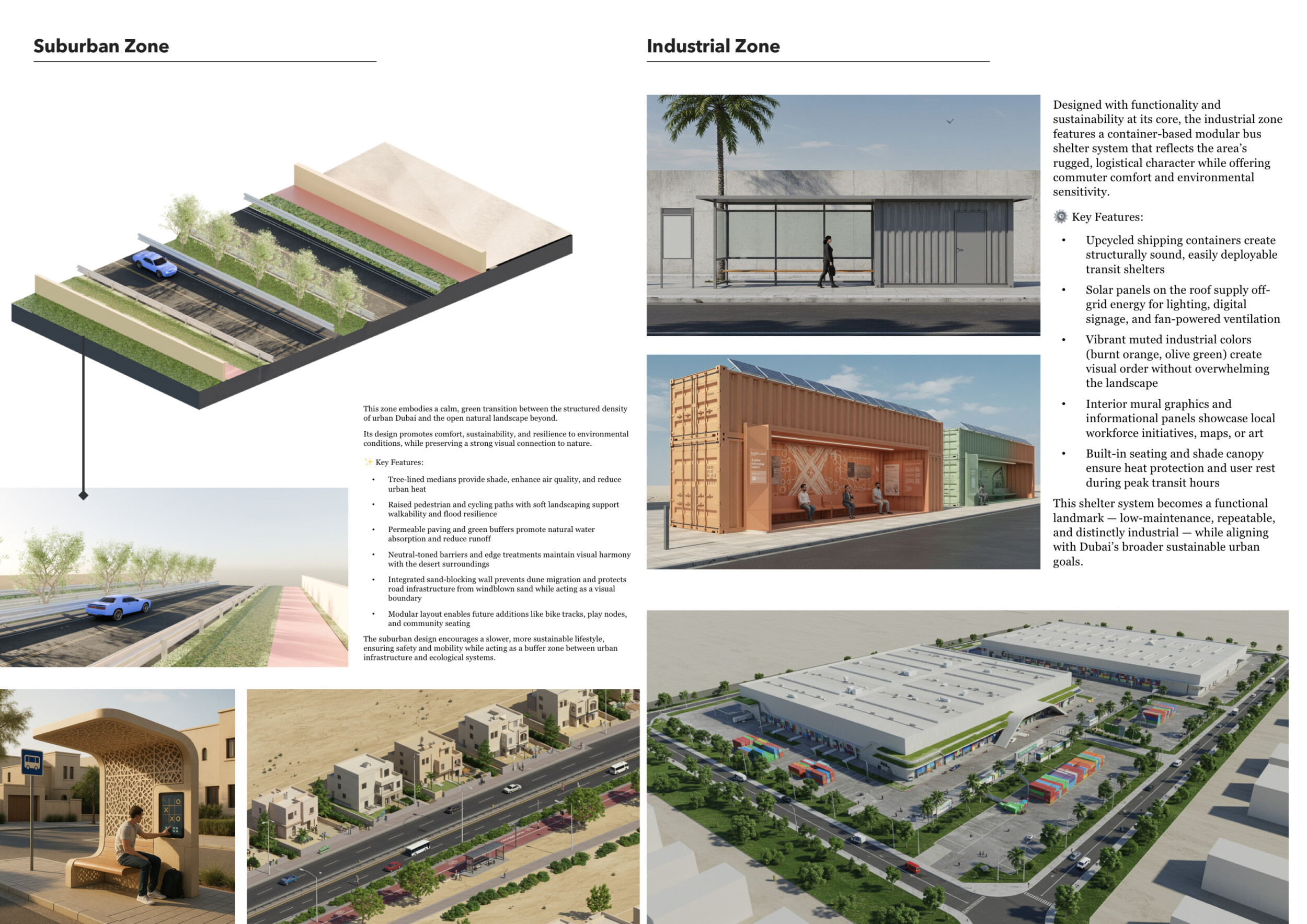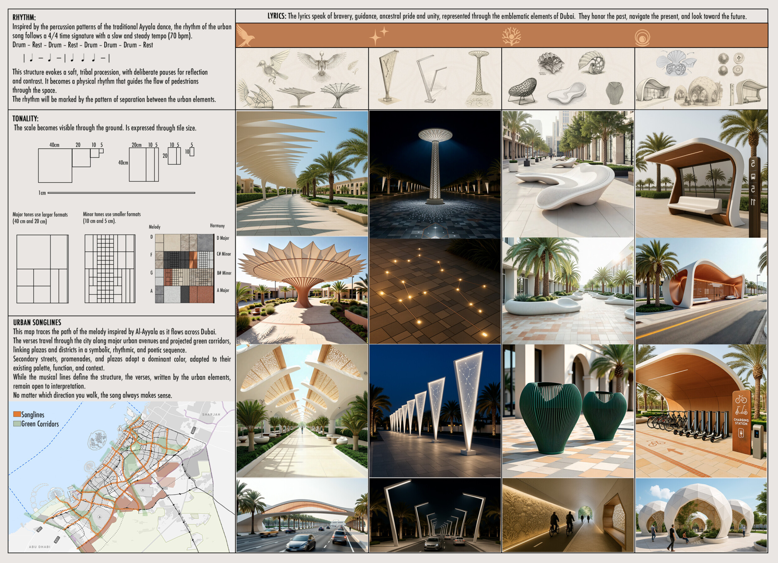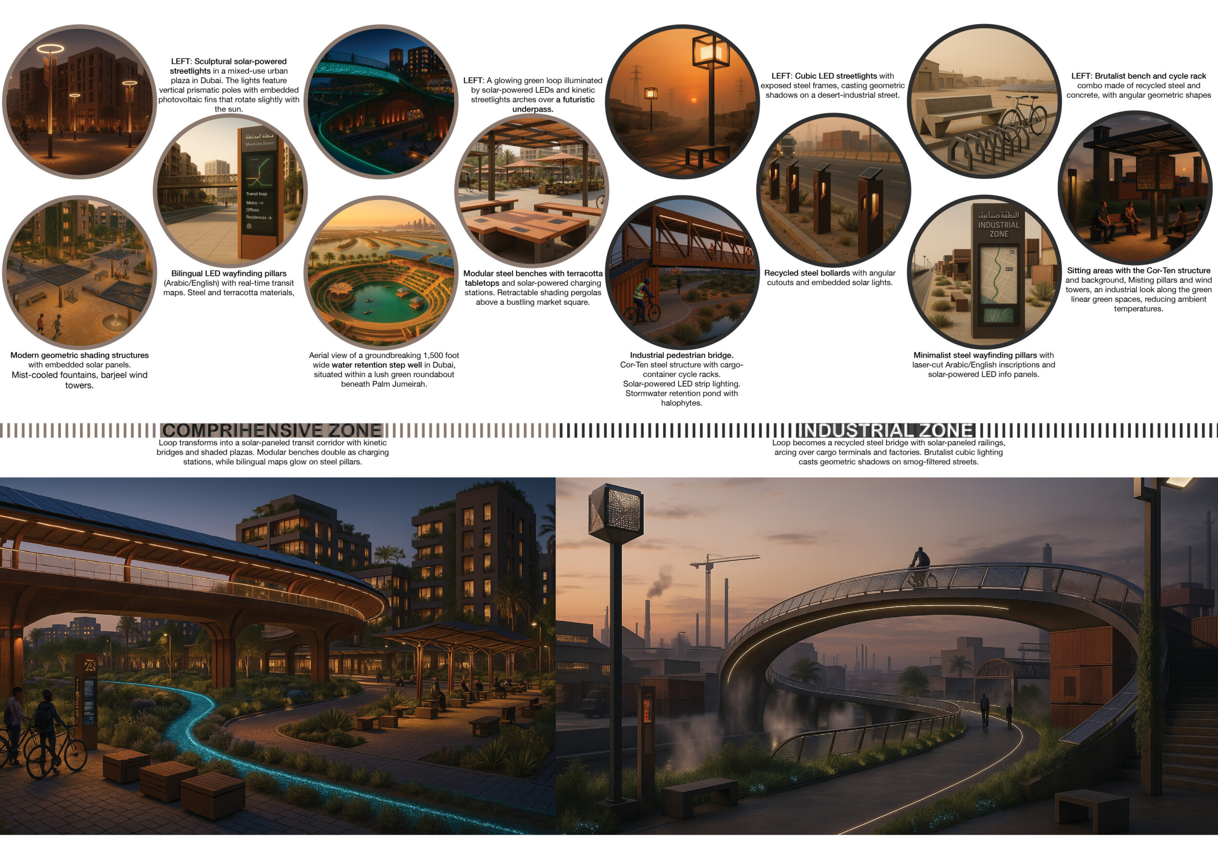 This proposal establishes a cohesive urban design system tailored to Dubai’s diverse zoning contexts, translating each area’s cultural, climatic, and programmatic character into a unified streetscape language. Seven distinct zone typologies—ranging from residential to industrial, heritage, and high-end—are articulated through a matrix of core geometries, modular shading elements, curated material palettes, and contextual wayfinding. Read more Each typology introduces unique visual identifiers: Z1 and Z2 draw on Islamic motifs and neighborhood intimacy, Z3 evokes Bedouin tents and soft landforms, while Z5 and Z7 leverage sharper geometries and premium finishes to express industrial rigor or luxury. The proposal integrates shading, pedestrian bridges, solar infrastructure, and street furniture into cohesive kit-of-parts systems adaptable across road hierarchies and public interfaces. Artistic co-design, climate-responsive strategies, and heritage continuity are embedded throughout, ensuring visual consistency while accommodating Dubai’s rapid growth, diverse urban fabrics, and the need for identity-driven public realm enhancements.